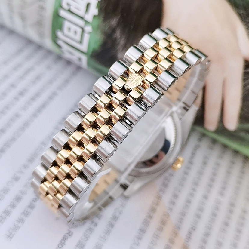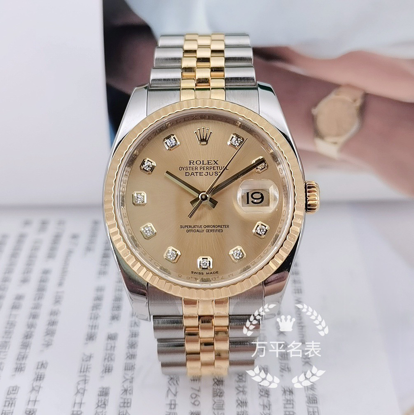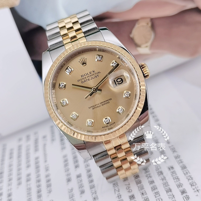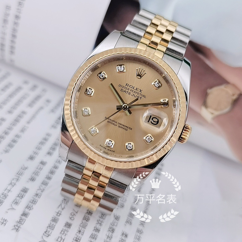 不锈钢/18k黄金材质表带、精钢表壳、黄金表圈搭配自动机械机芯,36mm香槟金色圆形表盘饰有钻石时标、日历显示和金色指针,折叠表扣方便佩戴,现好价