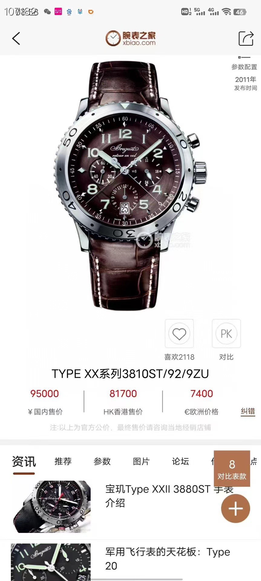 宝玑TYPE XX-XXI-XXII系列3810ST/92/9ZU 表径42mm 自动机械 精钢材质 防水深度100米 折叠扣 日期显示 计时 飞返 逆跳 工价95000 现好价
