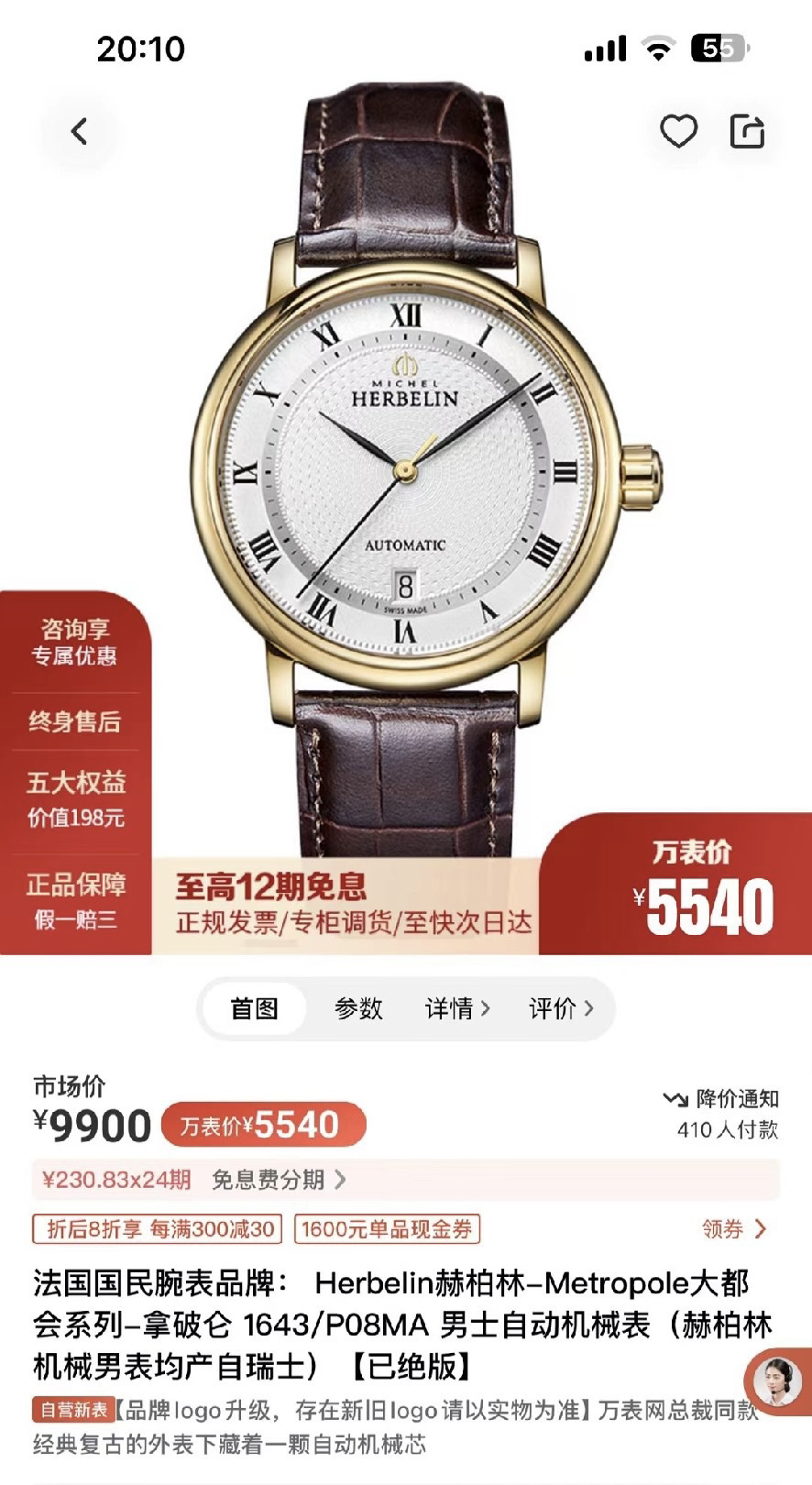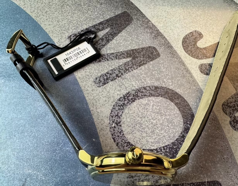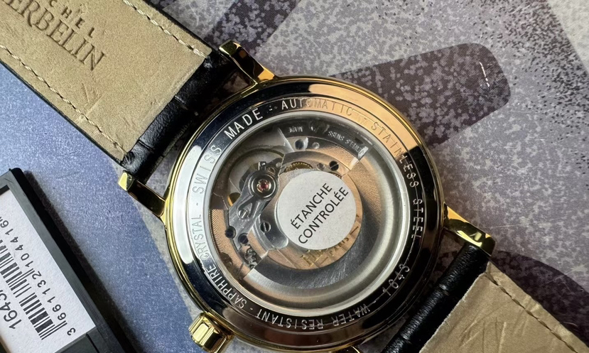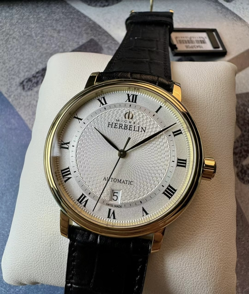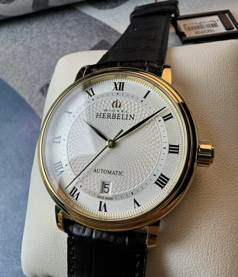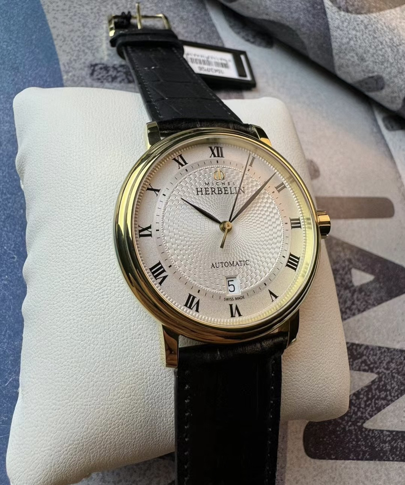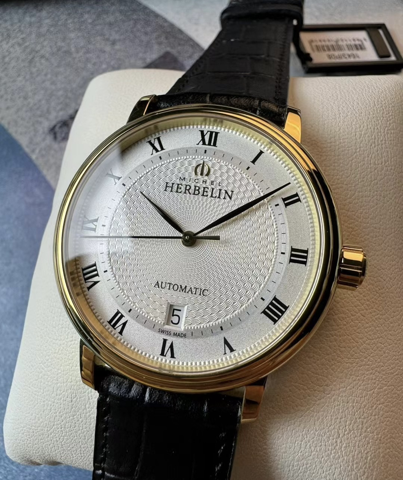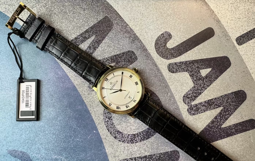 赫柏林大都会拿破仑机械腕表,表径39毫米,厚10毫米,复古表款设计,PVD镀金工艺,欧式圆舞曲风格融入大气简约的表盘设计,提升气 质品位,流露高雅时尚之感。平面蓝宝石镜面,白色表盘穿插细腻格纹,黑色罗马文刻度,黑色柳叶形指针,6点日历,推拉式表冠,搭载精磨eta2824-2机芯,未使用单表存放展示痕迹