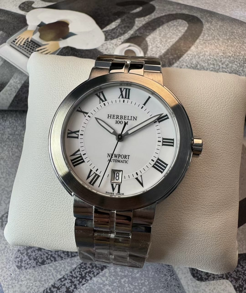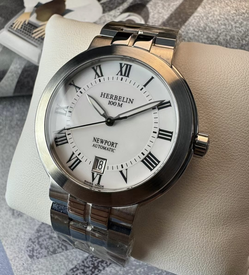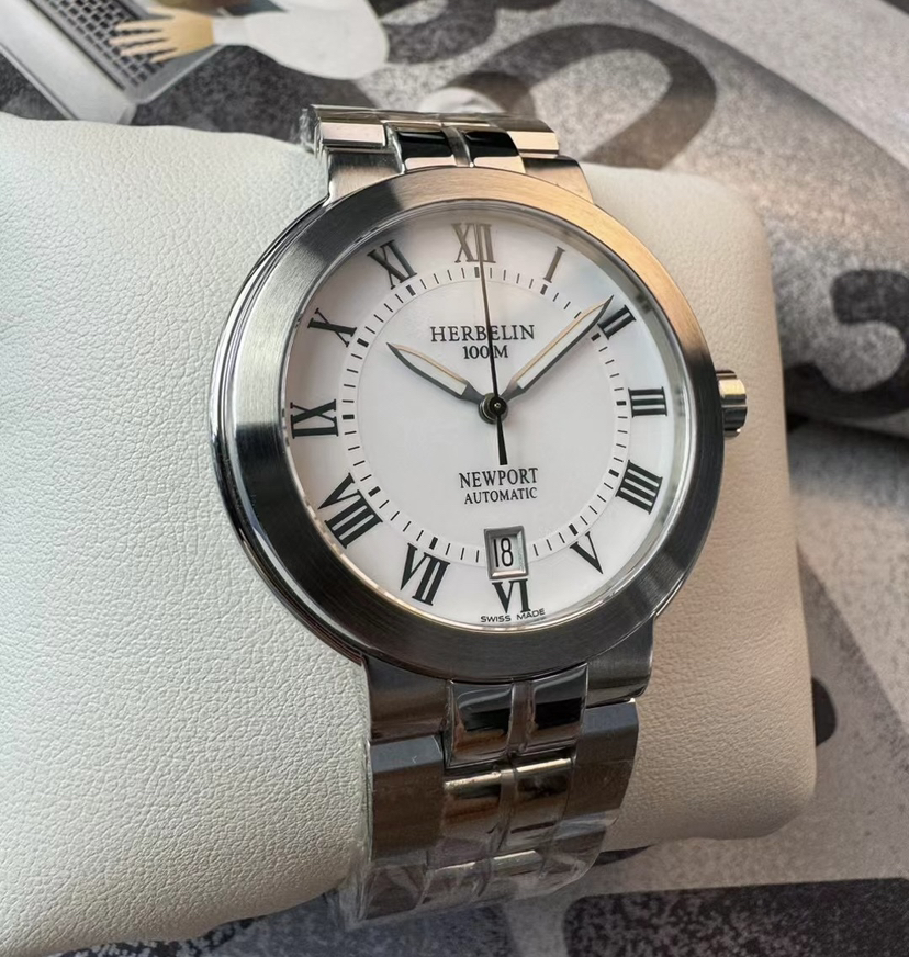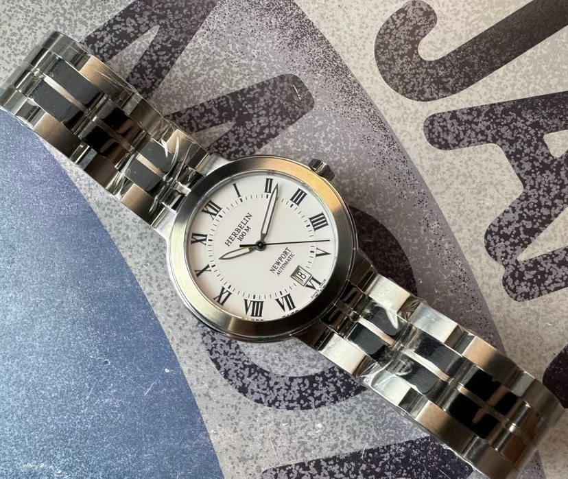 赫柏林纽波特游艇俱乐部机械腕表,表径40毫米,厚10毫米,平面蓝宝石镜面,瓷白色盘面,黑色罗马文刻度,柳叶形指针,黑色秒针,6点日历,推拉式表冠,防水100米,搭载精磨eta2824-2机芯,未使用单表