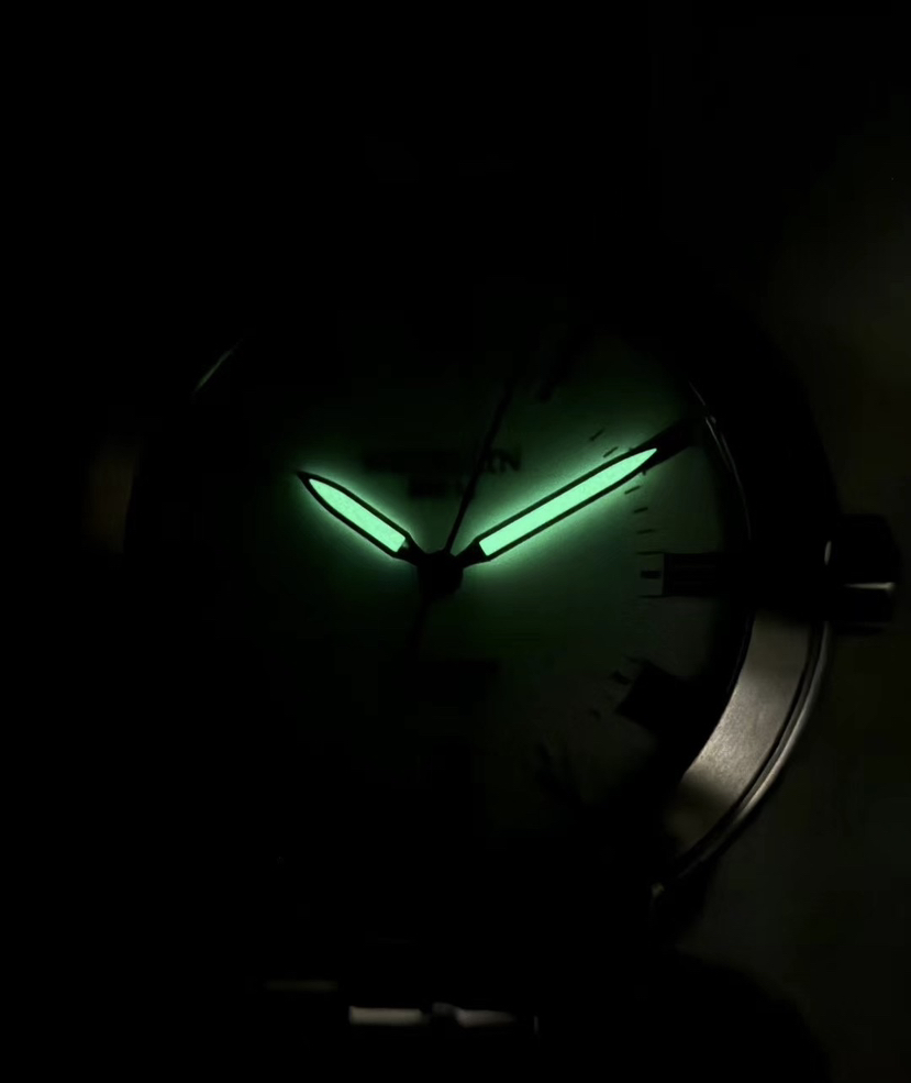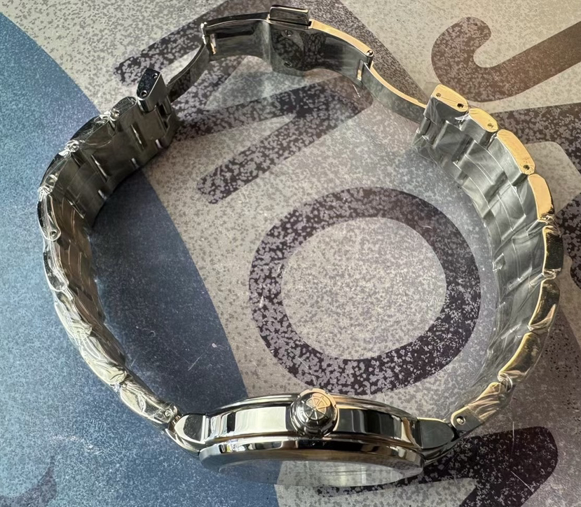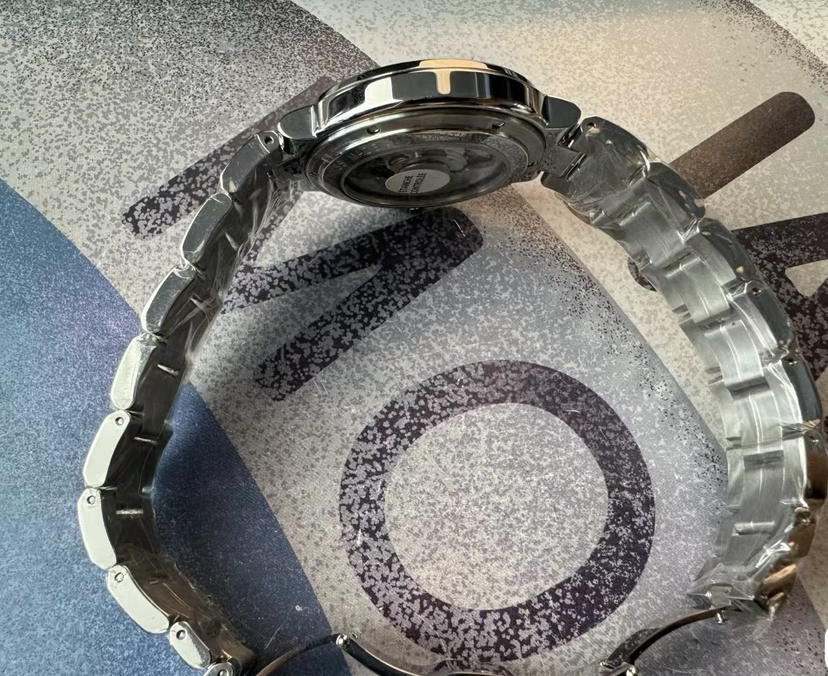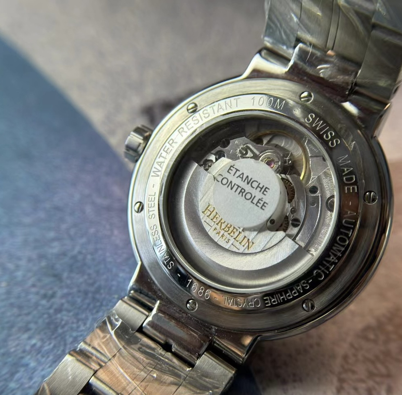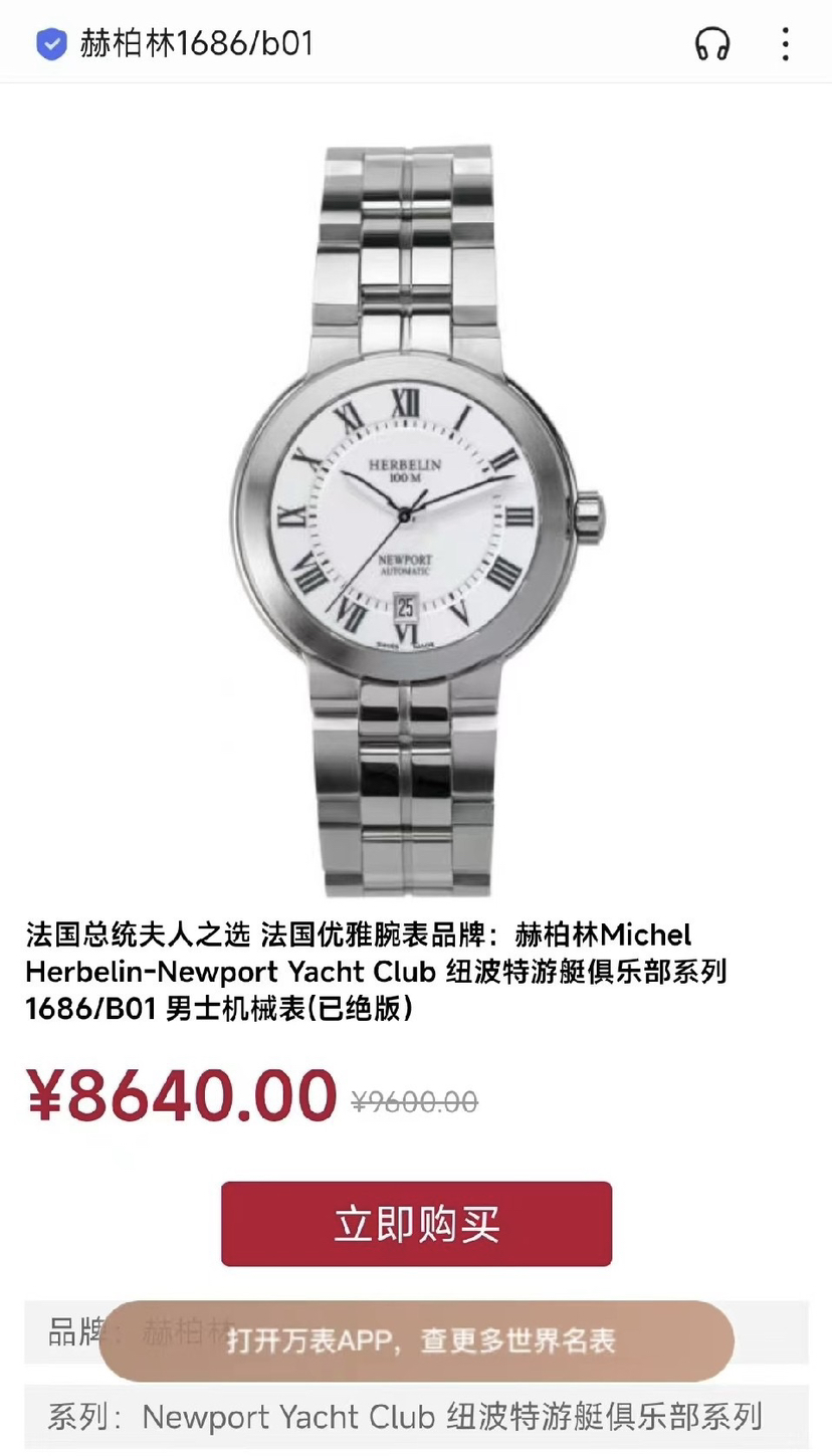赫柏林纽波特游艇俱乐部机械腕表,表径40毫米,厚10毫米,平面蓝宝石镜面,瓷白色盘面,黑色罗马文刻度,柳叶形指针,黑色秒针,6点日历,推拉式表冠,防水100米,搭载精磨eta2824-2机芯,未使用单表
