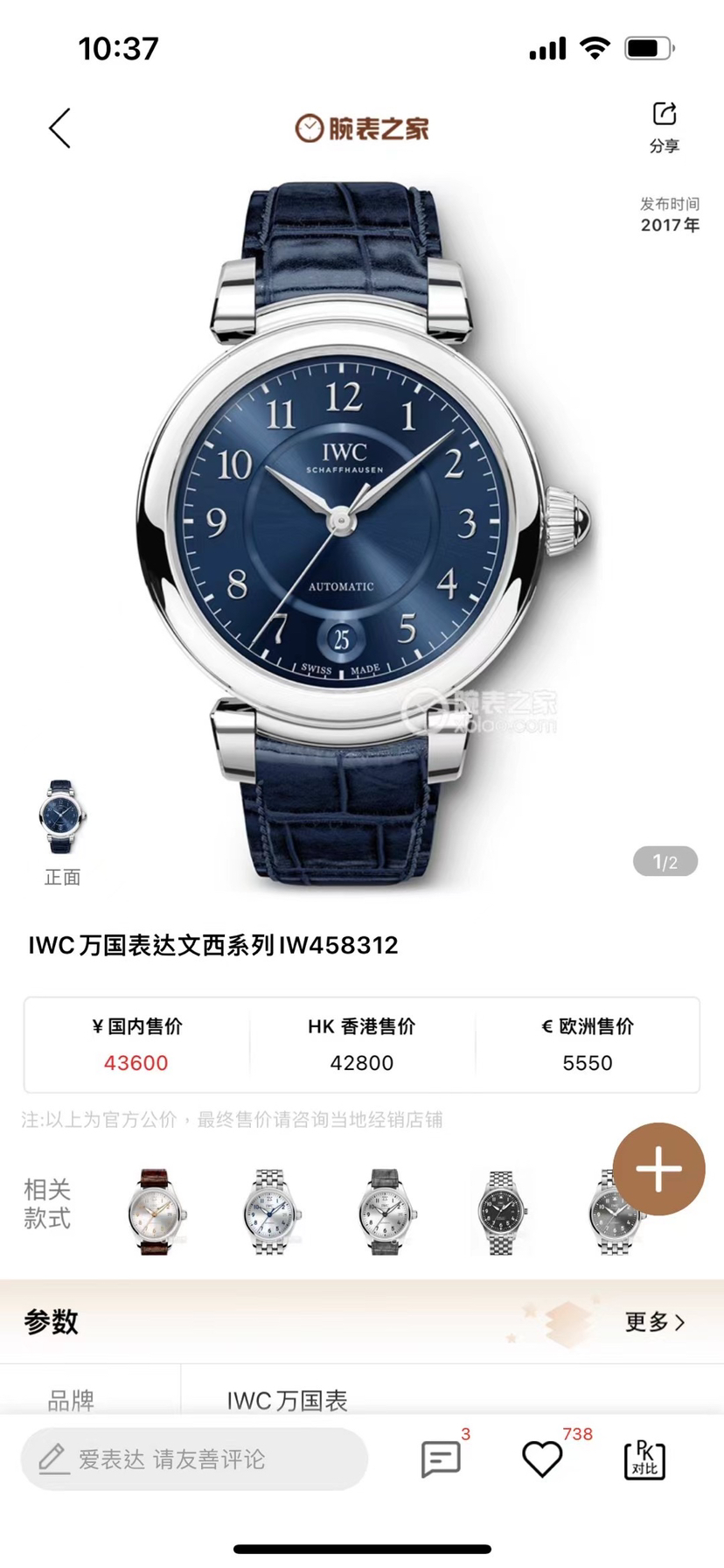 IWC万国表达文西系列IW458312腕表,中性款 自动机械,表径36mm,精钢材质,蓝色盘,日期显示,单表98新,官价43600