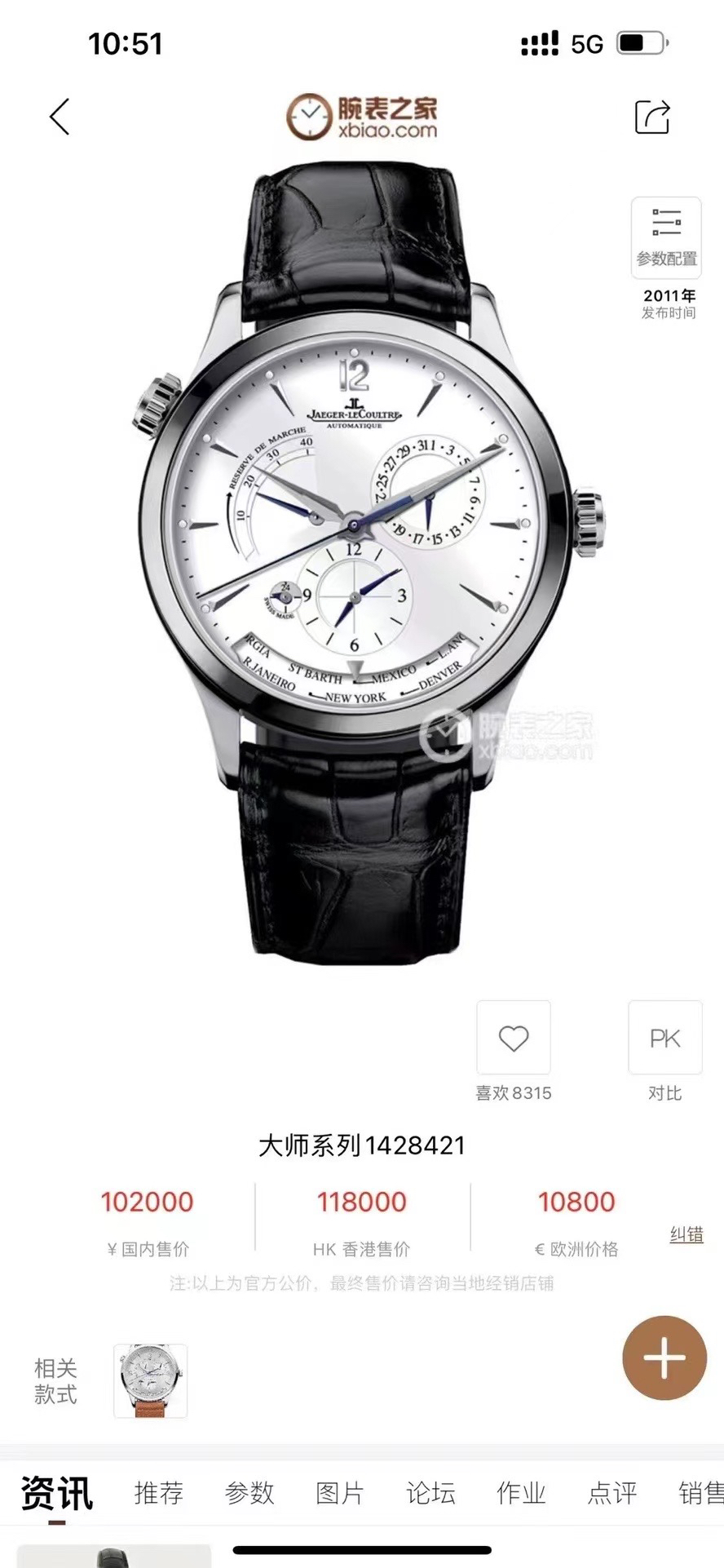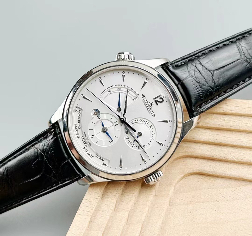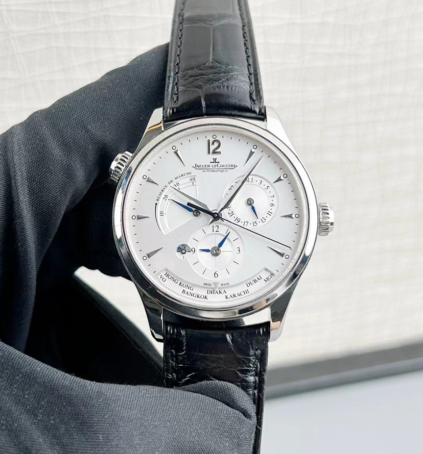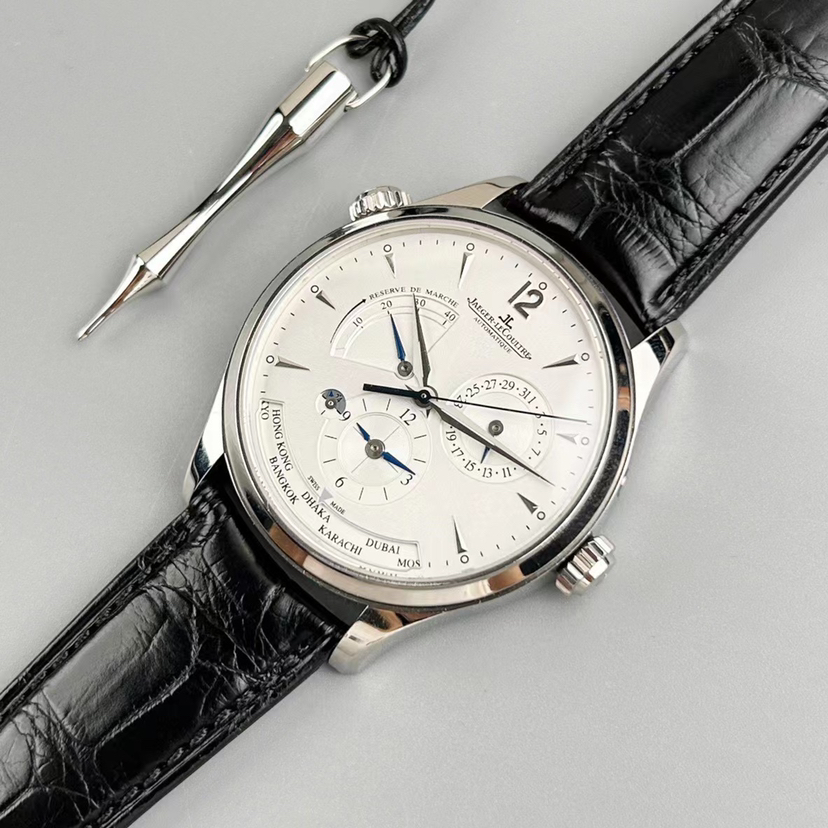 积家Q1428421 - Master 大师系列"地理学家"腕表,表径39毫米,搭载自产Cal.939自动机械机芯,34钻,陶瓷滚珠,蓝钢螺丝,螺钉摆轮,k金镂空自动陀,积家1000小时认证,公价102000