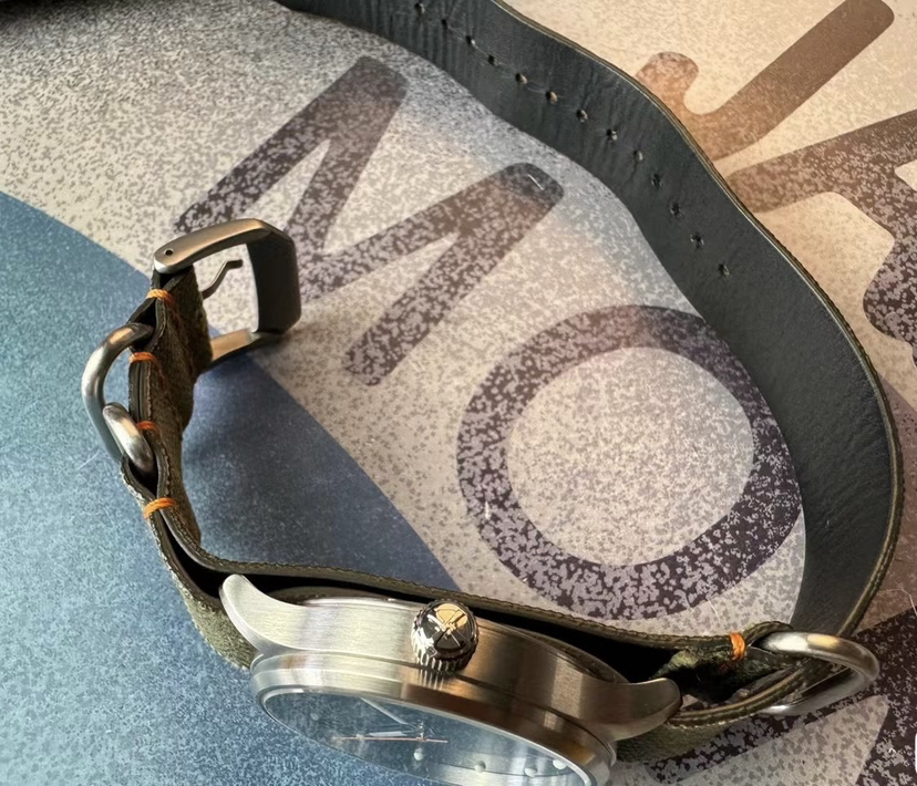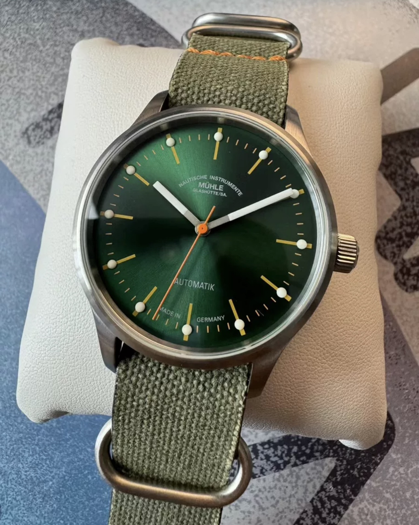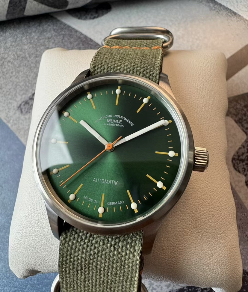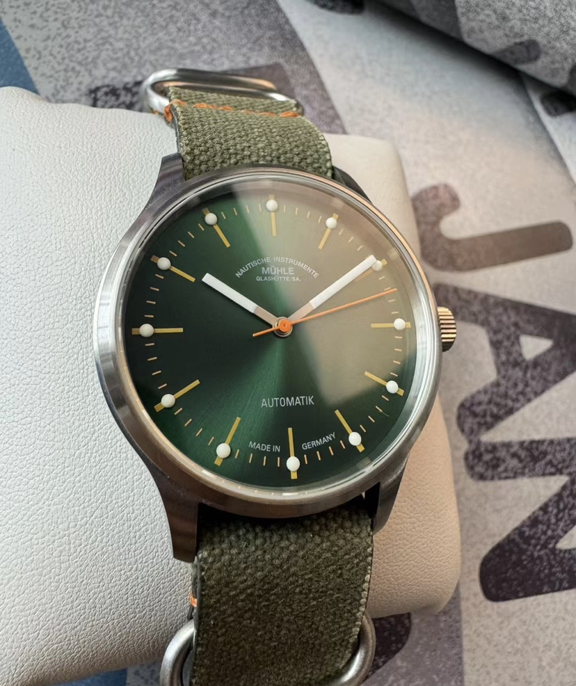 莫勒机械腕表,表径40毫米,德国包豪斯风格设计,简约大三针,拉丝处理精钢材质,渐变深邃蓝色太阳纹盘面,平头指针,橙色秒针和刻度,旋入式表冠,防水100米,带啄木鸟微调sw200机芯,褐色织物表带