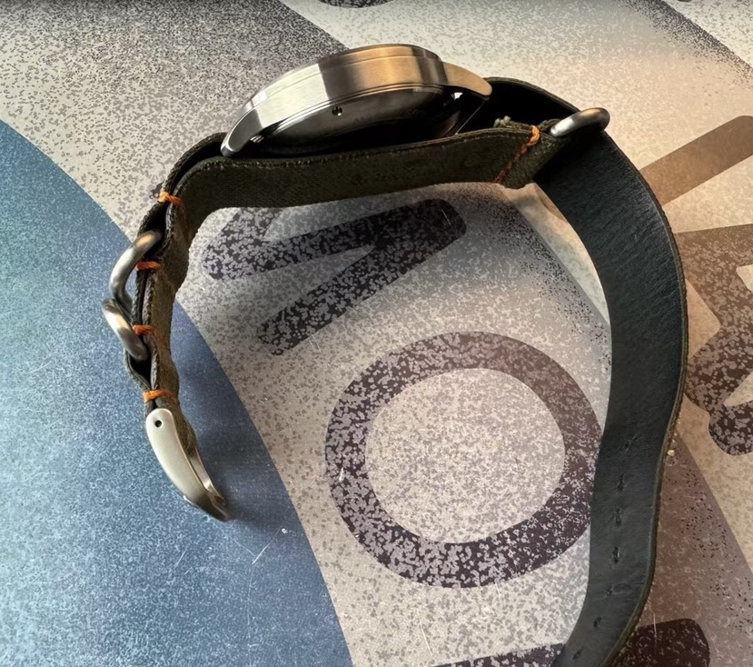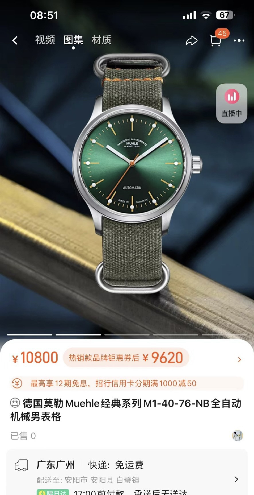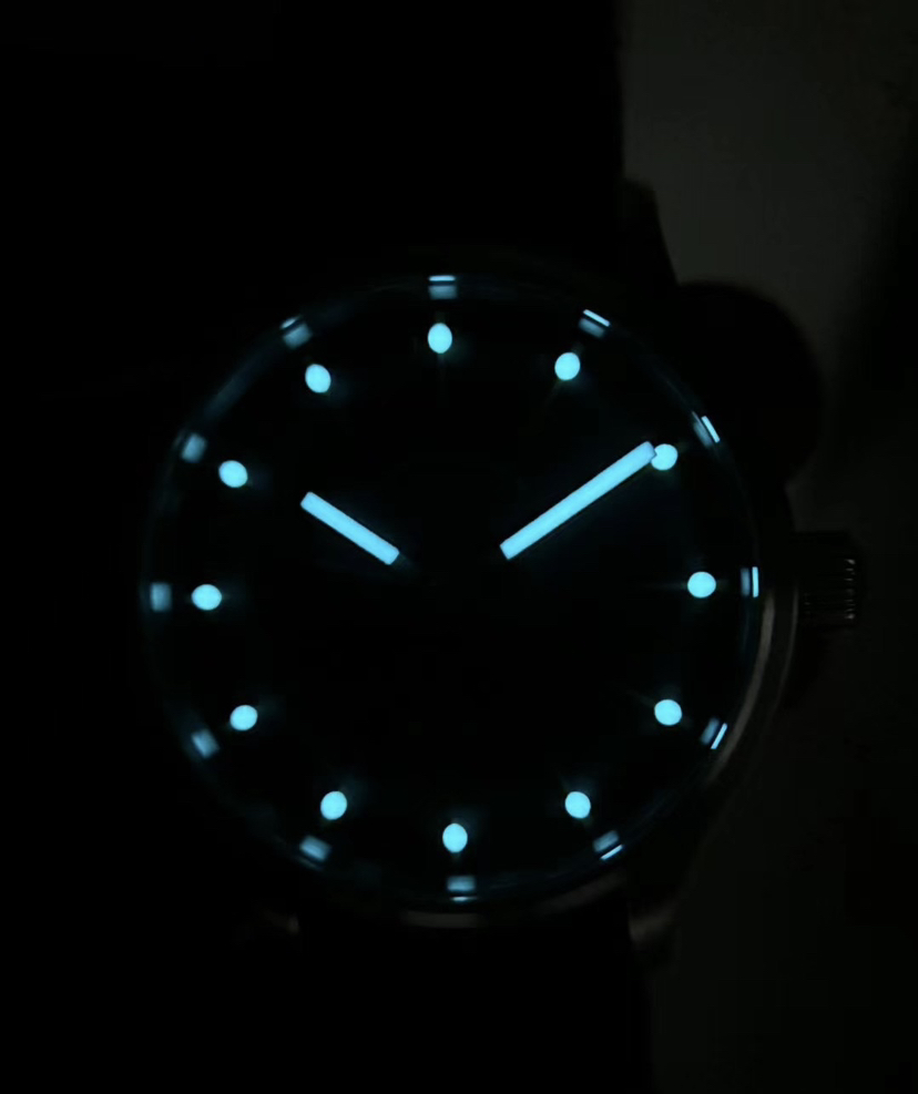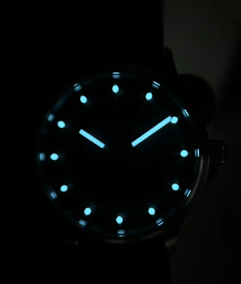 莫勒机械腕表,表径40毫米,德国包豪斯风格设计,简约大三针,拉丝处理精钢材质,渐变深邃蓝色太阳纹盘面,平头指针,橙色秒针和刻度,旋入式表冠,防水100米,带啄木鸟微调sw200机芯,褐色织物表带