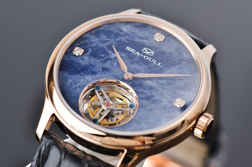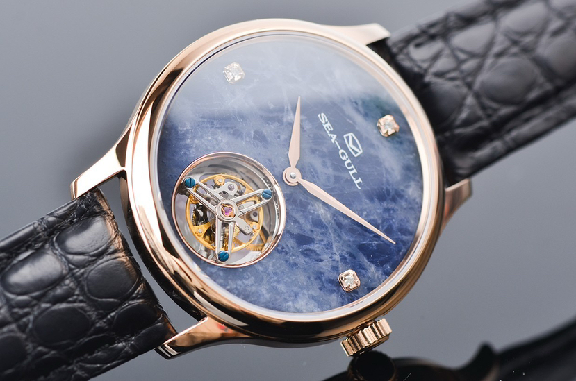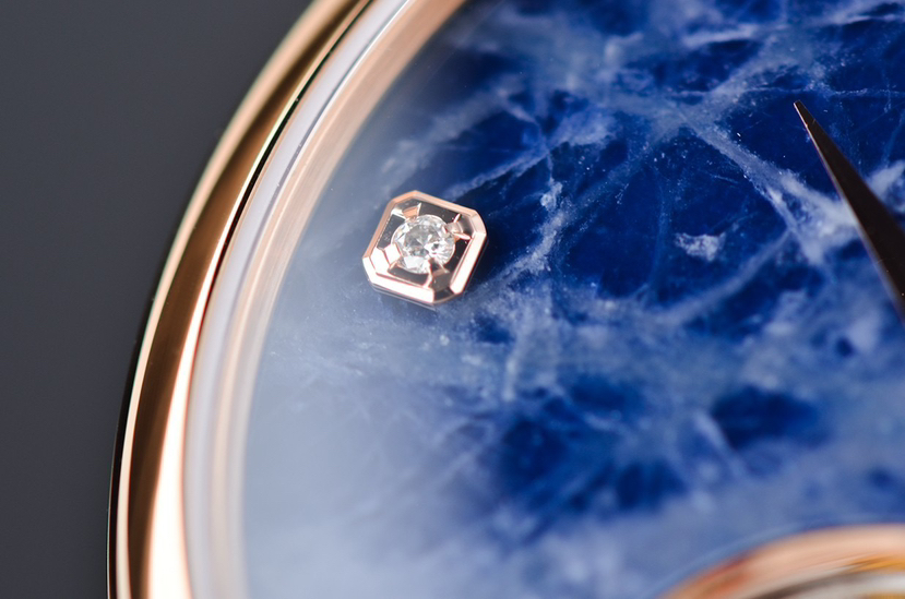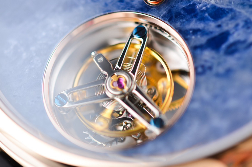 表盘:蓝纹玉表盘镶嵌3颗天然美钻,陀飞轮装置