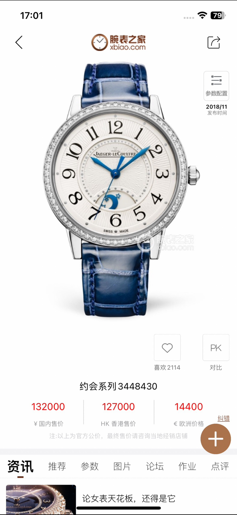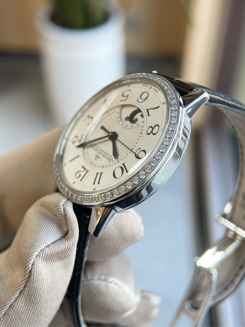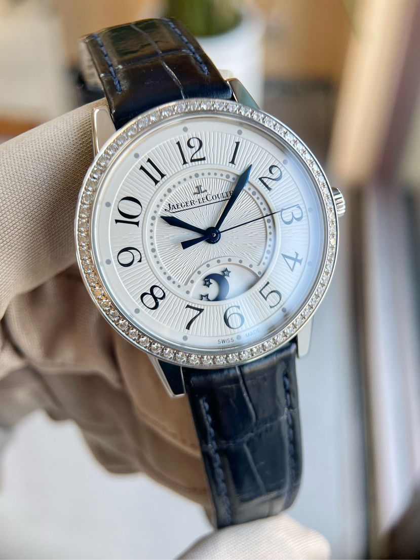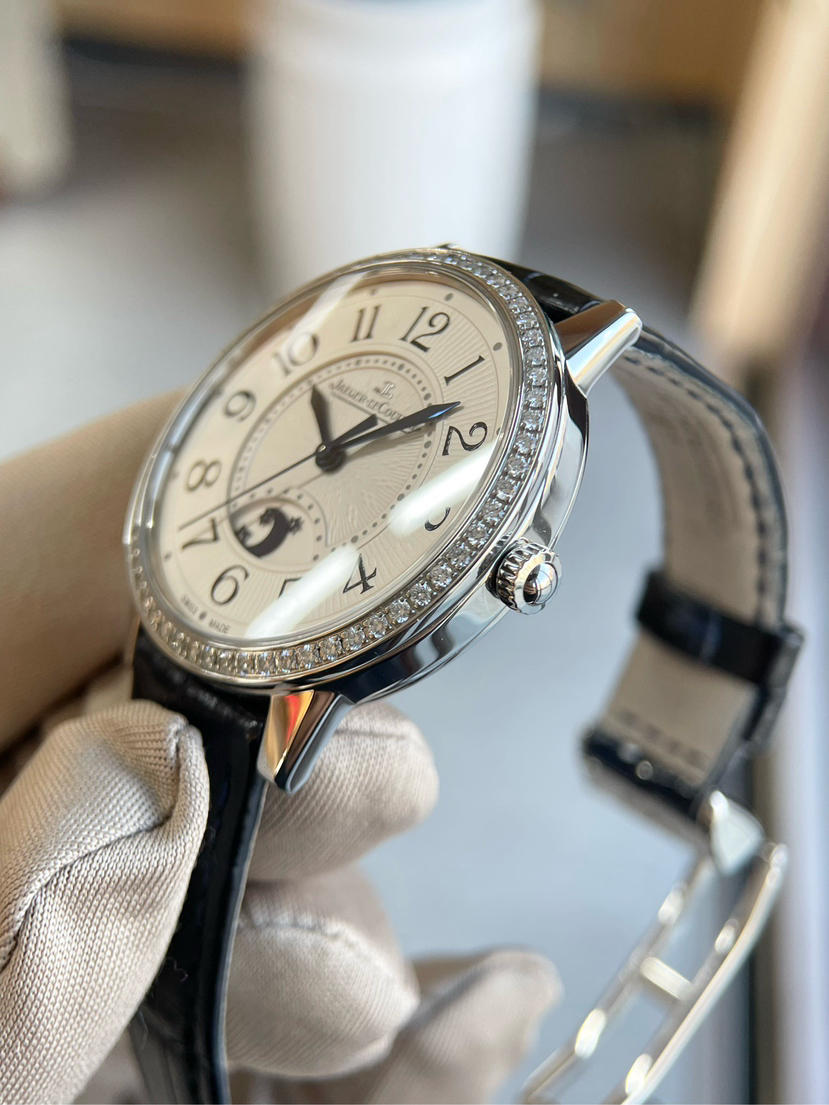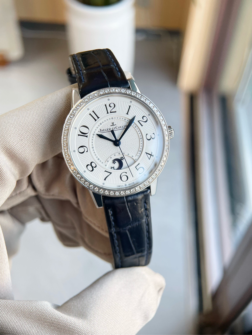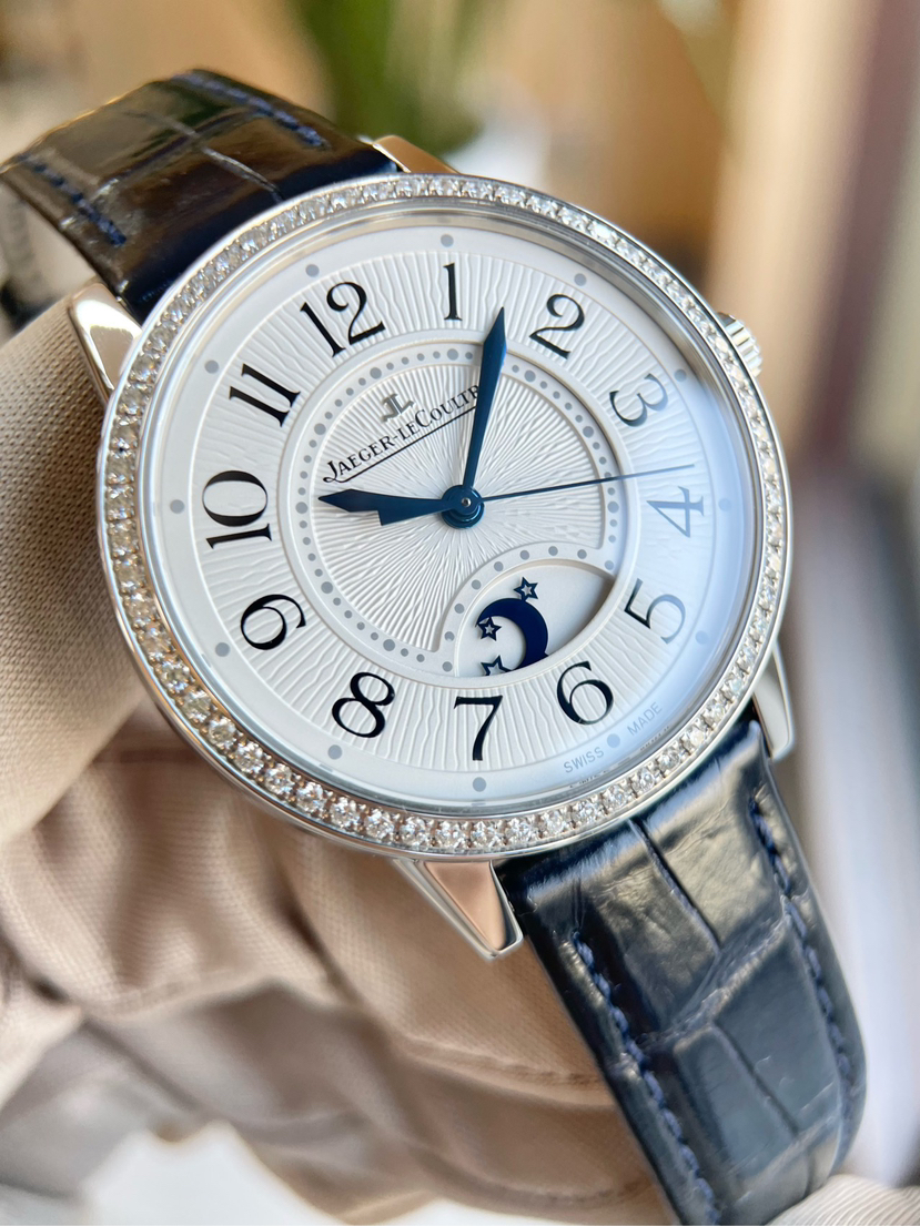 积家约会Q3448430 ,自动机械女士腕表,34MM口径,外圈原镶钻、月相功能。公价132000,