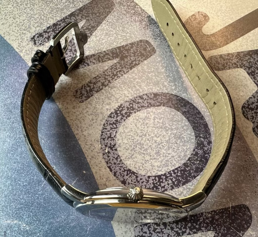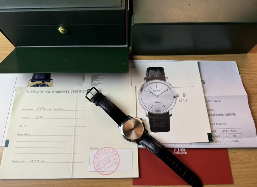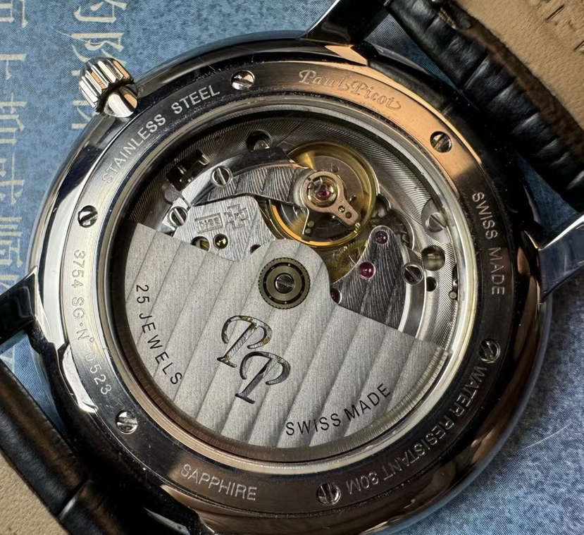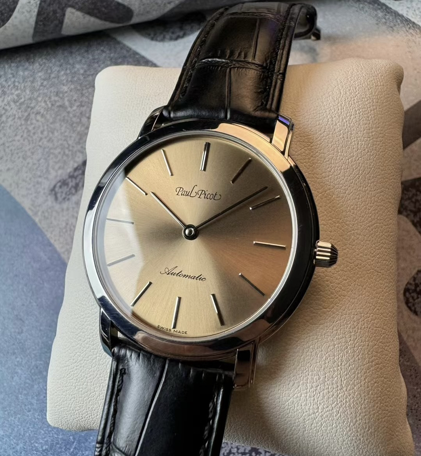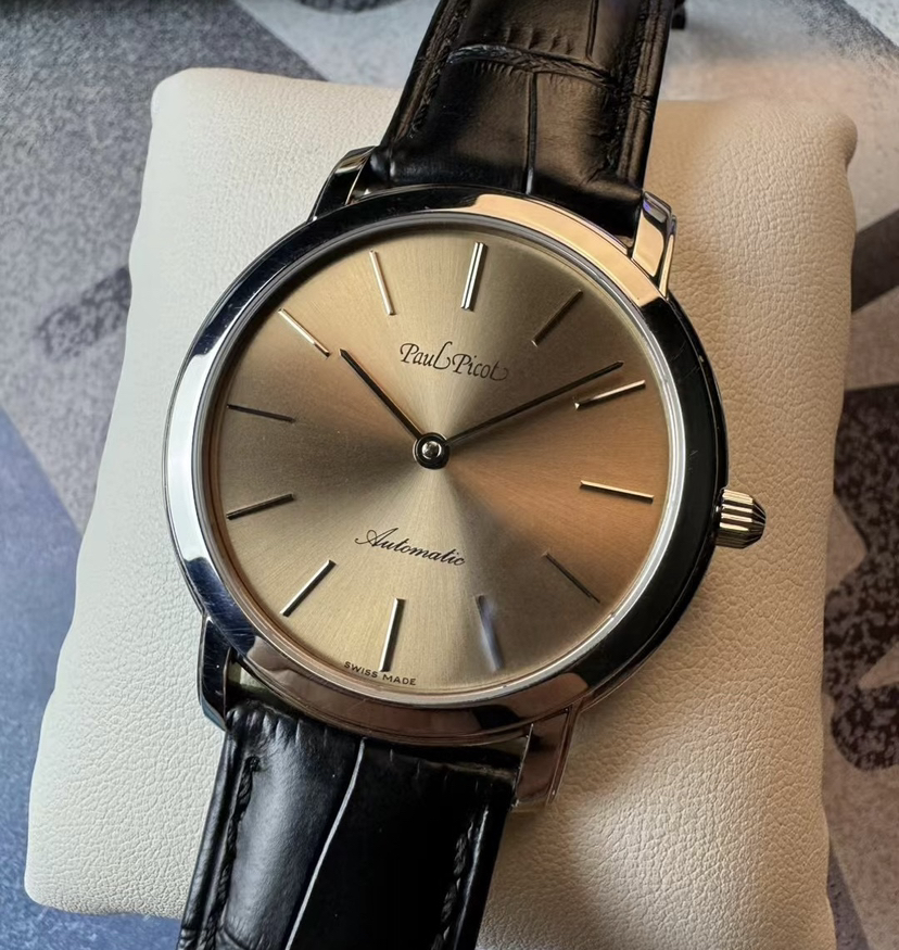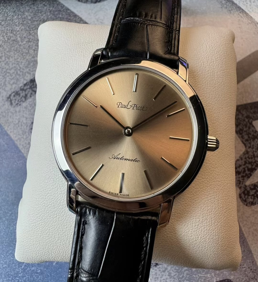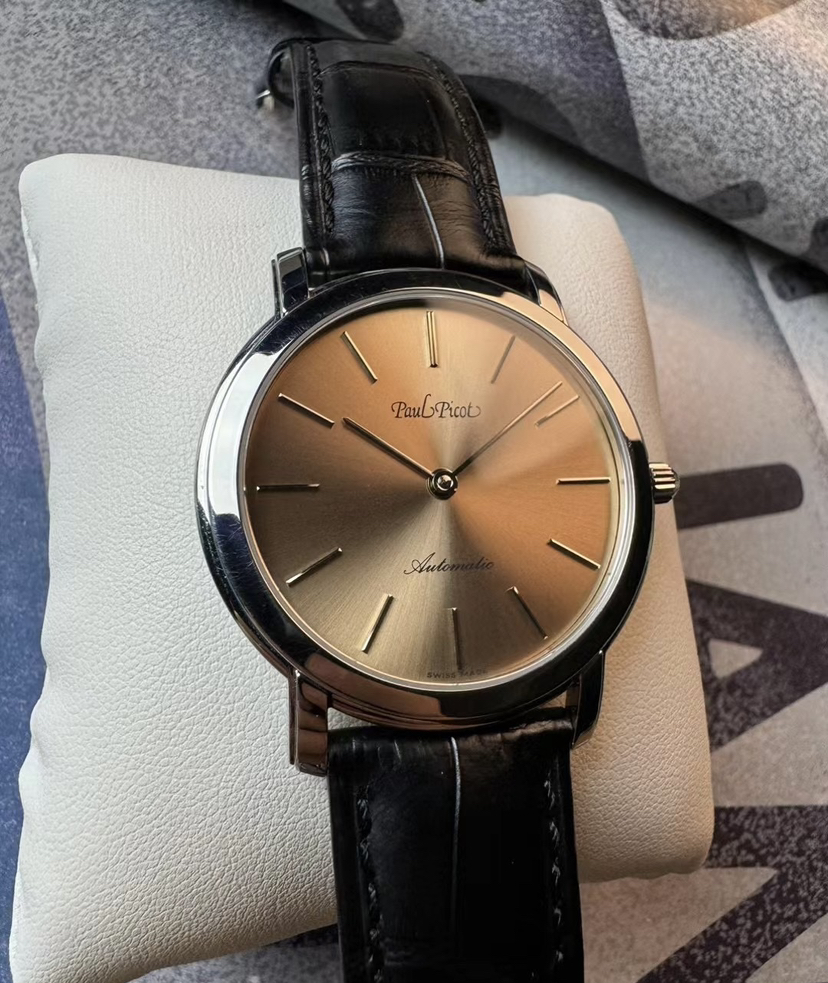 柏高梦想家系列机械腕表,表径40.5毫米,厚6.9毫米,平面防眩目蓝宝石镜面,简约设计,三文鱼太阳纹盘面,条形刻度,纤细的棒形时分两针。推拉式表冠,腕表背透一览无遗,搭载LEMANIA 8810自动机械机芯,现已停产,非常稀有,稳定且耐用。走时天文台级别,全套带票据