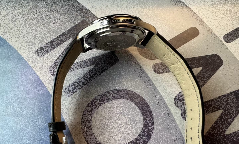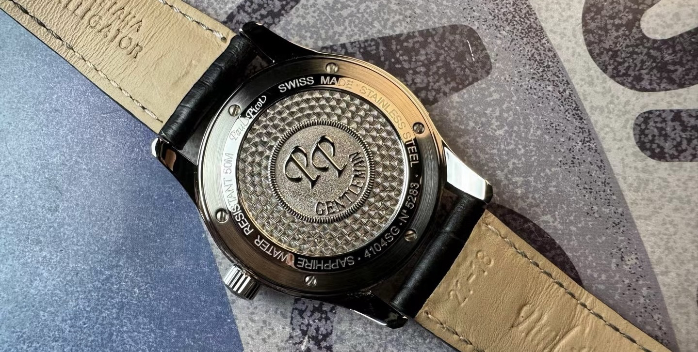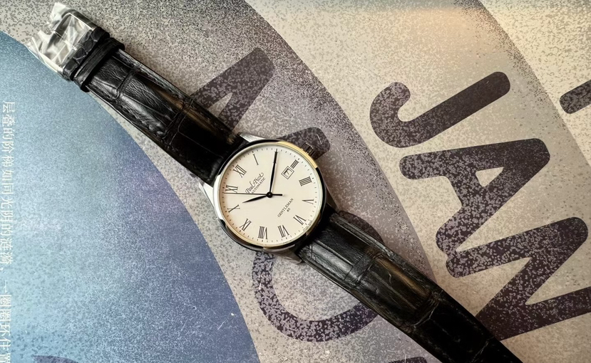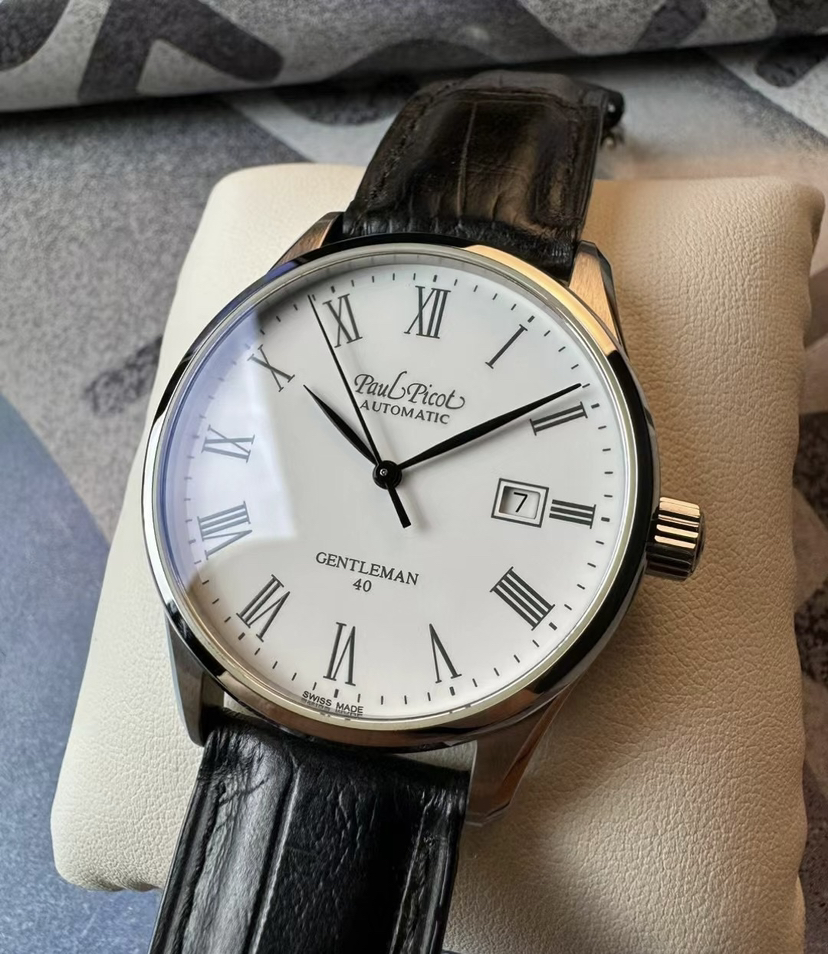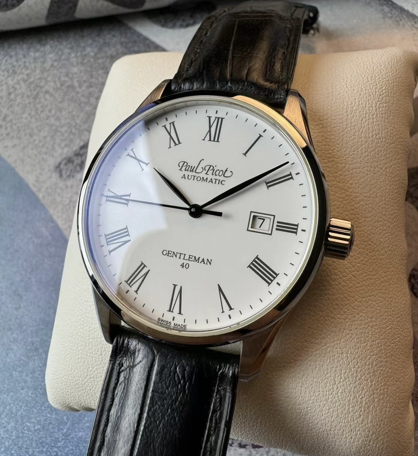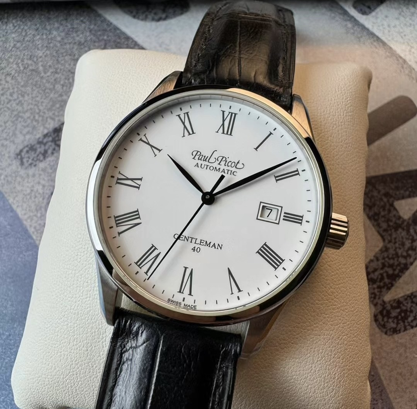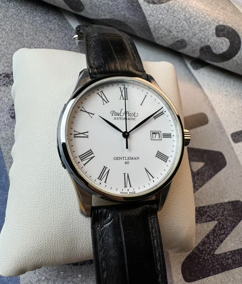 柏高绅士系列梦想家机械腕表,表径40毫米,厚10毫米,平面防眩目蓝宝石镜面,瓷白色盘面,黑色罗马文刻度,黑色柳叶形指针,3点日历,旋入式表冠,搭载calibre pp1420机芯,后盖精致鱼鳞纹,黑色鳄鱼皮表带,全部原装,近新成色,走时天文台级别,单表