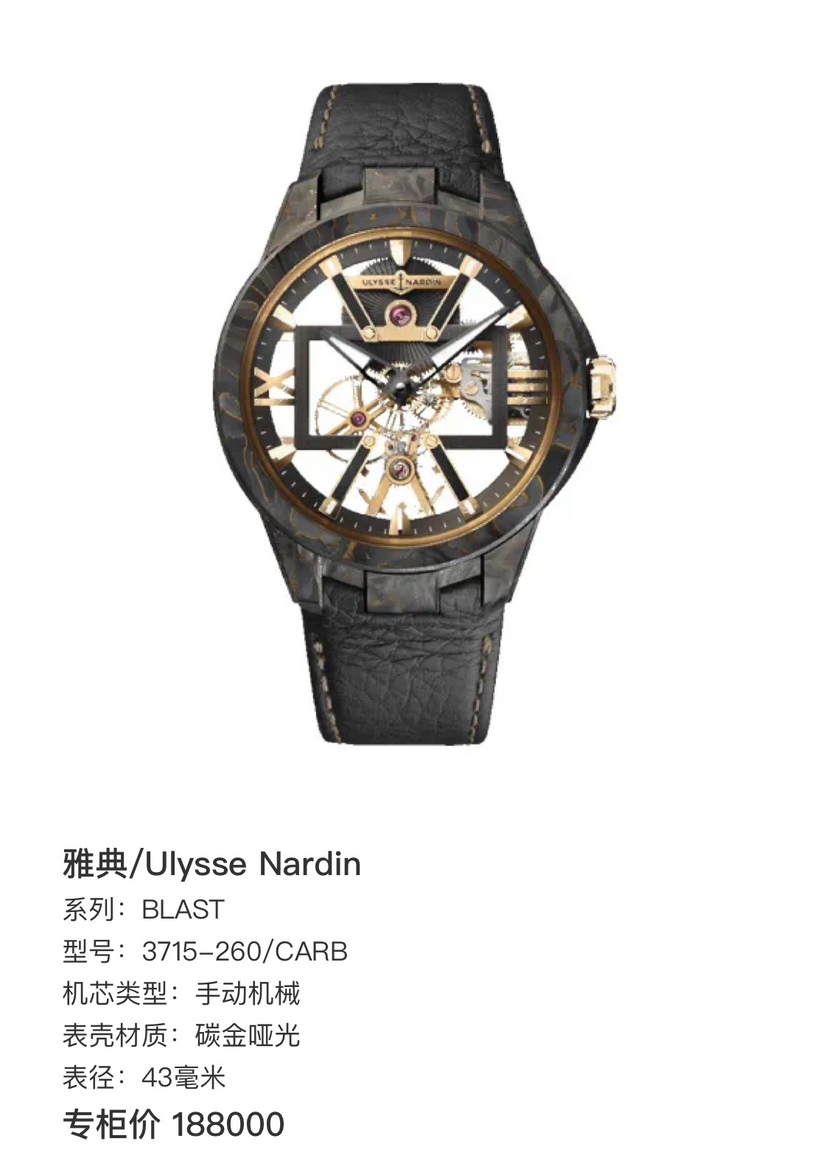 雅典/Ulysse Nardin BLAST 3715-260/CARB 手动机械 碳金哑光 43毫米 附件:20年全套 专柜价188000