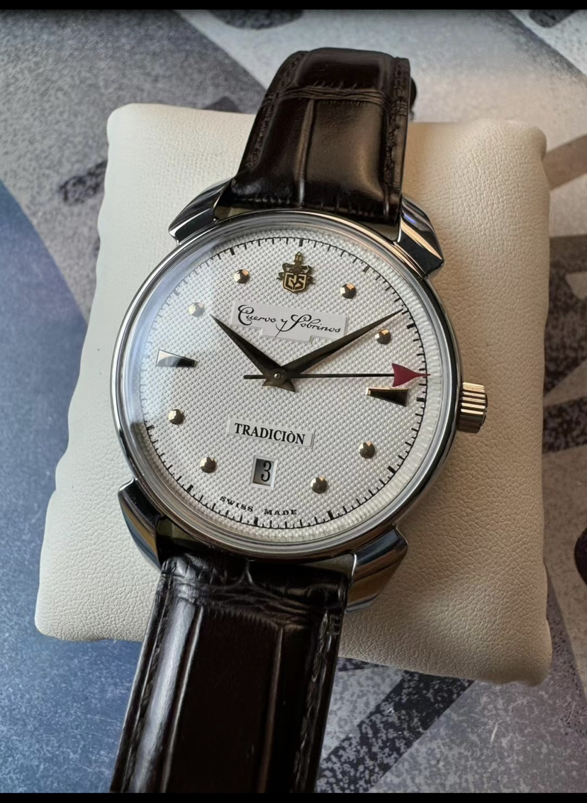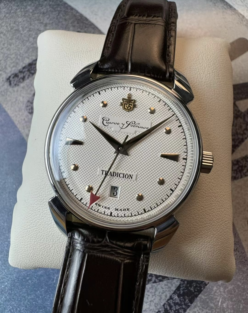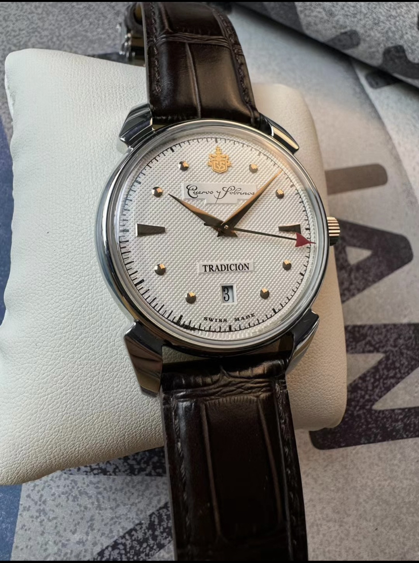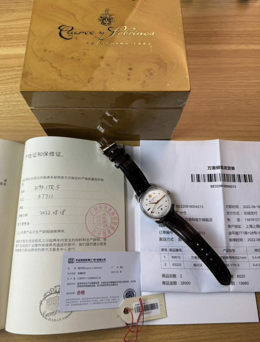 库尔沃历史学家传统机械腕表,表径40毫米,灵感来源于CYS在40年代的腕 表设计,集古典风格和复古情怀于一身。气泡状盒形蓝宝石镜面,光线满溢于表盘上,提高可读性。经典牛角表耳,白色盘面装饰圆钉纹,太妃式指针,圆钉刻度,金色指针刻度,末端红色箭头形秒针,6点日历。推拉式表冠,搭载sw300机芯,鳄鱼皮表带,双按压蝴蝶扣。实木表盒,内含湿度计与保湿器,2022年8月18日购入,全套带票据等