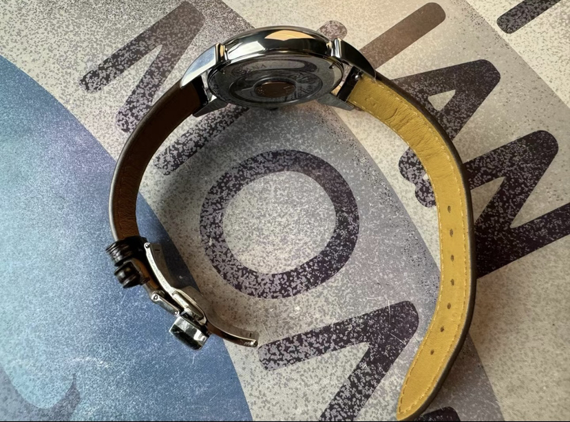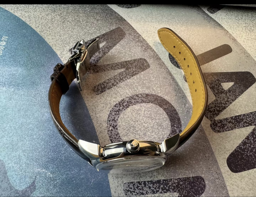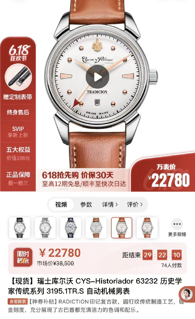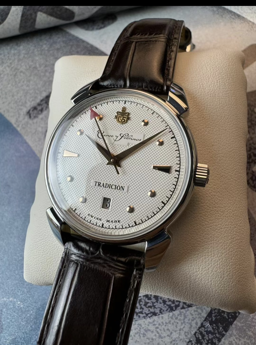 库尔沃历史学家传统机械腕表,表径40毫米,灵感来源于CYS在40年代的腕 表设计,集古典风格和复古情怀于一身。气泡状盒形蓝宝石镜面,光线满溢于表盘上,提高可读性。经典牛角表耳,白色盘面装饰圆钉纹,太妃式指针,圆钉刻度,金色指针刻度,末端红色箭头形秒针,6点日历。推拉式表冠,搭载sw300机芯,鳄鱼皮表带,双按压蝴蝶扣。实木表盒,内含湿度计与保湿器,2022年8月18日购入,全套带票据等
