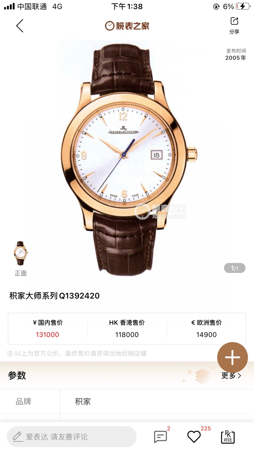 积家大师系列Q1392420,原价131000,表径39mm,18K玫瑰金材质,自动机械,现货特价