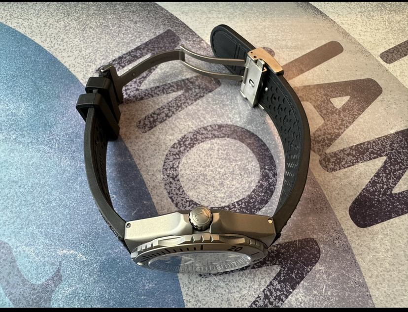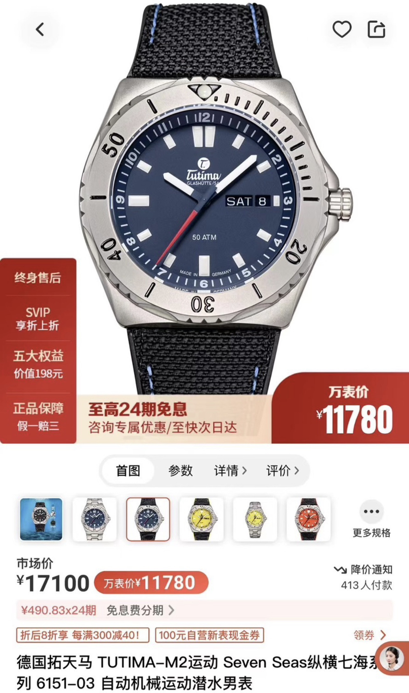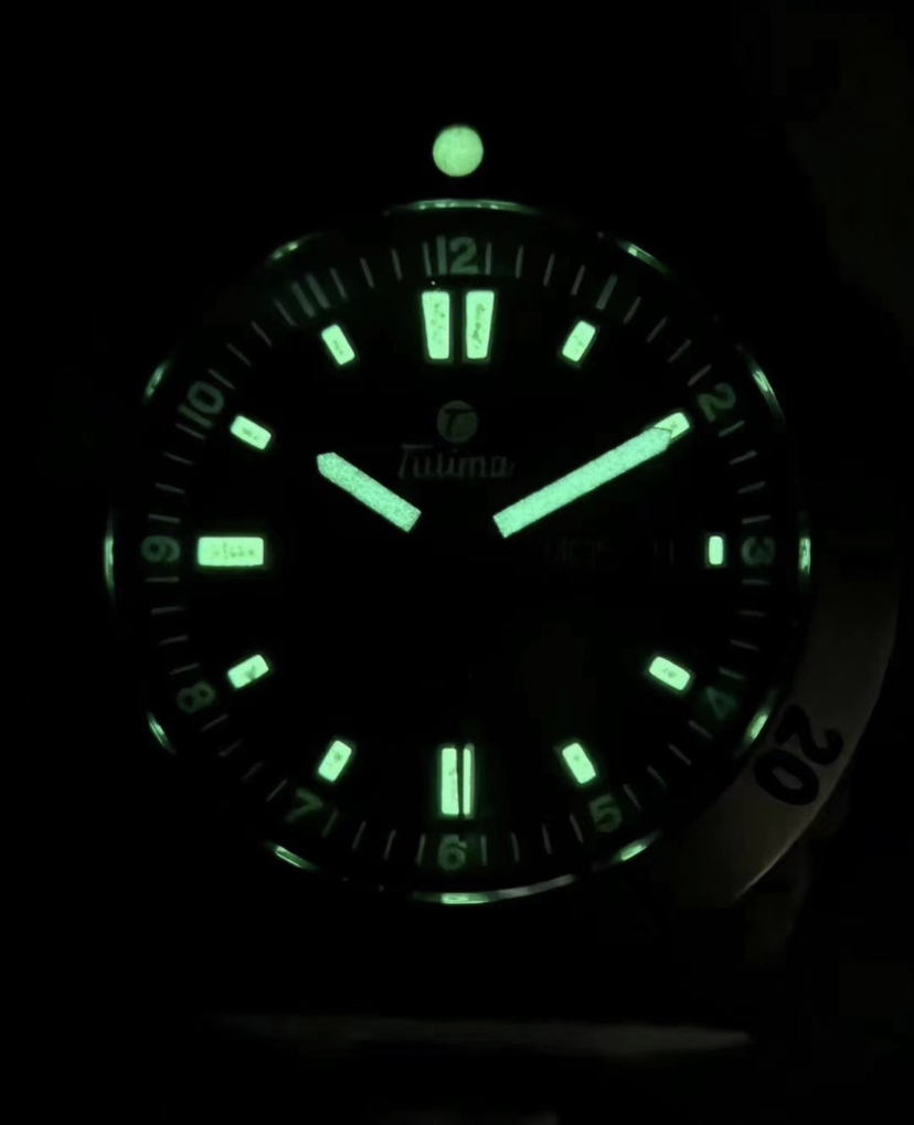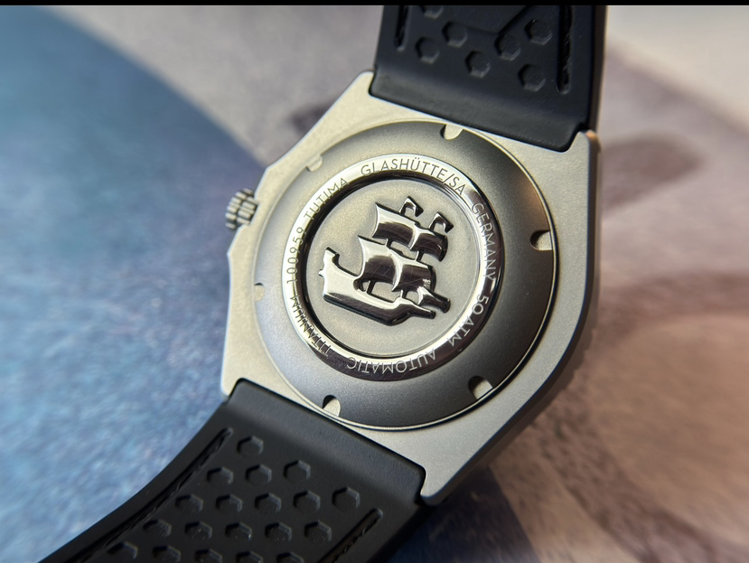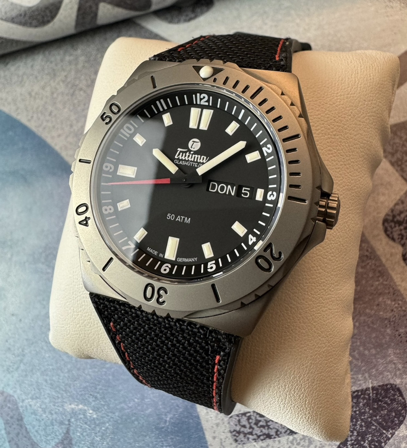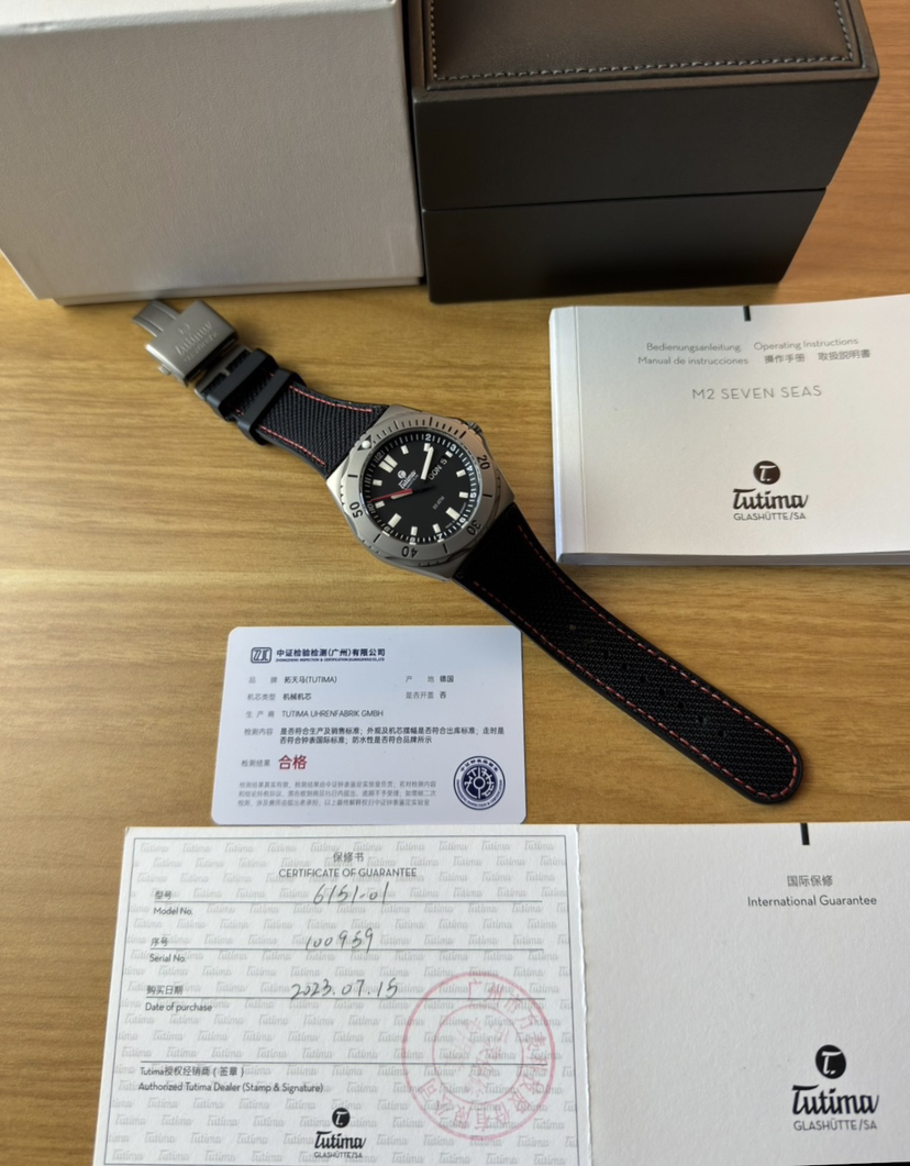 德国拓天马纵横七海深潜机械腕表,钛金属材质,单向旋转表圈,表径44毫米,厚13毫米,哑光黑色盘面,夜光指针刻度,红色秒针,3点星期历和日历,带护肩的旋入式表冠,防水500米,搭载经格拉苏蒂制表师调校TUTIMA 330改良机芯,基础机芯eta2836,底盖浮雕帆船图案,防弹衣材质的凯拉夫表带,双按压钛金属蝴蝶扣,近新成色,全套
