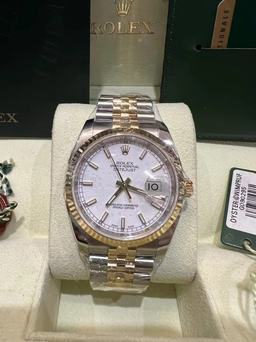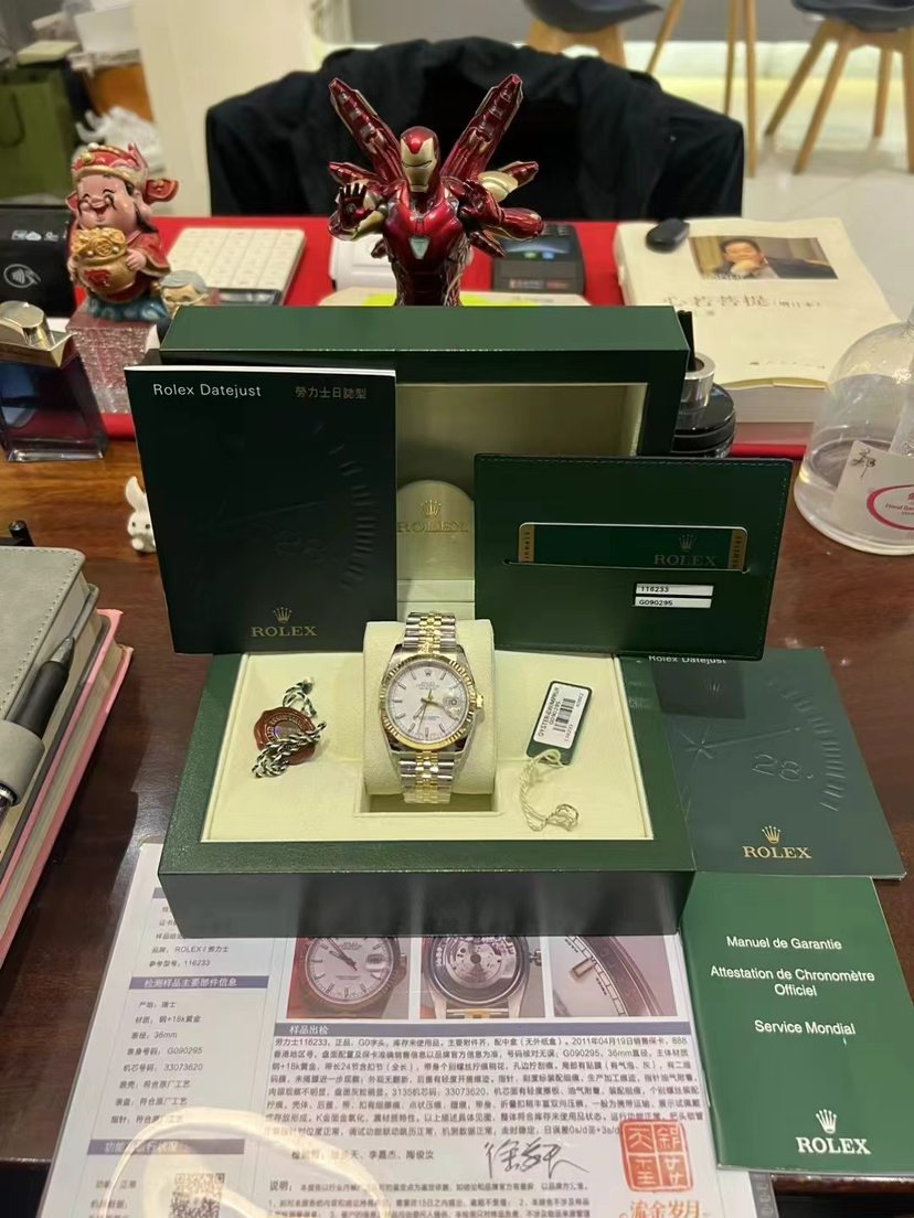 全新未使用(带徐步天未使用报告)11年保卡 劳力士 日志型系列 116233白盘(单红日历)男士自动机械腕表 36mm表径 18K黄金与精钢材质打造 象牙白盘搭配夜光金针与夜光条形刻度(刻度外圈还配有轨道面罗马数字时标)三点位单红日期显示(日期数字为单数时显示红色数字俗称单红)经典中的经典 11年库存未使用品 完美无暇 带22年11月徐步天未使用鉴定报告 收藏自用都非常划算 工价8.85万 本店现货好价