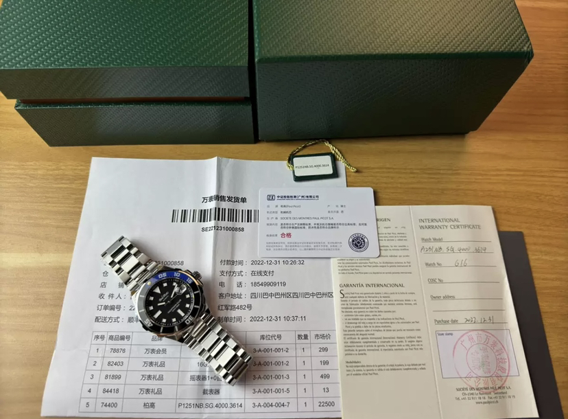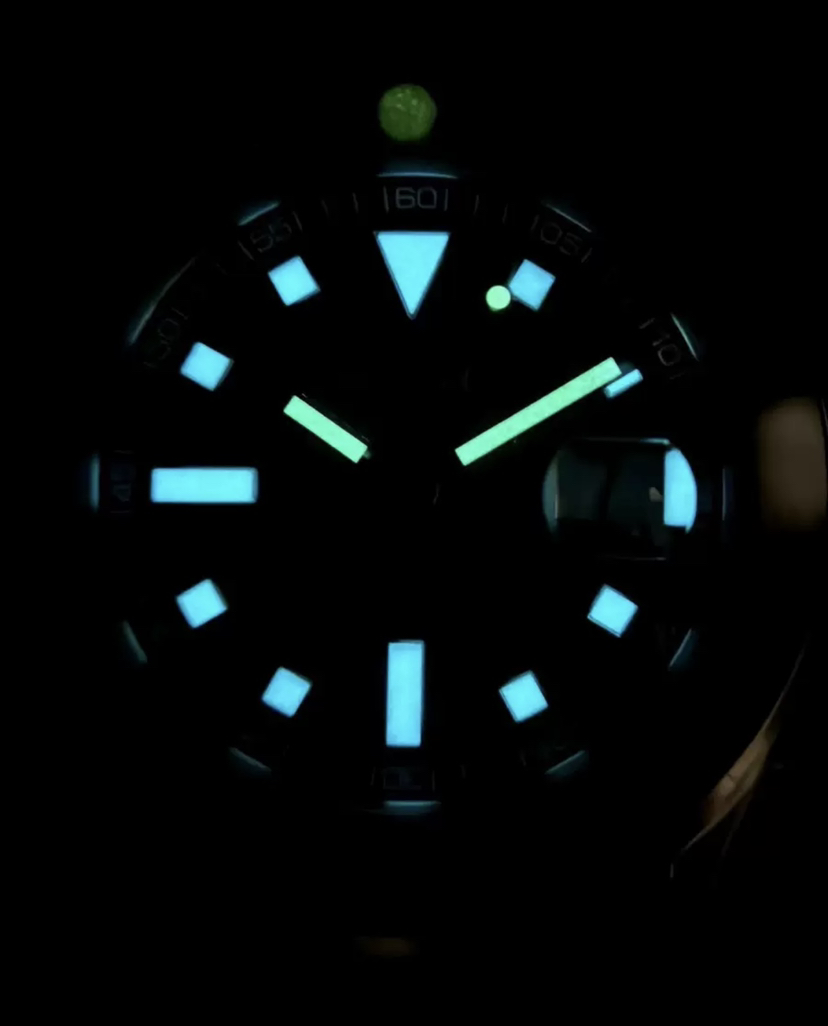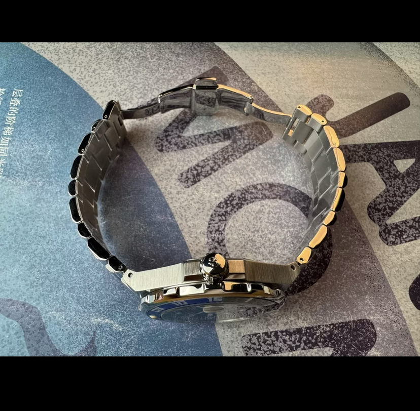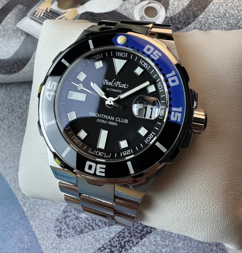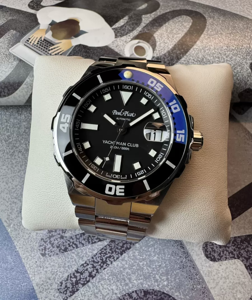 柏高冒险家潜水机械腕表,表径43毫米,厚12.7毫米,单向旋转蓝宝石表圈,0到15刻度是蓝色的,酷似航海六分仪,沉稳黑色盘面,块状刻度,剑形指针,舵形表底,坦克表链,硬朗有型,双按压折叠扣带安全装置,旋入式表冠,防水200米,搭载pp1600机芯,近新成色,全套