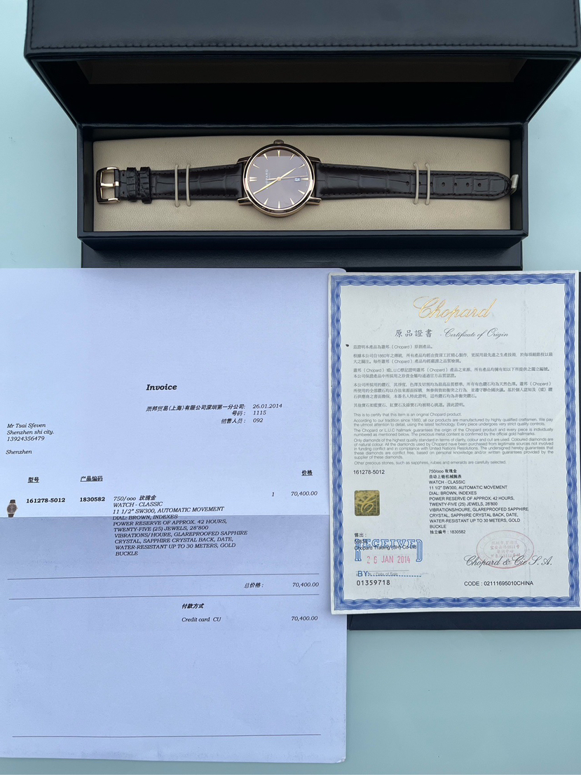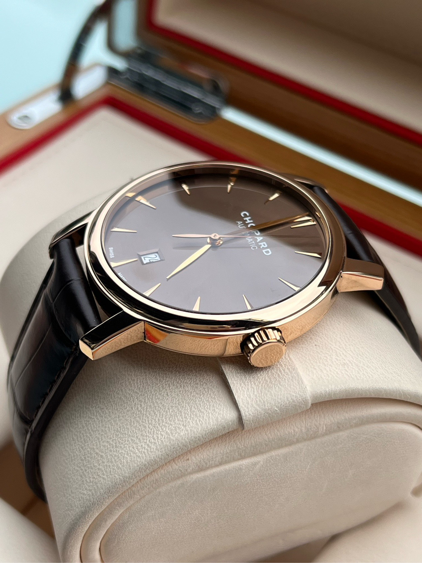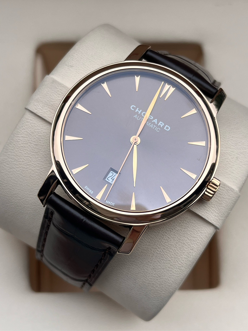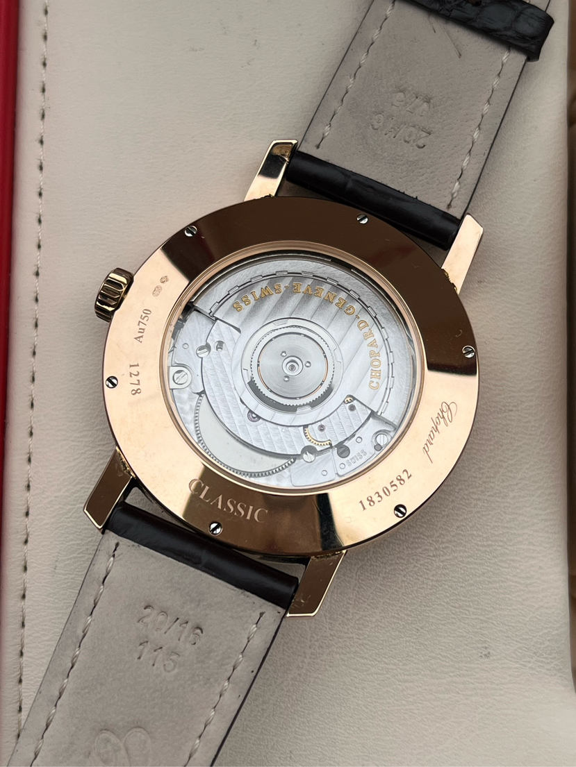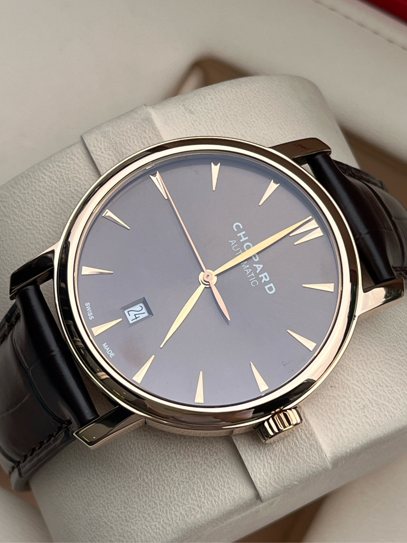 萧邦CLASSIC经典L.U.C系列161278-5012、男士自动机械腕表、表径:40mm、材质:18k玫瑰金/皮带、深咖啡色盘面、玫瑰金色条形刻度指针、日期显示、全套附件、整表新、原价:86000元~