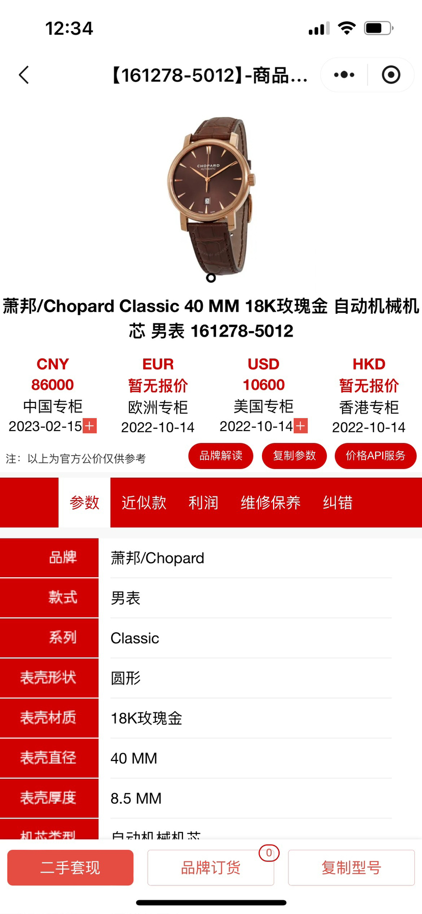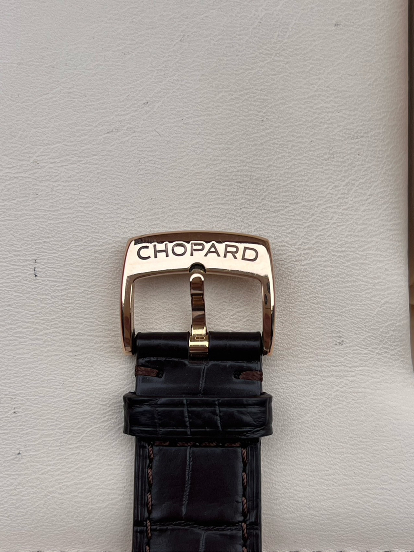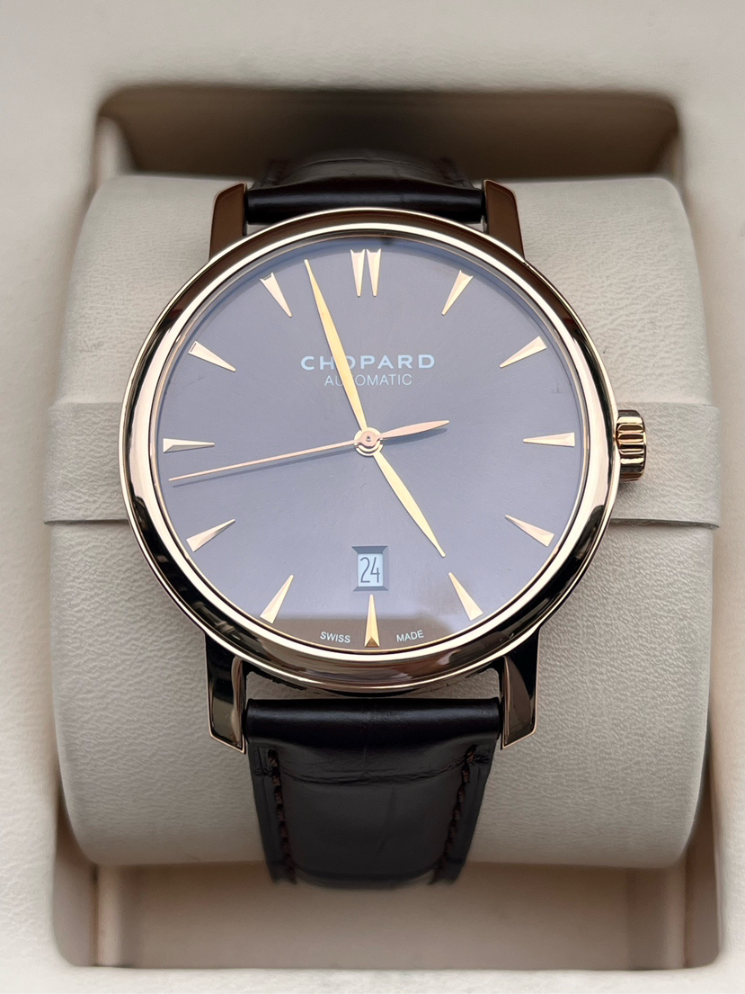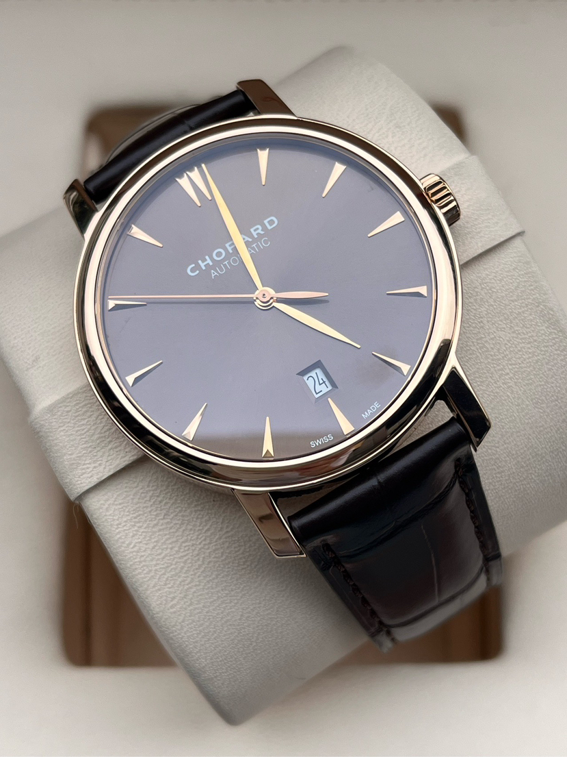 萧邦CLASSIC经典L.U.C系列161278-5012、男士自动机械腕表、表径:40mm、材质:18k玫瑰金/皮带、深咖啡色盘面、玫瑰金色条形刻度指针、日期显示、全套附件、整表新、原价:86000元~