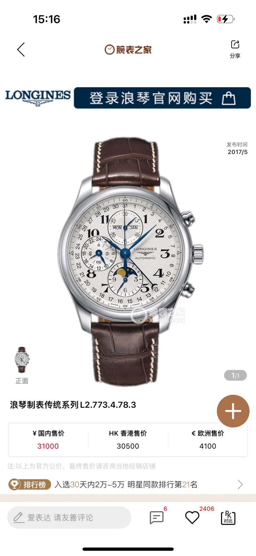 浪琴/Longines Master Collection 名匠系列 L2.773.4.78.3 自动机械机芯 精钢 42.00 MM 专柜价27800