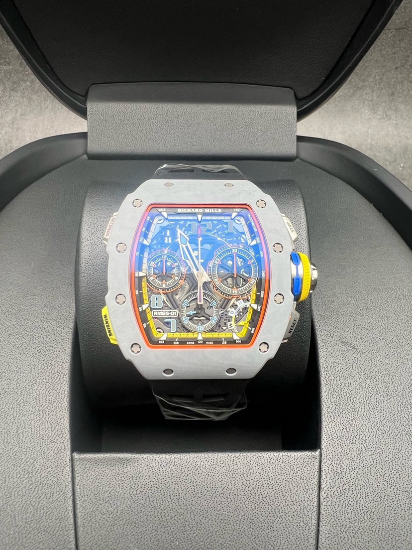 【7月卡65-01】理查德米勒RM65-01,新款灰QTPT材质,双追针计时,2024年7月卡全套,带徐步天报告,现货好价。