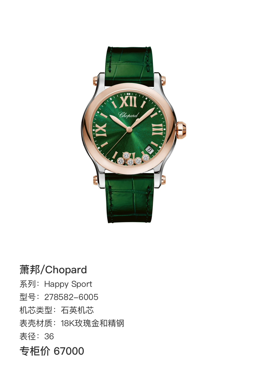 全新全套。萧邦/Chopard Happy Sport 278582-6005 石英机芯 18K玫瑰金和精钢 36 专柜价67000