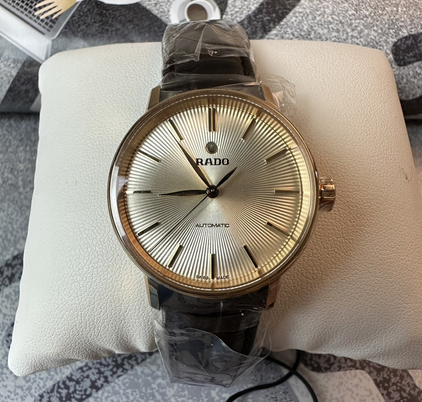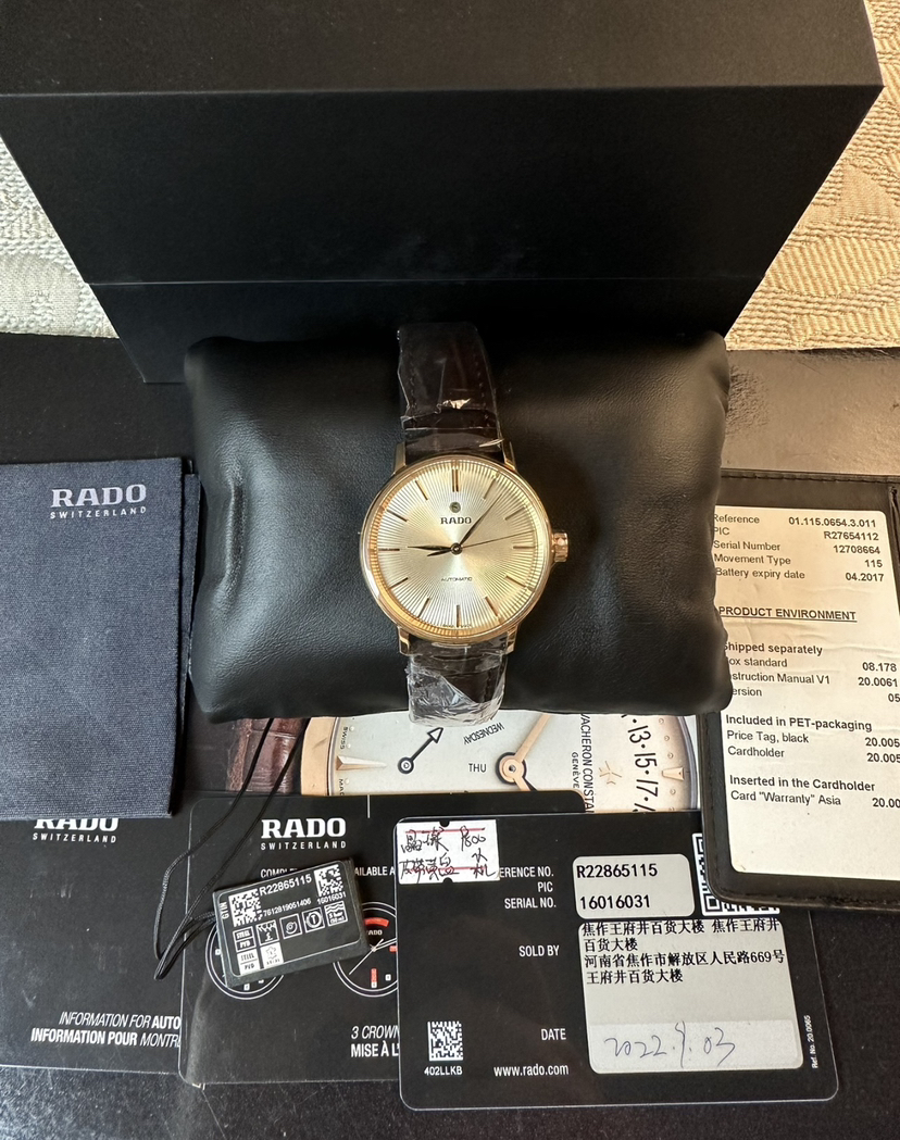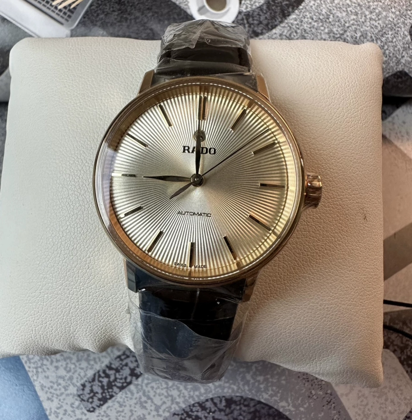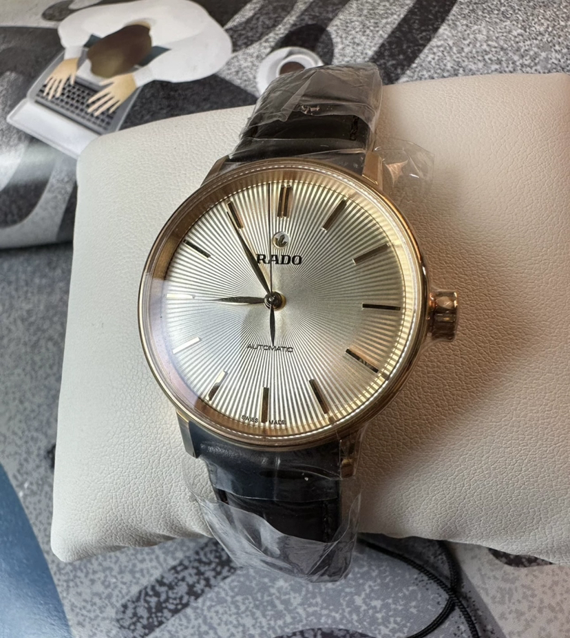 雷达晶璨系列机械女表,表径31.8毫米,厚9.7毫米,pvd玫瑰金工艺,弧形双面防炫目蓝宝石镜面,米黄色放射状纹路盘面,柳叶指针,条形刻度,金色指针刻度,非旋入式表冠,搭载eta全自动机芯,2022年9月3日购入,未使用全套