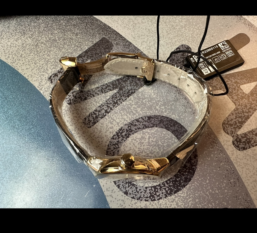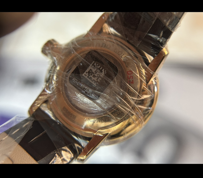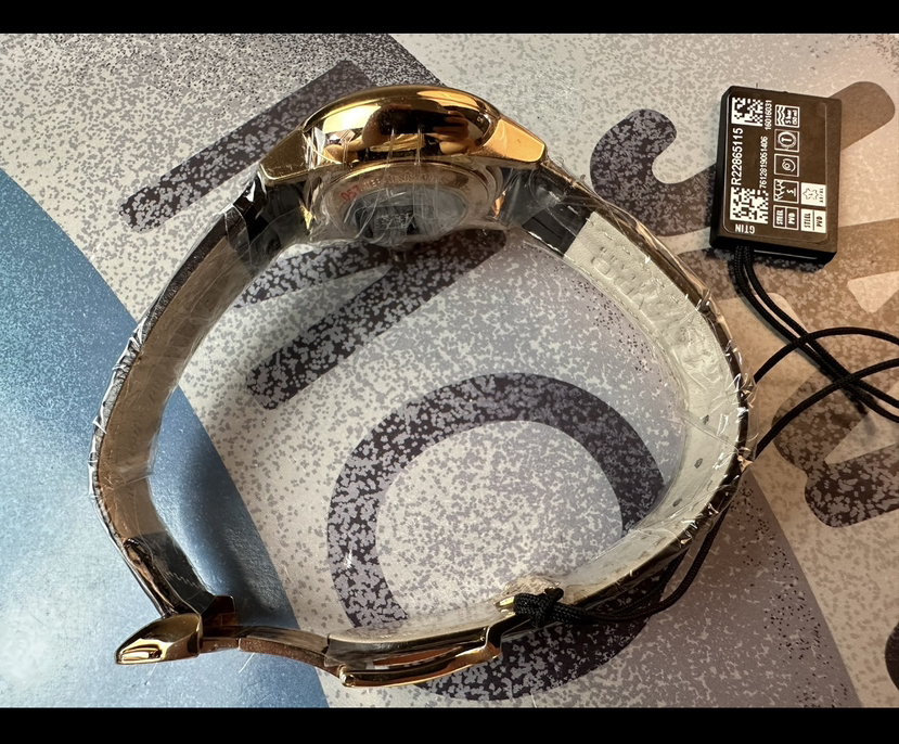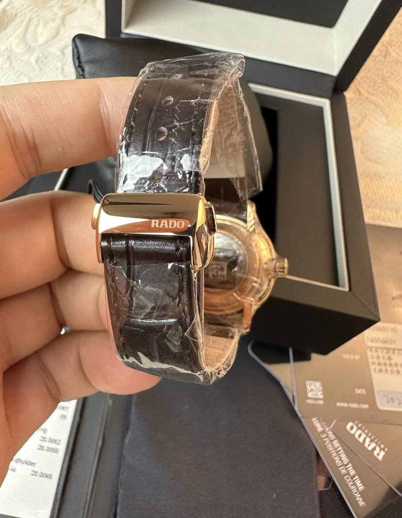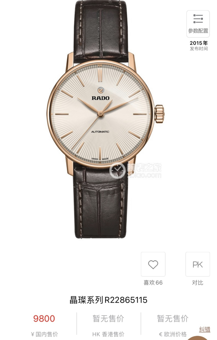 雷达晶璨系列机械女表,表径31.8毫米,厚9.7毫米,pvd玫瑰金工艺,弧形双面防炫目蓝宝石镜面,米黄色放射状纹路盘面,柳叶指针,条形刻度,金色指针刻度,非旋入式表冠,搭载eta全自动机芯,2022年9月3日购入,未使用全套