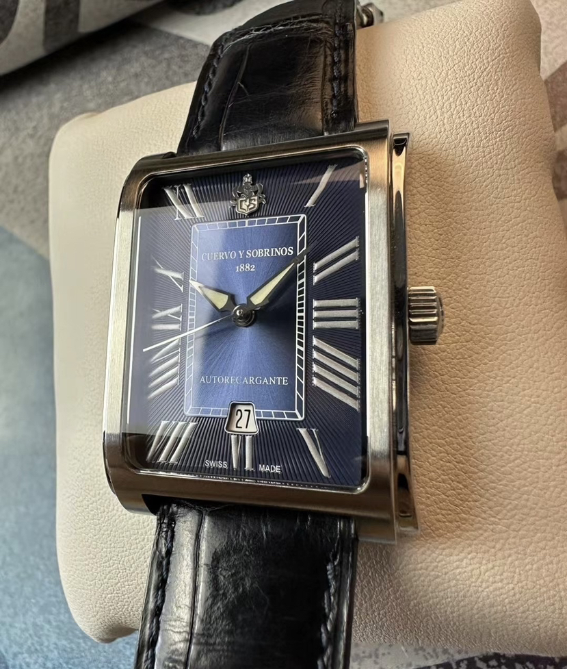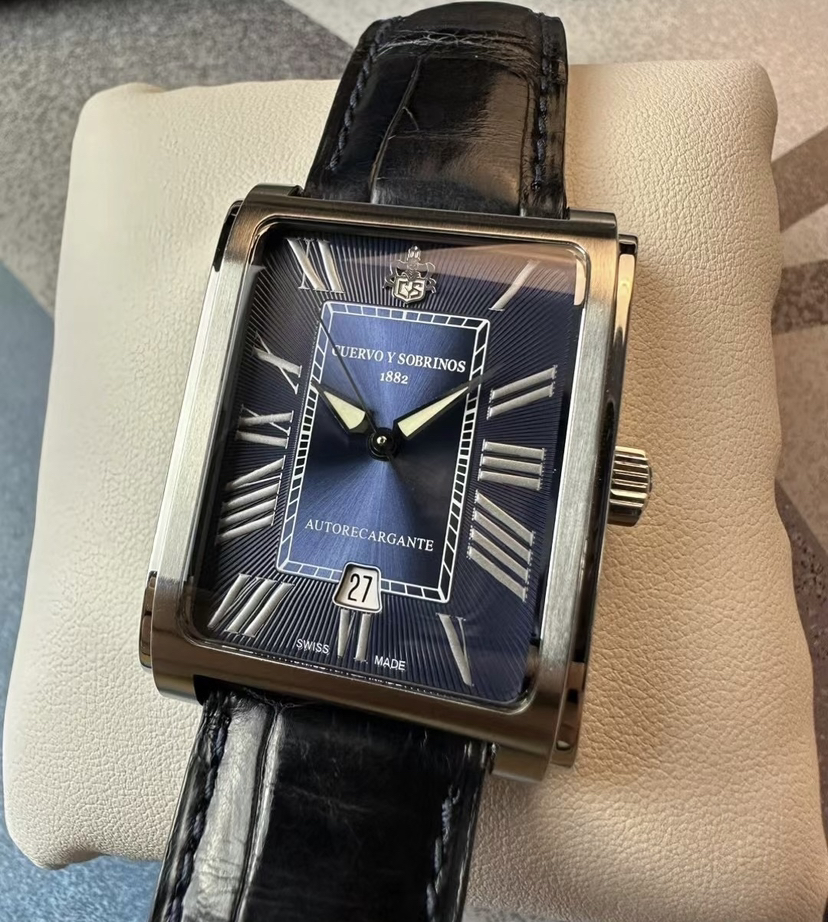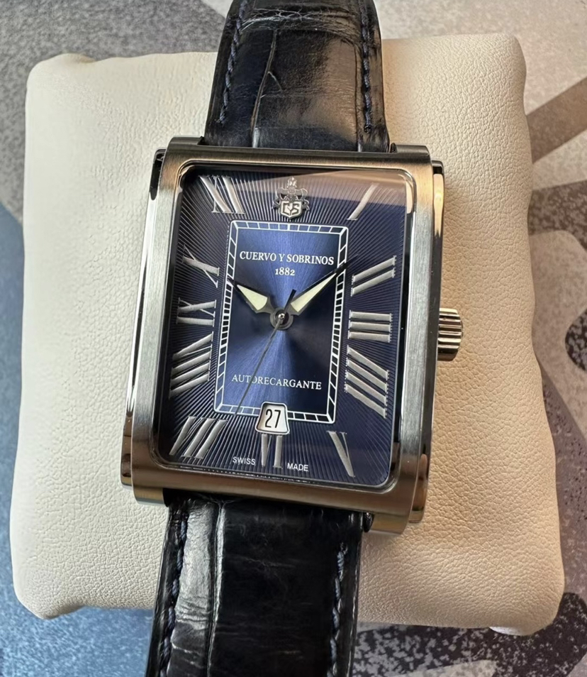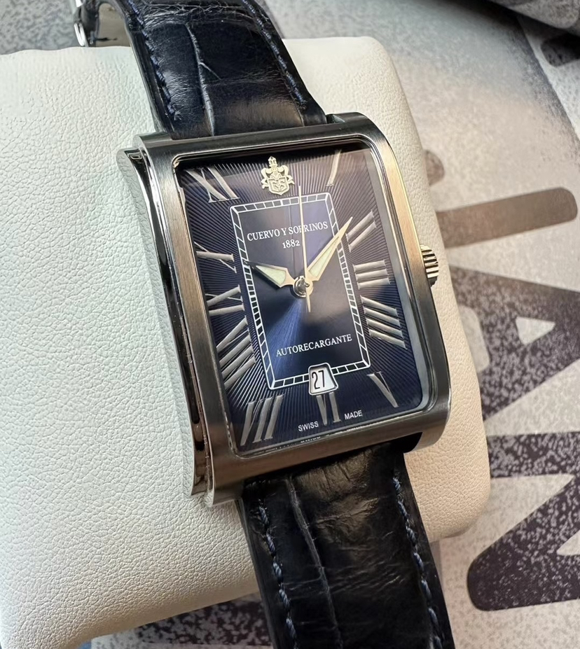 库尔沃名流系列机械腕表,方形表款设计,表径32x43毫米,厚9毫米,防反光双曲面蓝宝石镜面,蓝色太阳放射纹路盘面,罗马文刻度,剑形指针,6点梯形日历窗,非旋入式表冠,搭载自产超薄自动机芯,动储42小时,黑色路易斯安那鳄鱼皮表带,高档折叠扣,走时天文台级别,超大实木表盒,内有温度计与保湿器