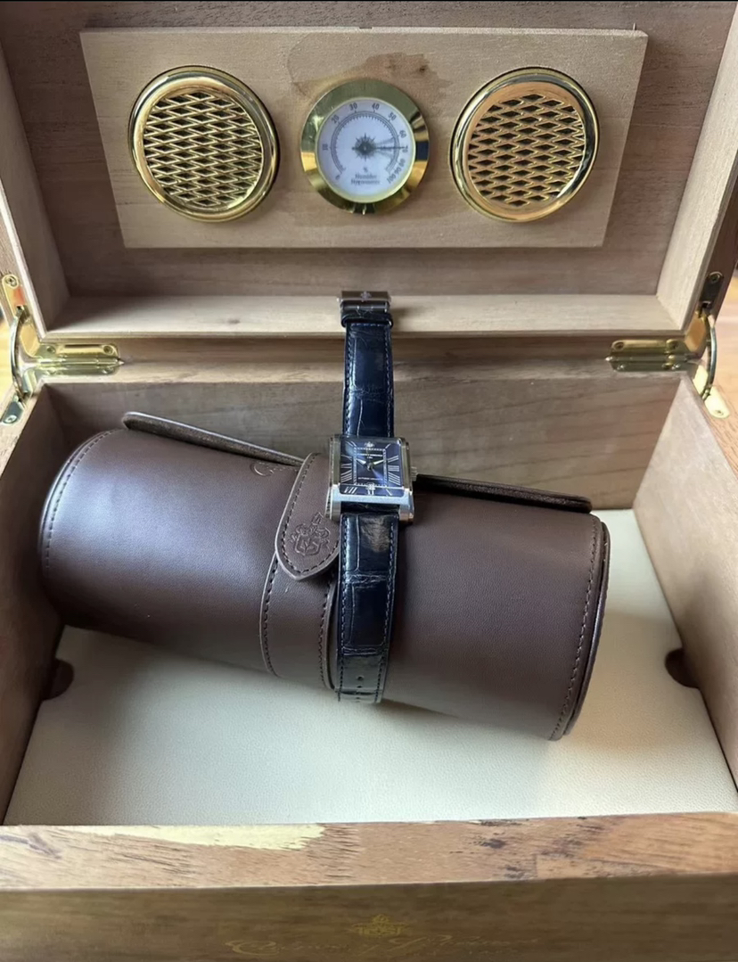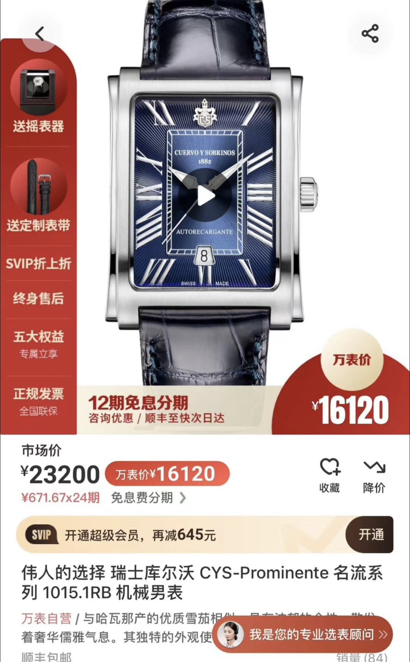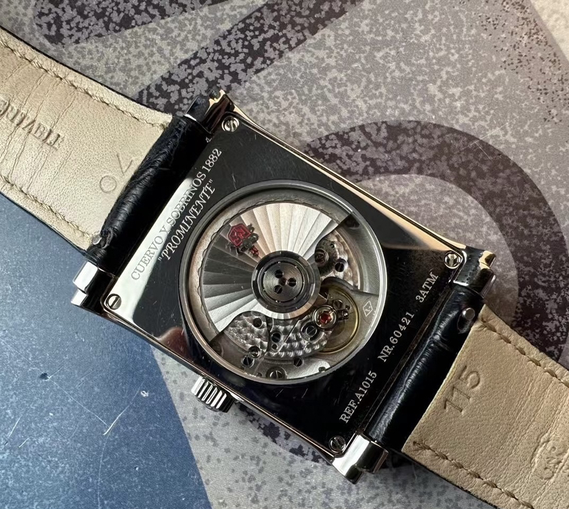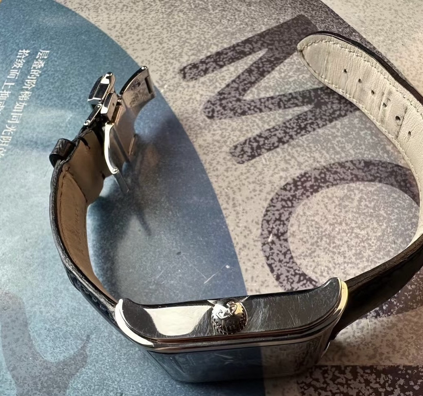 库尔沃名流系列机械腕表,方形表款设计,表径32x43毫米,厚9毫米,防反光双曲面蓝宝石镜面,蓝色太阳放射纹路盘面,罗马文刻度,剑形指针,6点梯形日历窗,非旋入式表冠,搭载自产超薄自动机芯,动储42小时,黑色路易斯安那鳄鱼皮表带,高档折叠扣,走时天文台级别,超大实木表盒,内有温度计与保湿器