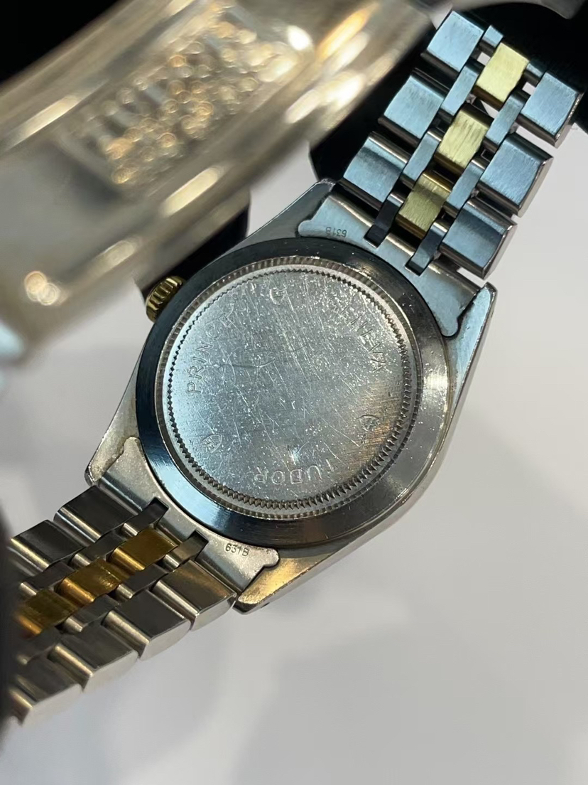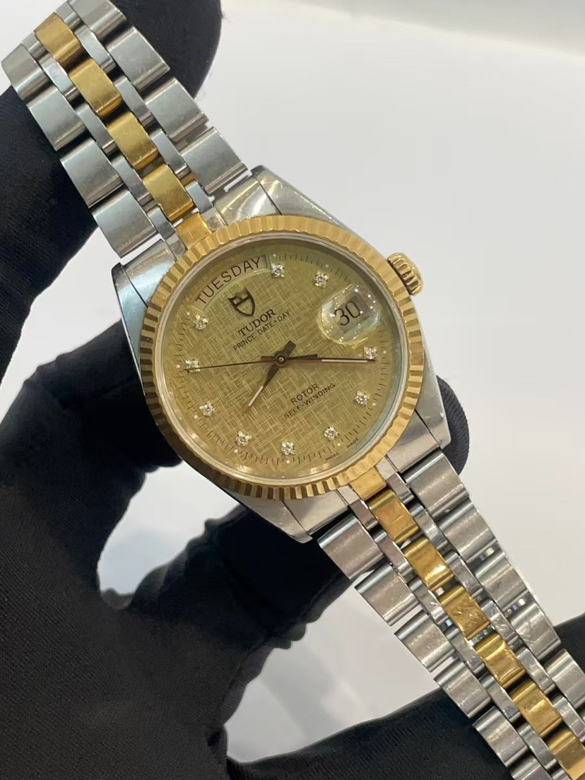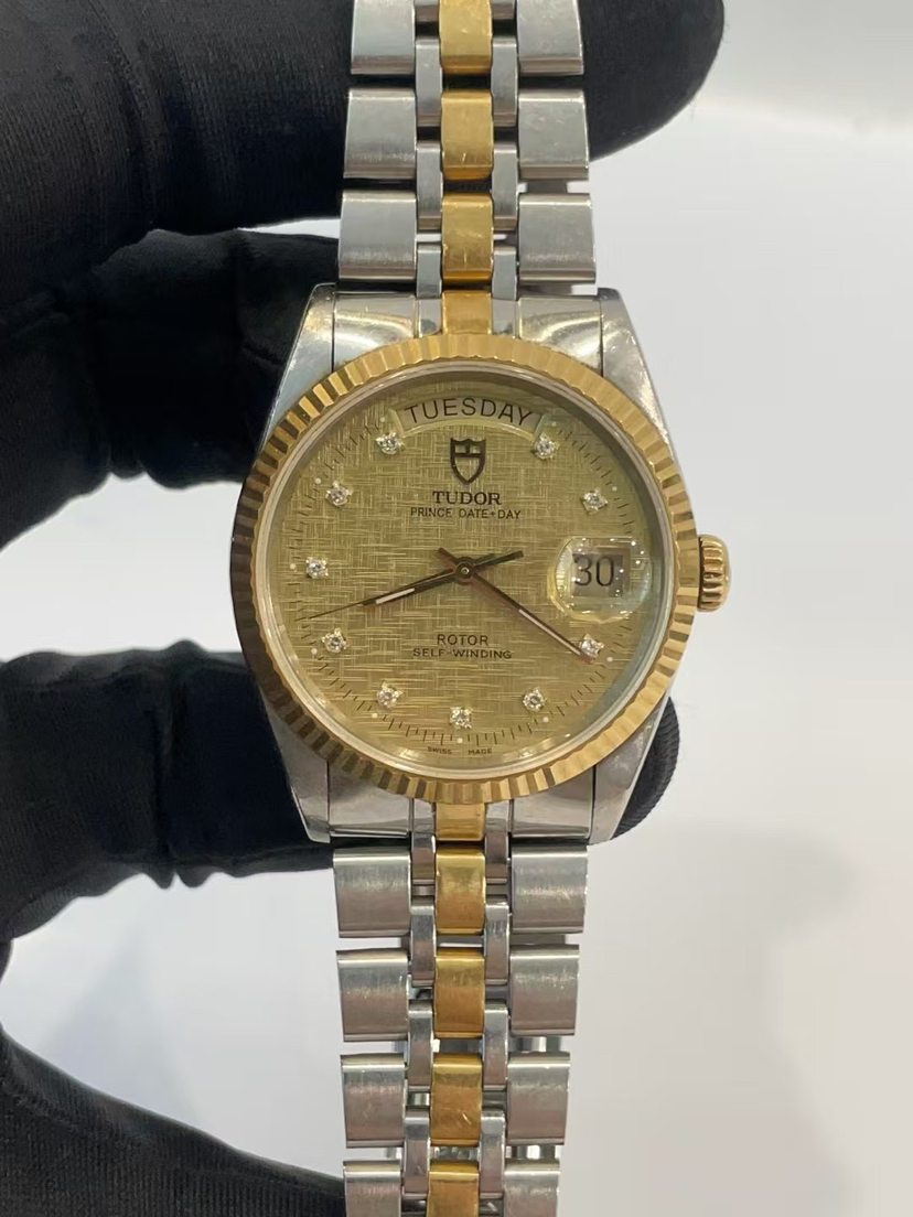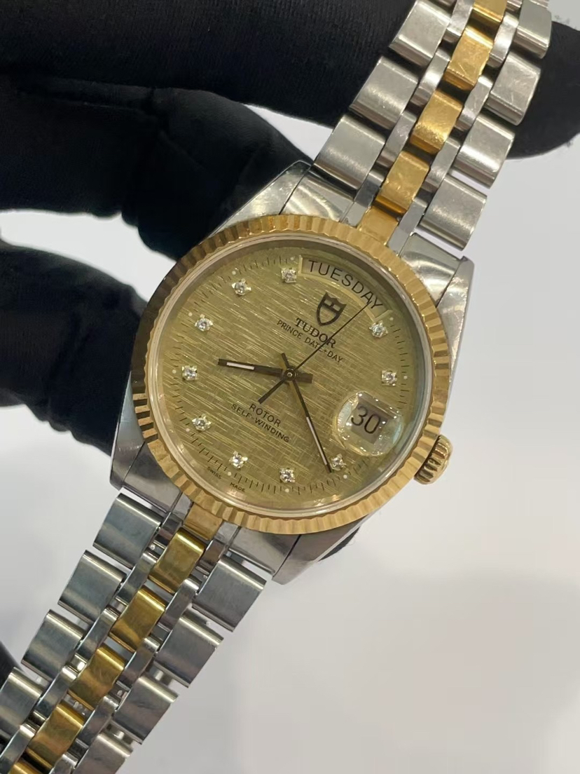 帝舵王子与公主系列m76213-0007自动机械男士腕表,表径36mm,香槟盘,镶钻时标,丝绸纹,18k黄金表圈,日期显示星期显示功能,公价29520元,现货好价