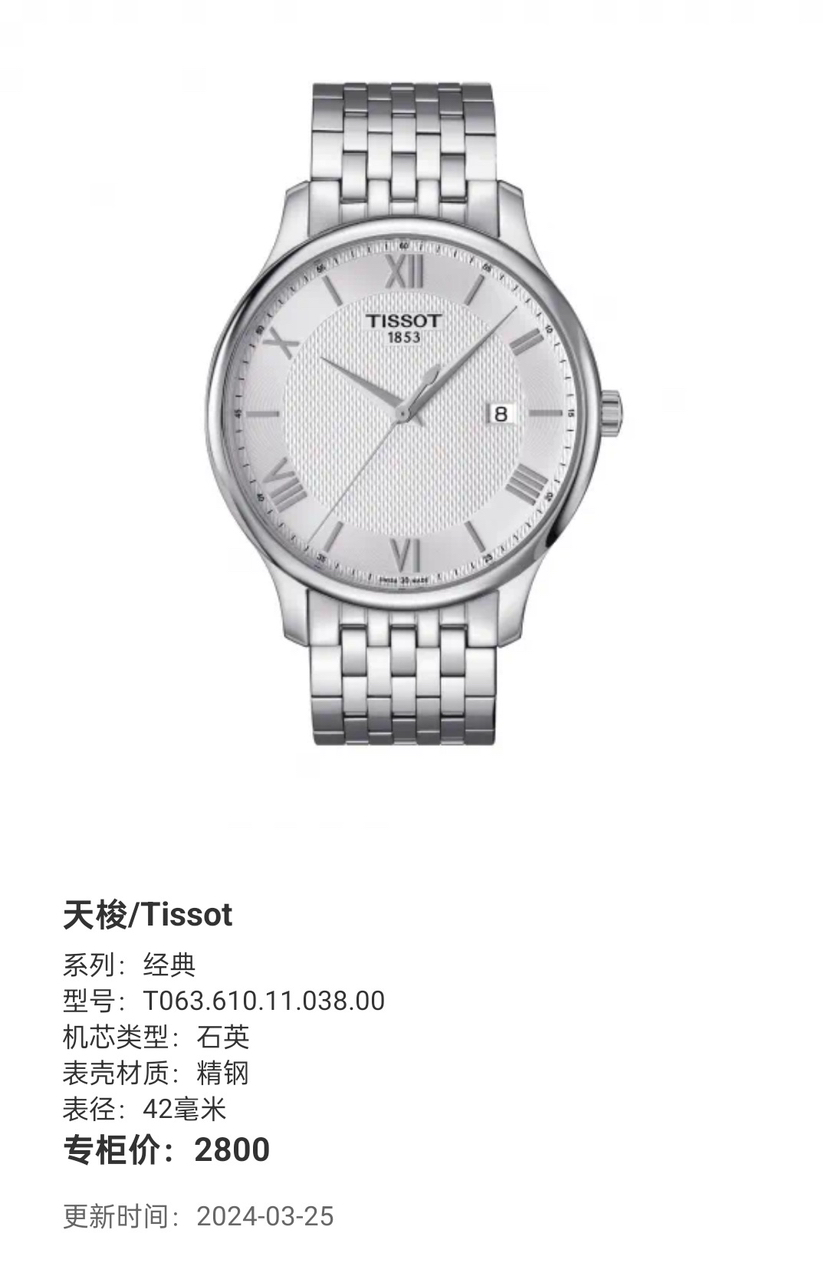 天梭/Tissot 经典 T063.610.11.038.00 石英 精钢 42毫米 专柜价2800