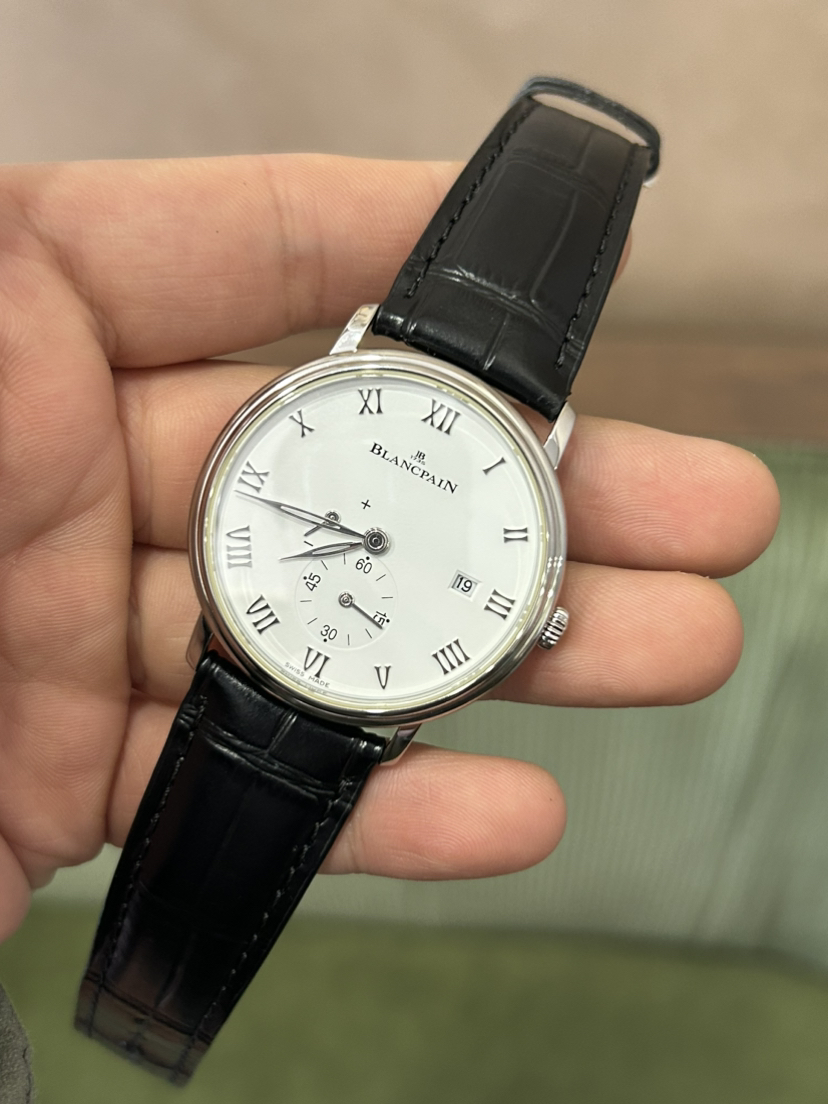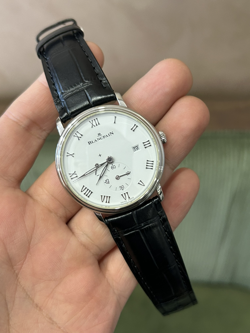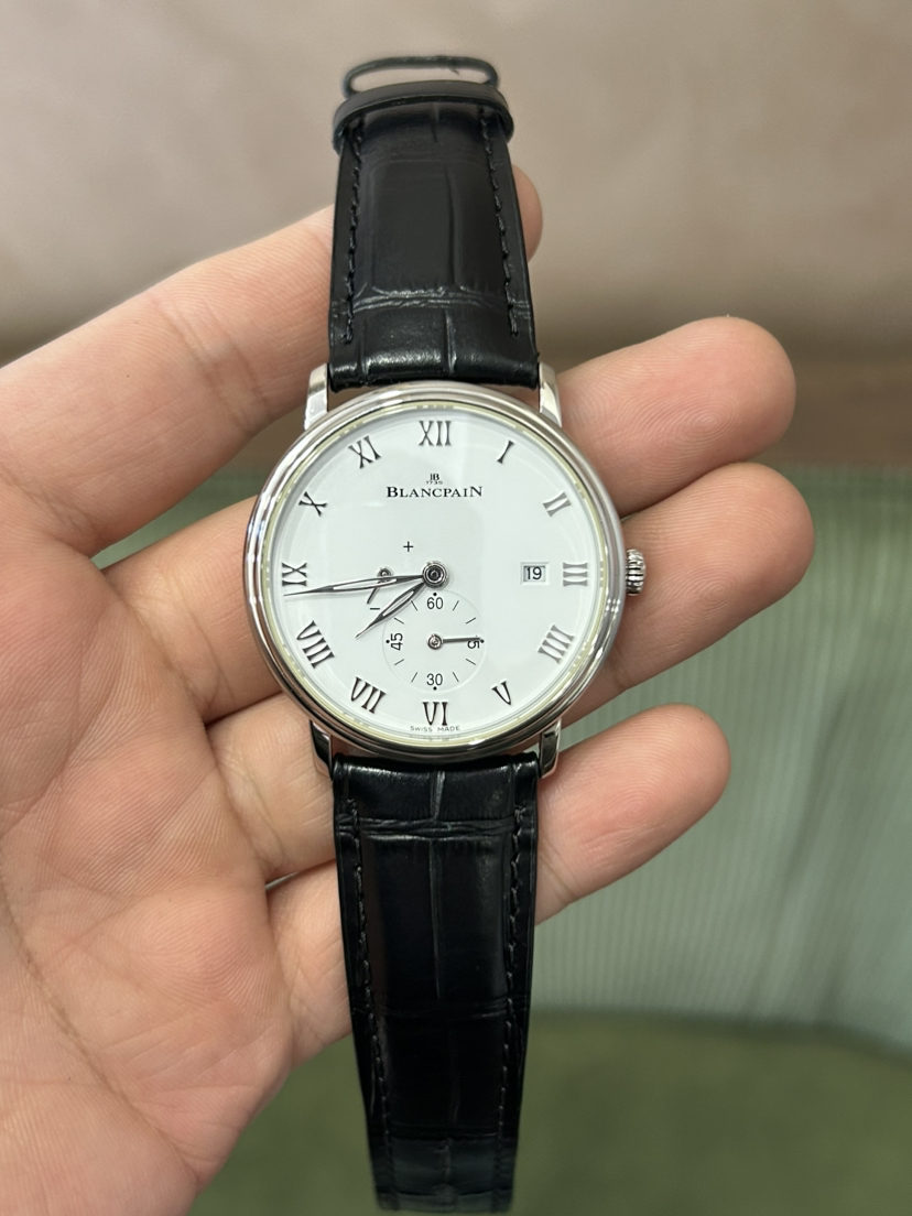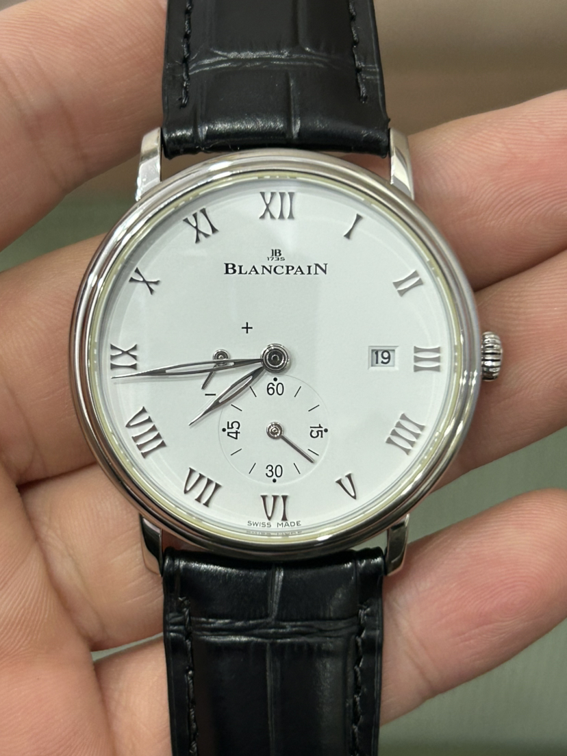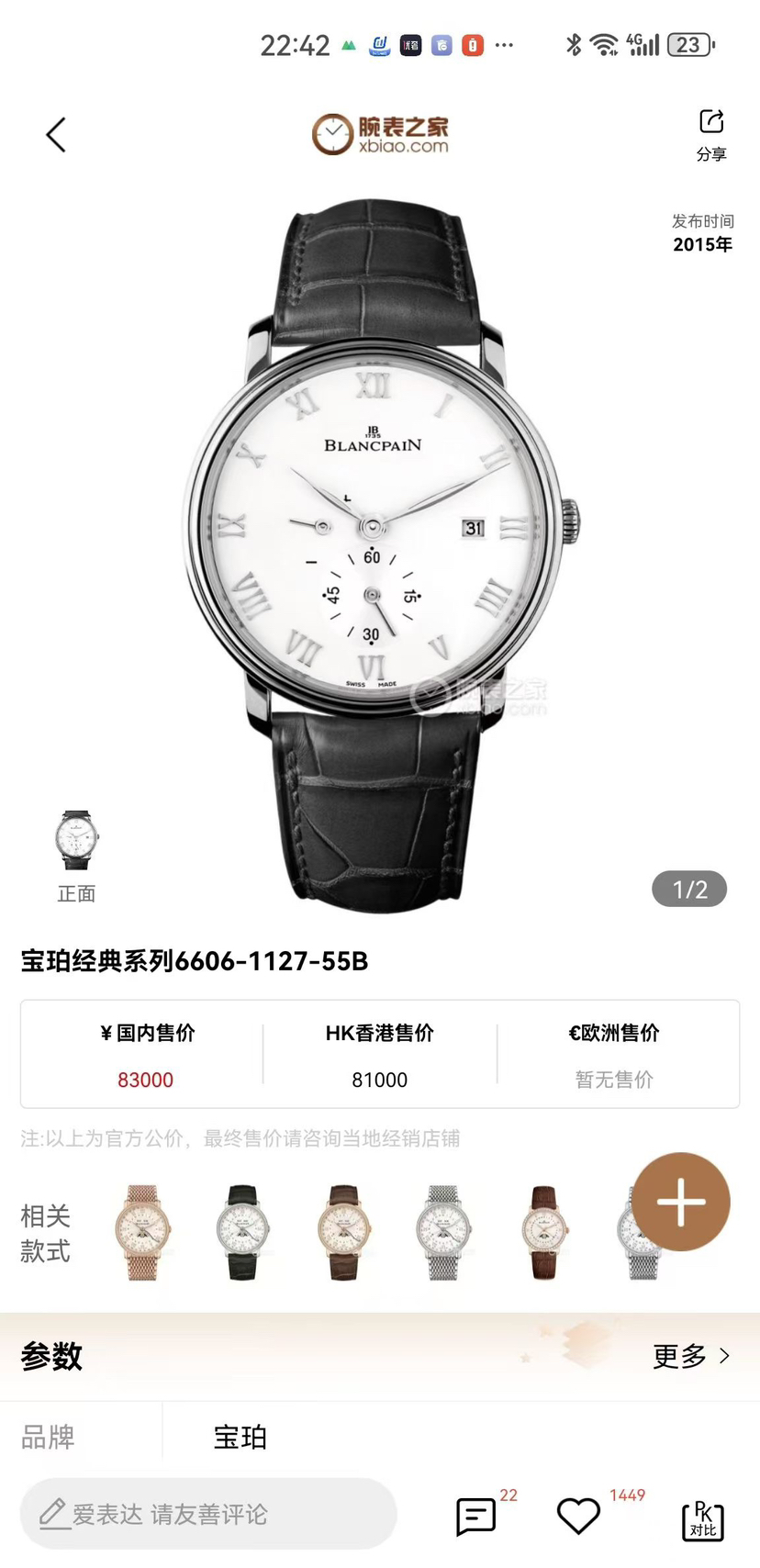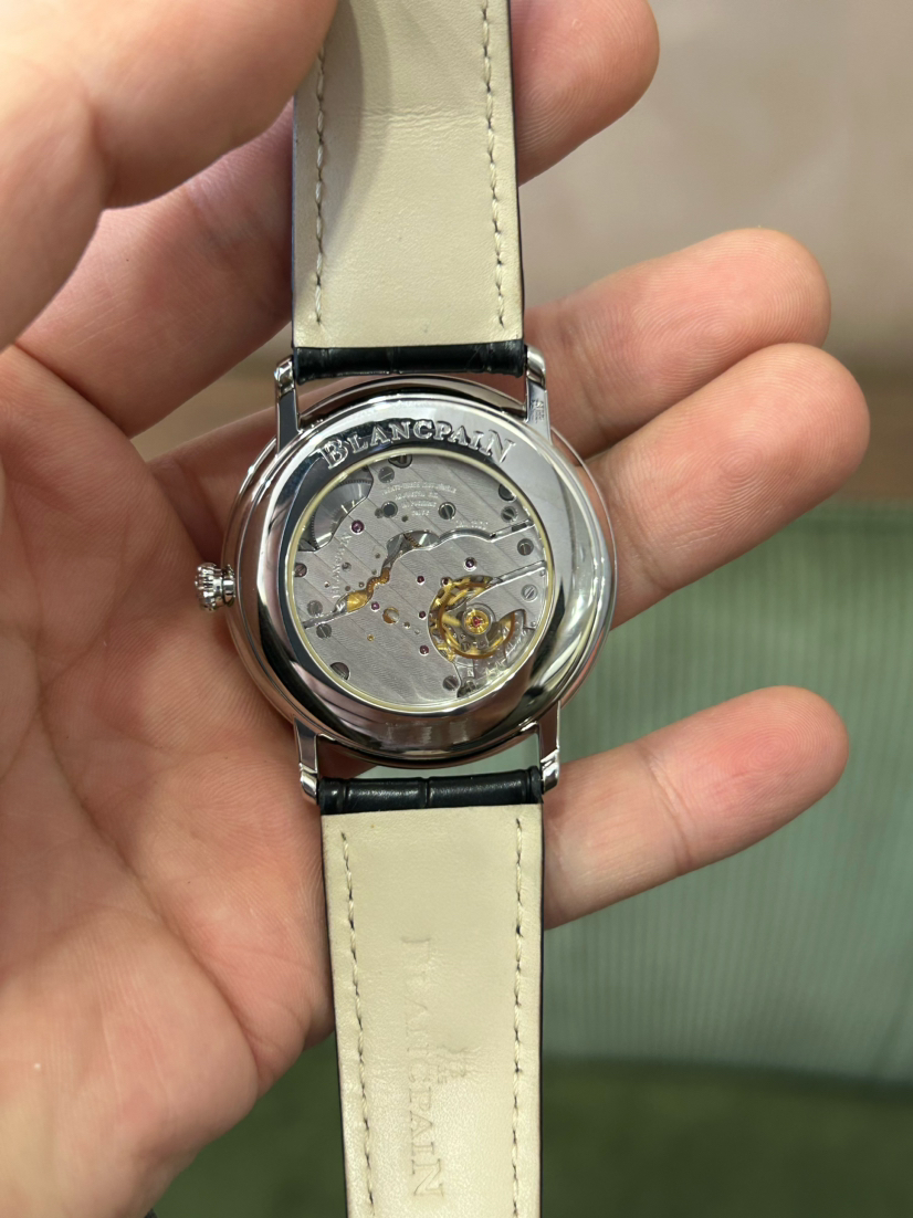 品牌:宝珀 系列:经典系列 型号: 6606-1127-55B 材质:精钢 镜面:蓝宝石玻璃 表盖:透底 表扣:折叠扣 表径:40mmm 机芯类型:手动机械机芯 成色:96新 附件:单表 公价:83000 保修:1年 包回收