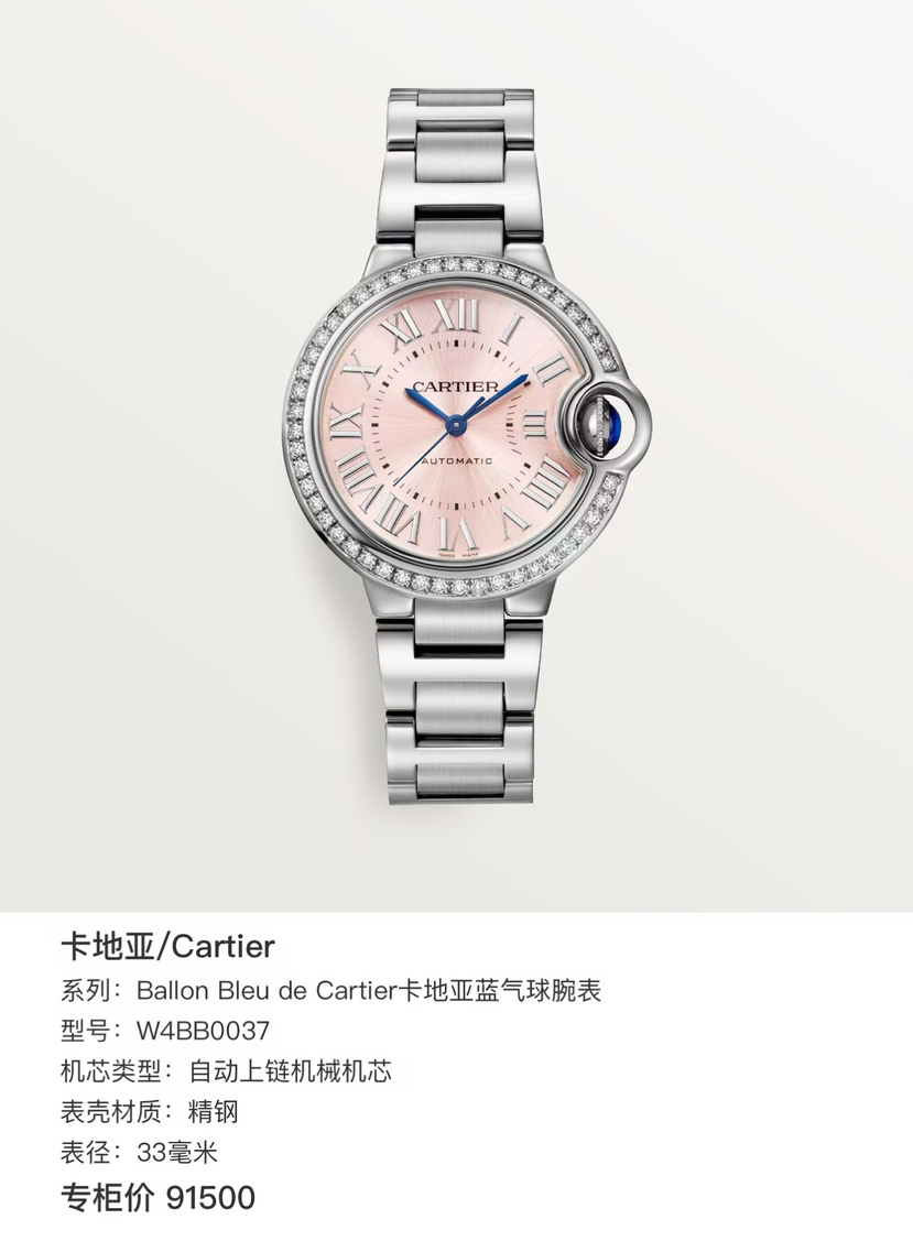卡地亚/Cartier Ballon Bleu de Cartier卡地亚蓝气球腕表 W4BB0037 自动上链机械机芯 精钢 33毫米 专柜价91500~