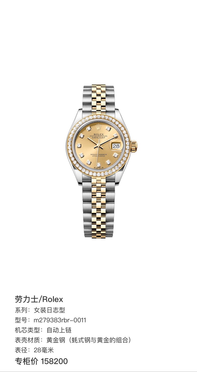 劳力士/Rolex 女装日志型 m279383rbr-0011 自动上链 黄金钢(蚝式钢与黄金的组合) 28毫米 专柜价158200