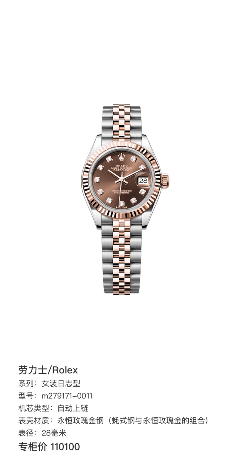 劳力士/Rolex 女装日志型 m279171-0011 自动上链 永恒玫瑰金钢(蚝式钢与永恒玫瑰金的组合) 28毫米 专柜价110100