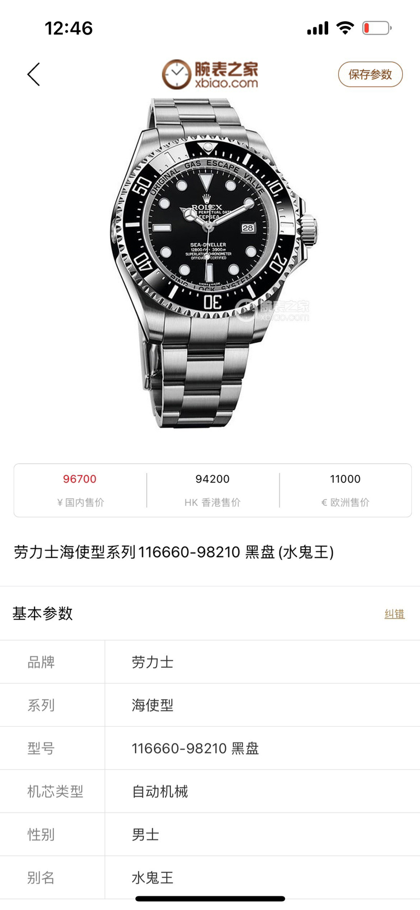 劳力士116660-98210 黑盘水鬼王,单表未使用,海使型系列,44表径,精钢材质,自动机械3135机芯,日期显示,防水性能3900米,表壳厚度17毫米,动力储备48小时,公价96700,现货好价