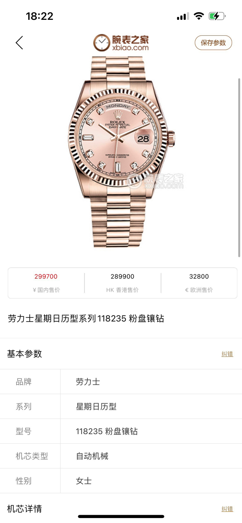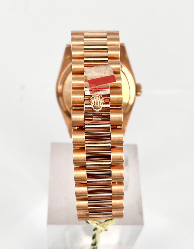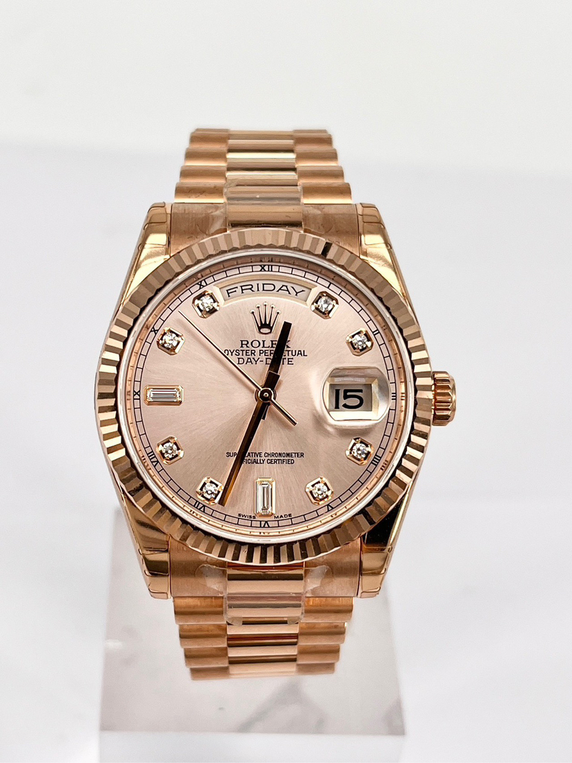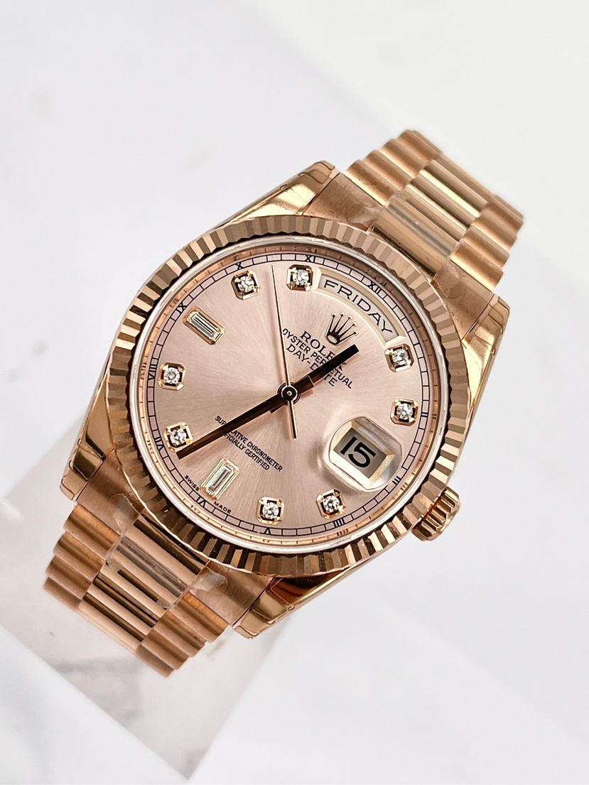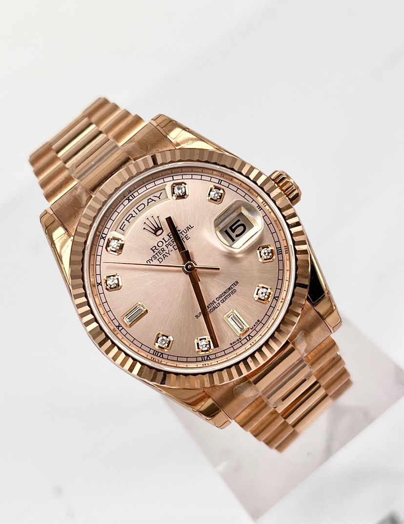 劳力士118235 粉盘镶钻,单表未使用,星期日历型系列,36表径,18K玫瑰金材质,自动机械3155机芯,日期显示,星期显示,公价299700,现货好价