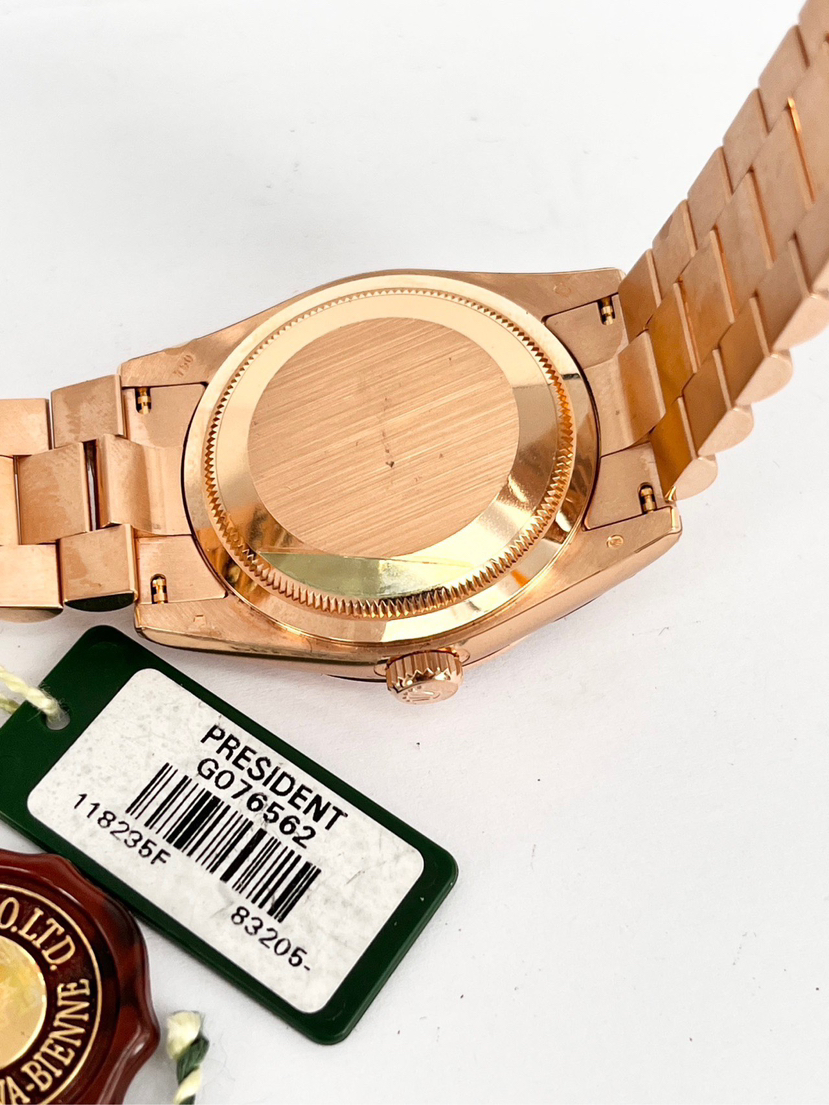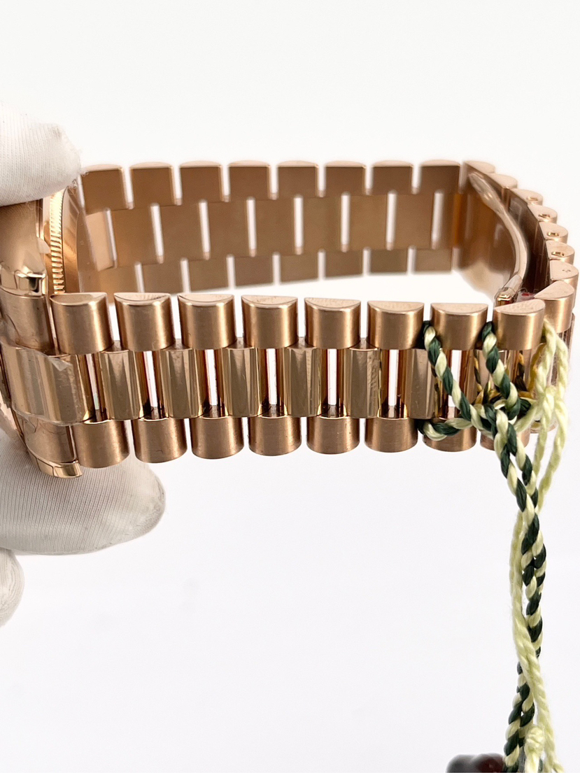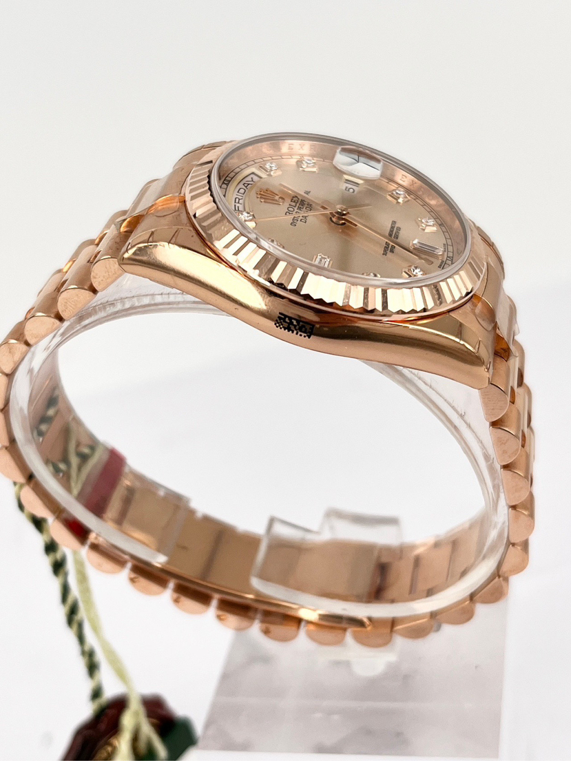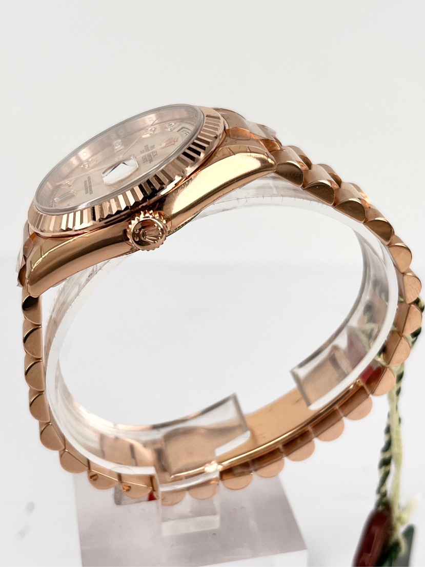 劳力士118235 粉盘镶钻,单表未使用,星期日历型系列,36表径,18K玫瑰金材质,自动机械3155机芯,日期显示,星期显示,公价299700,现货好价