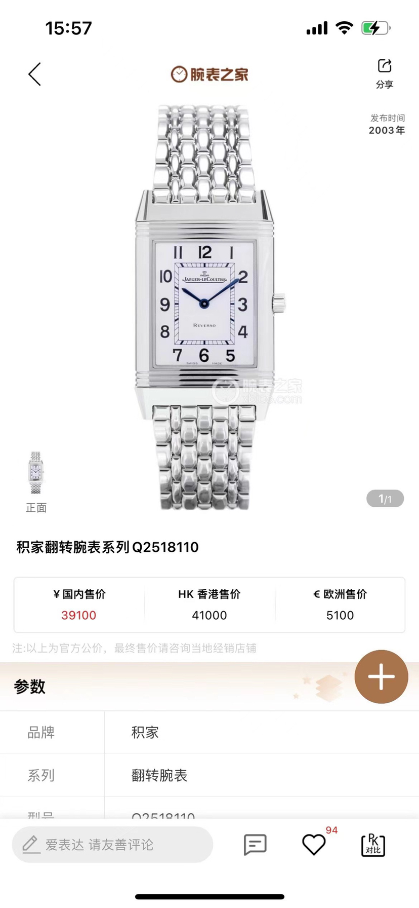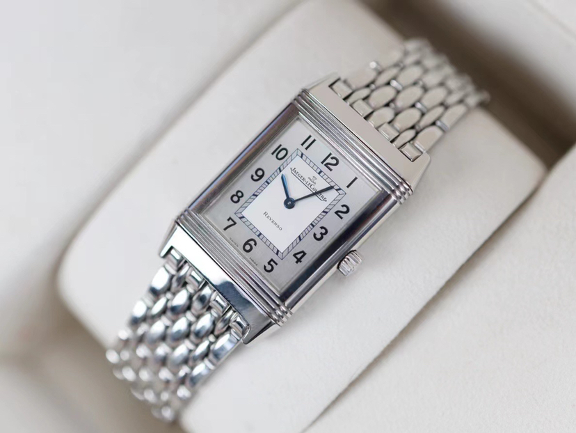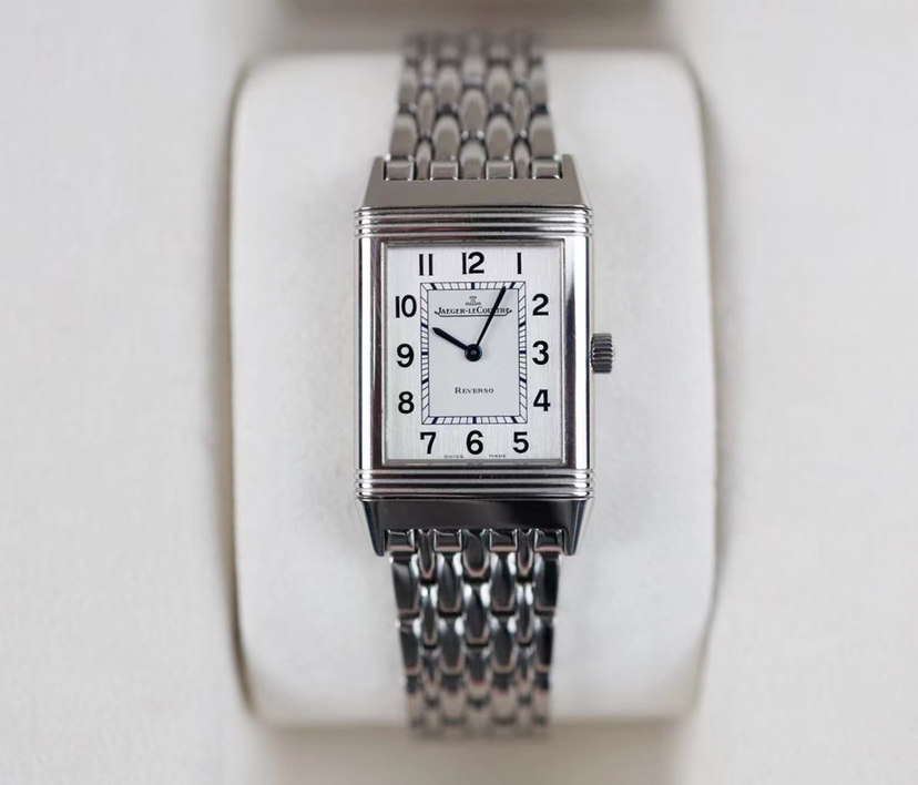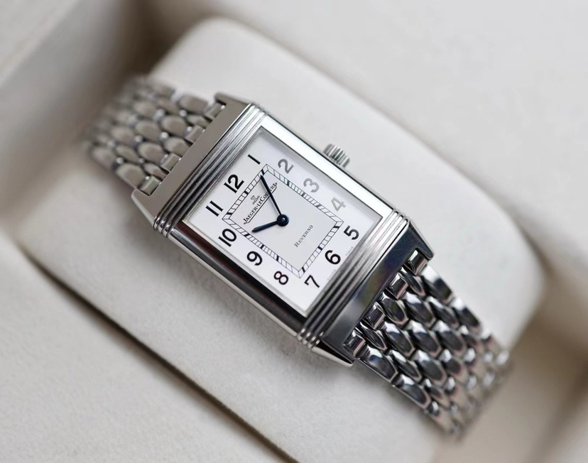 积家翻转系列2518110女士腕表,石英机芯,表径38.5x23mm,精钢材质,银色盘 阿拉伯数字刻度,单表95新,官价39100,现好价 1xxxx