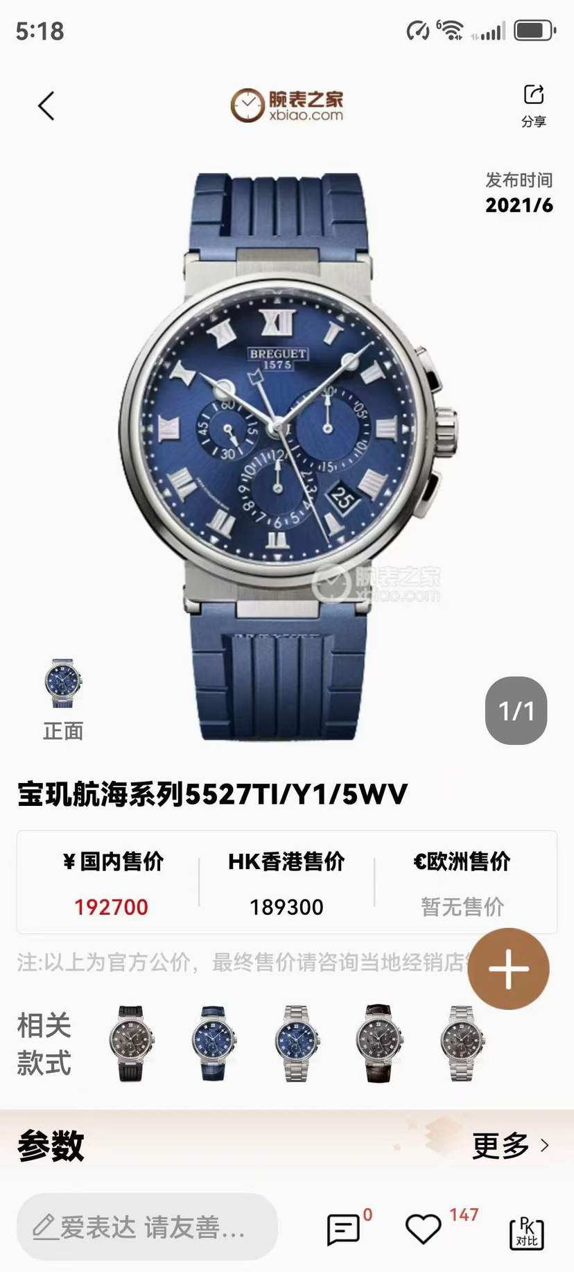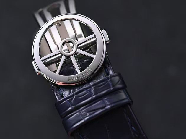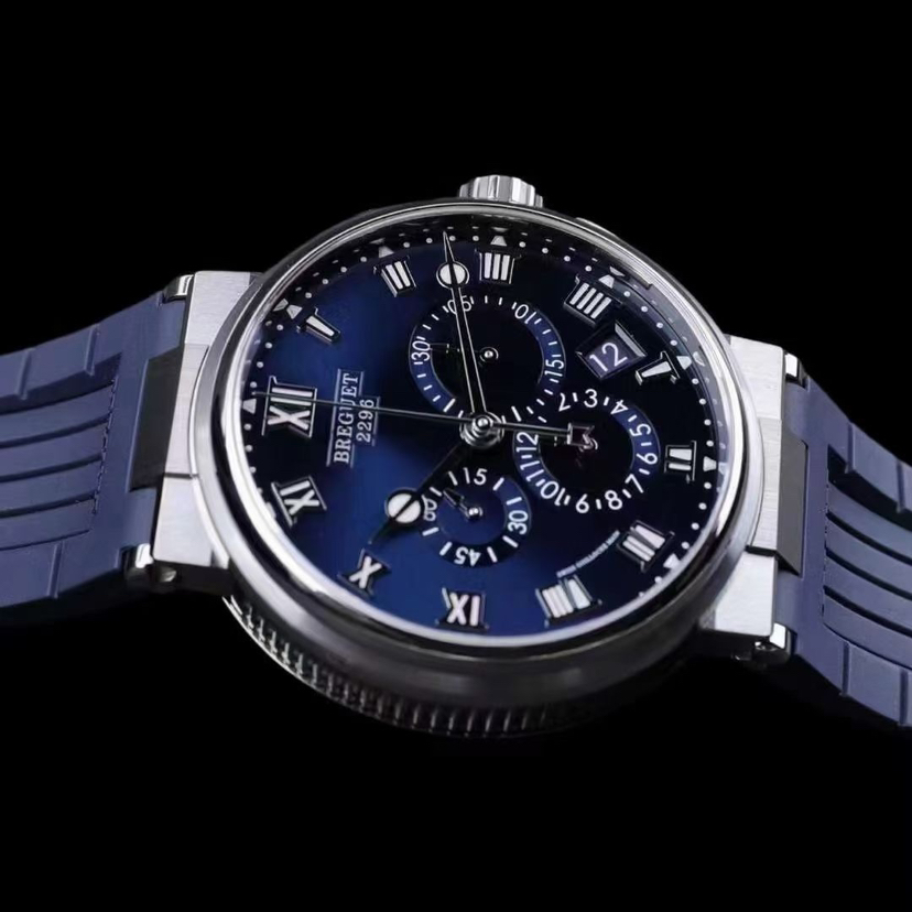 宝玑航海系列5527TI/Y1/5WV这款充满宝玑特色的钱币饰纹,优雅的气质尽展。3、6、9点位各自配有30分钟计时盘、12h计时盘和小秒盘 日期显示 功能完备 蓝色表盘并搭配刻面金质宝玑指针和罗马数字时标,以现代风格焕新演绎宝玑美学元素。搭载的是宝玑自产582QA背透自动上链机械机芯 防水100米。蓝色橡胶表带与表盘相呼应。表扣造型十分别致 以精致细节突显手表的航海渊源。公价192700