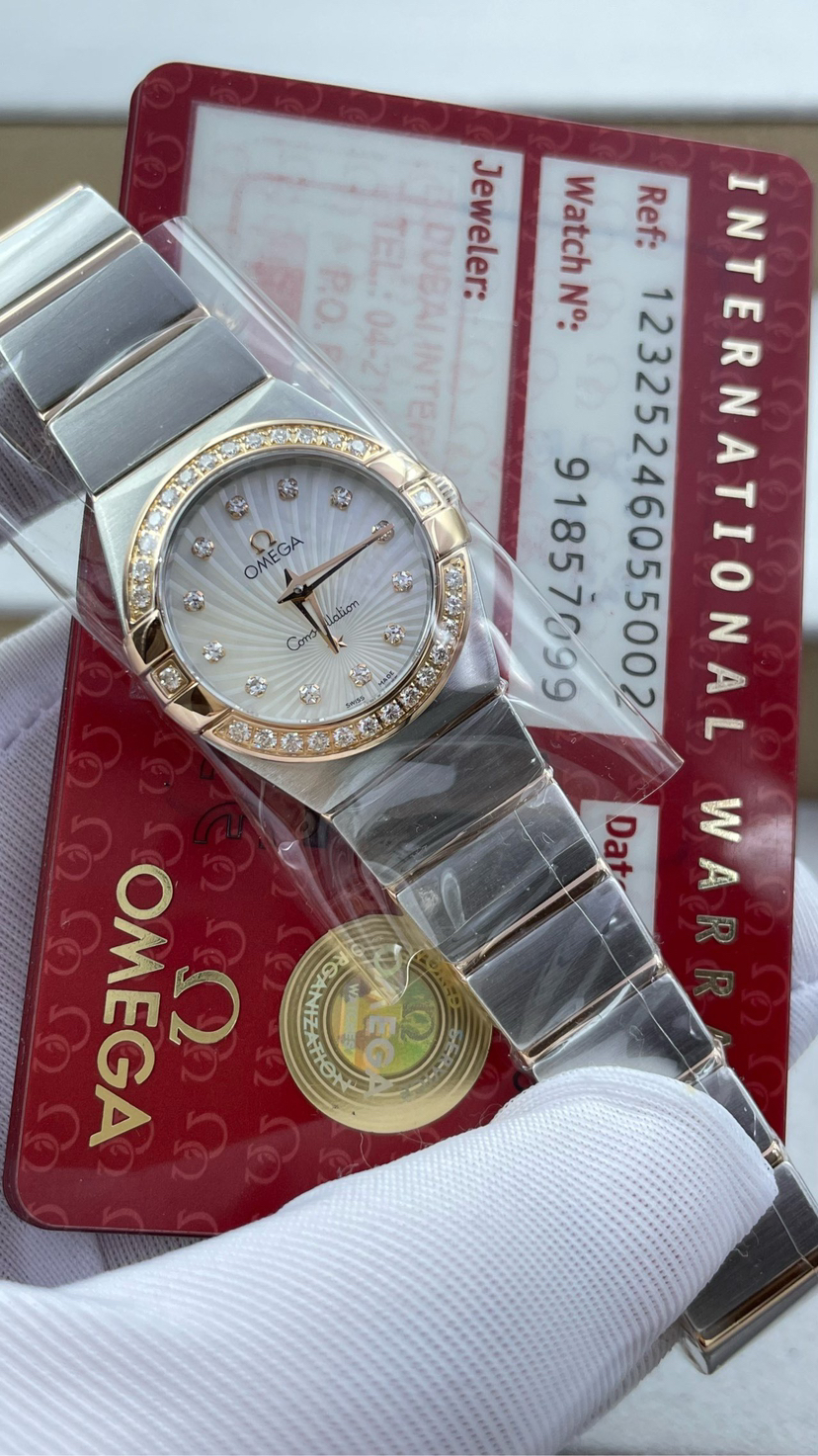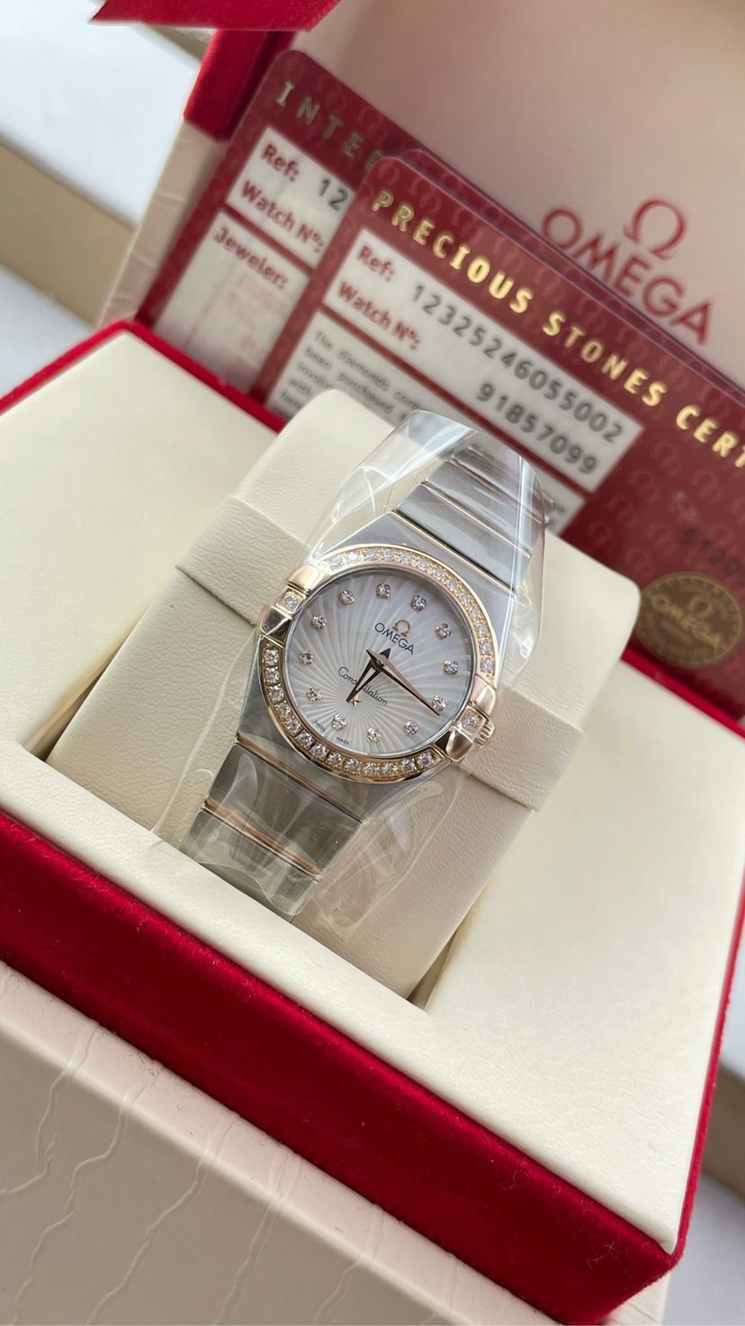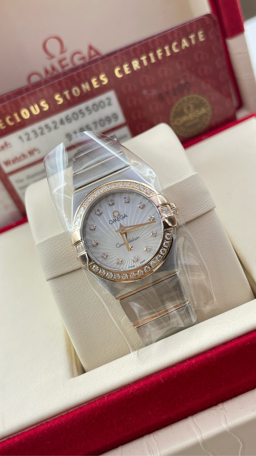 欧米茄123.25.24.60.55.002四代星座系列女表 24毫米表盘 18k玫瑰金色 天然珍珠盘面光芒放射纹贝壳盘 vvs天然真钻石刻度 vvs天然真钻石圈口 里外原镶钻 蓝宝石镜面 搭载欧米茄Cal.1376瑞士原装机芯 底盖八位钢印身份证号90799658清晰可见 盒子 保卡 证书齐全 近全新未使用状态大全套