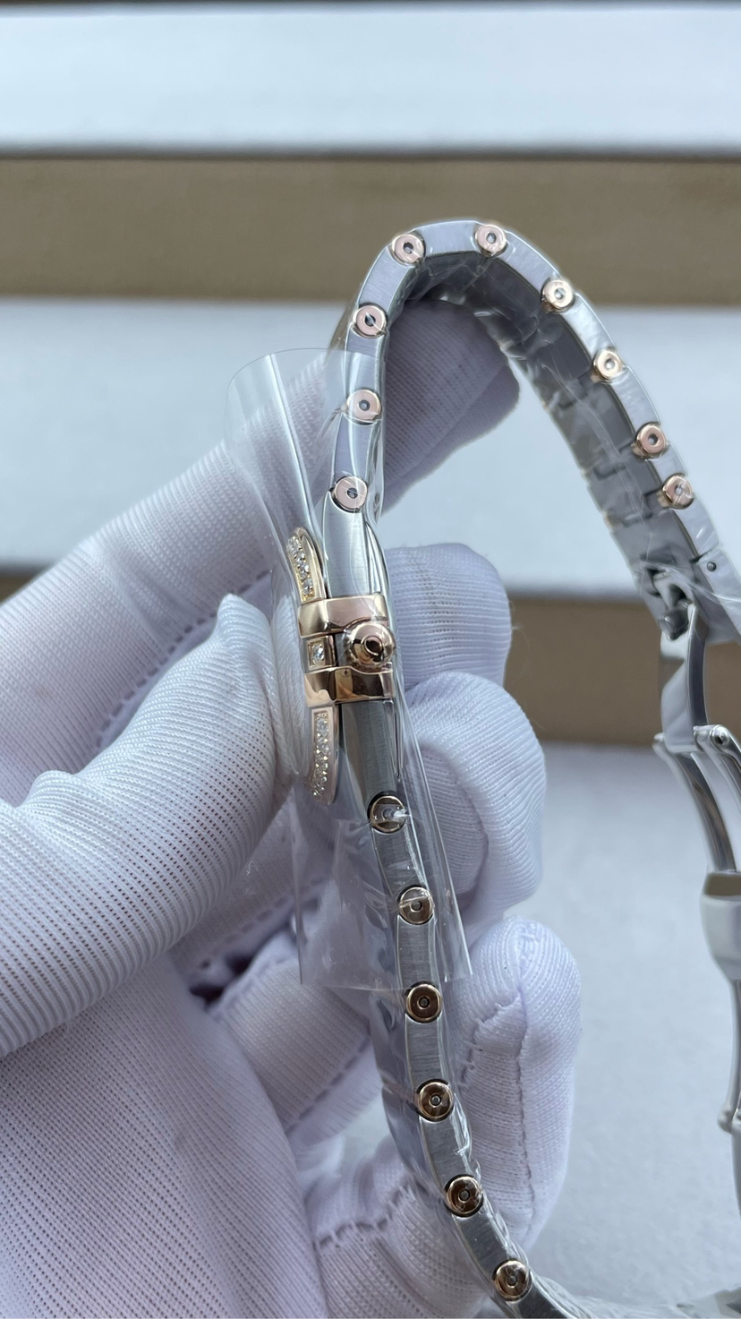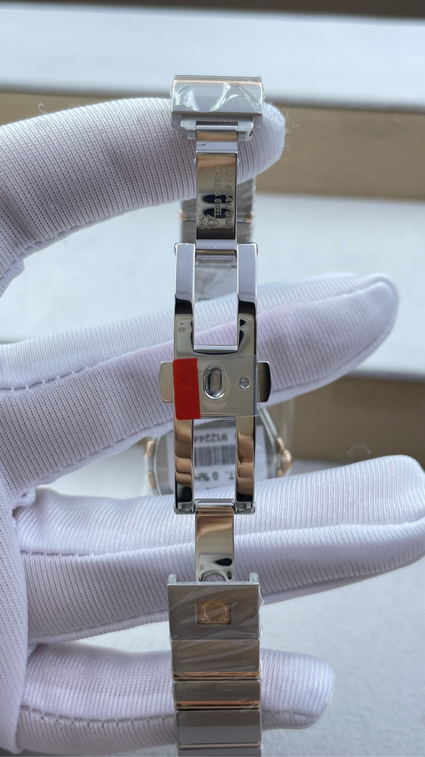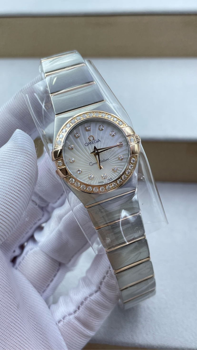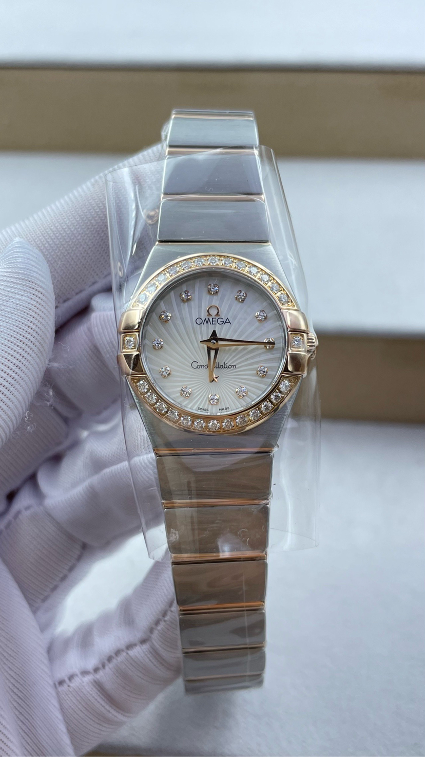 欧米茄123.25.24.60.55.002四代星座系列女表 24毫米表盘 18k玫瑰金色 天然珍珠盘面光芒放射纹贝壳盘 vvs天然真钻石刻度 vvs天然真钻石圈口 里外原镶钻 蓝宝石镜面 搭载欧米茄Cal.1376瑞士原装机芯 底盖八位钢印身份证号90799658清晰可见 盒子 保卡 证书齐全 近全新未使用状态大全套
