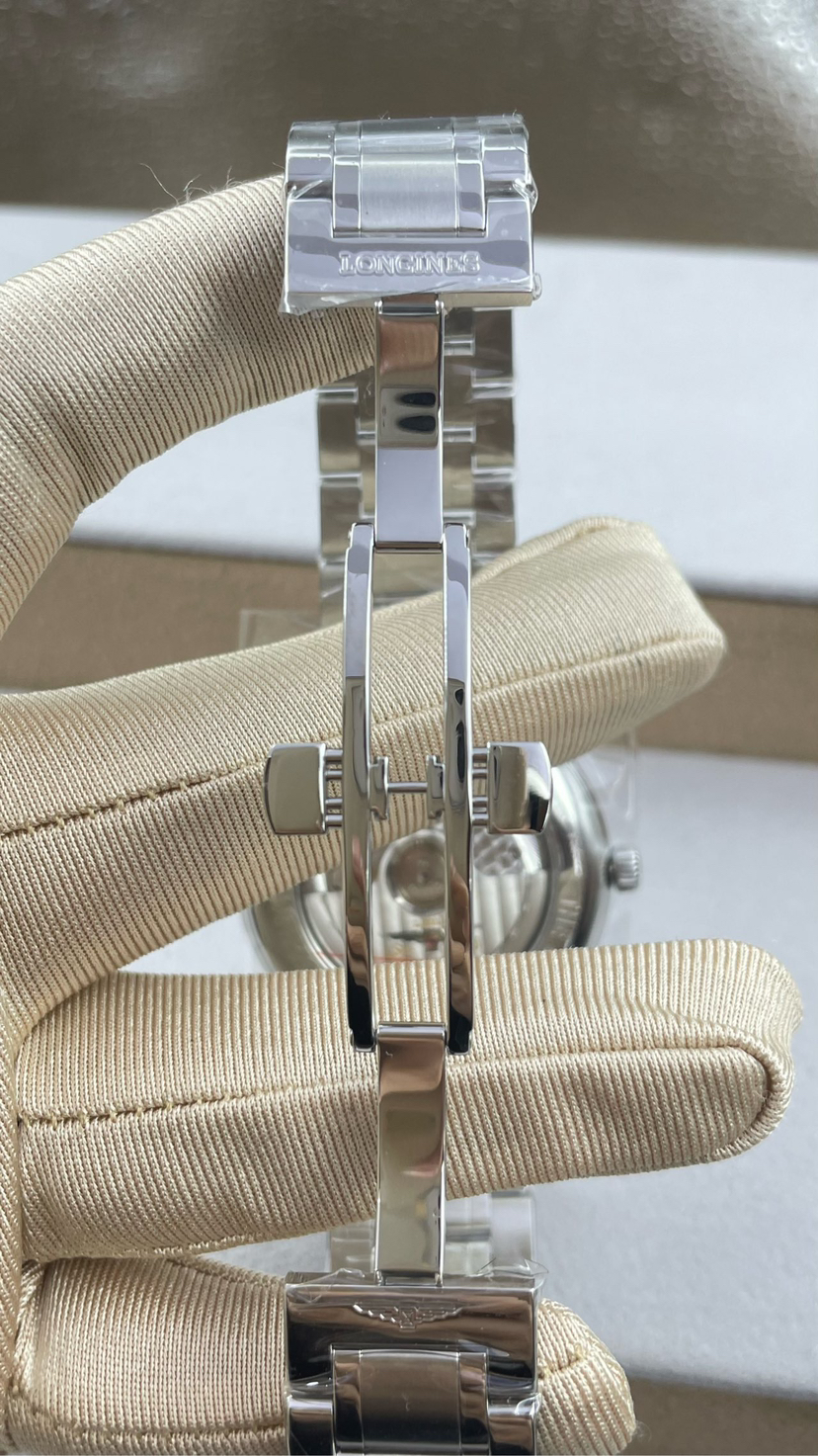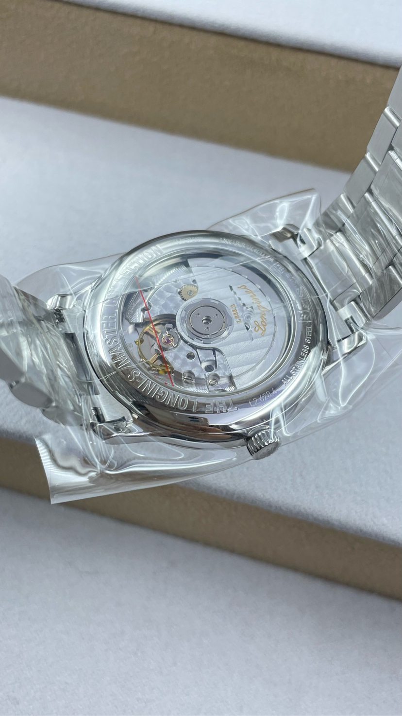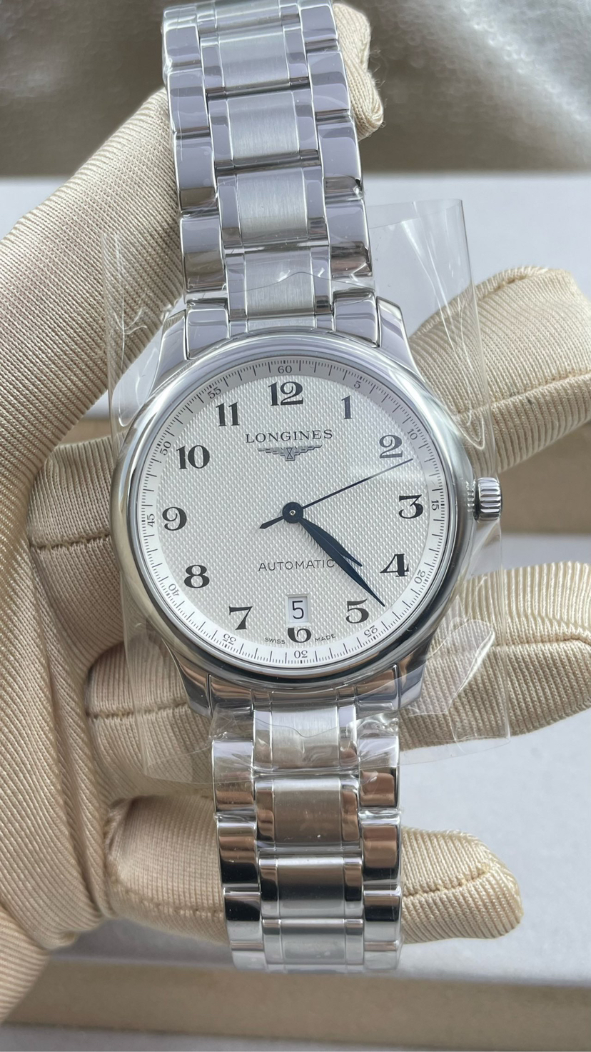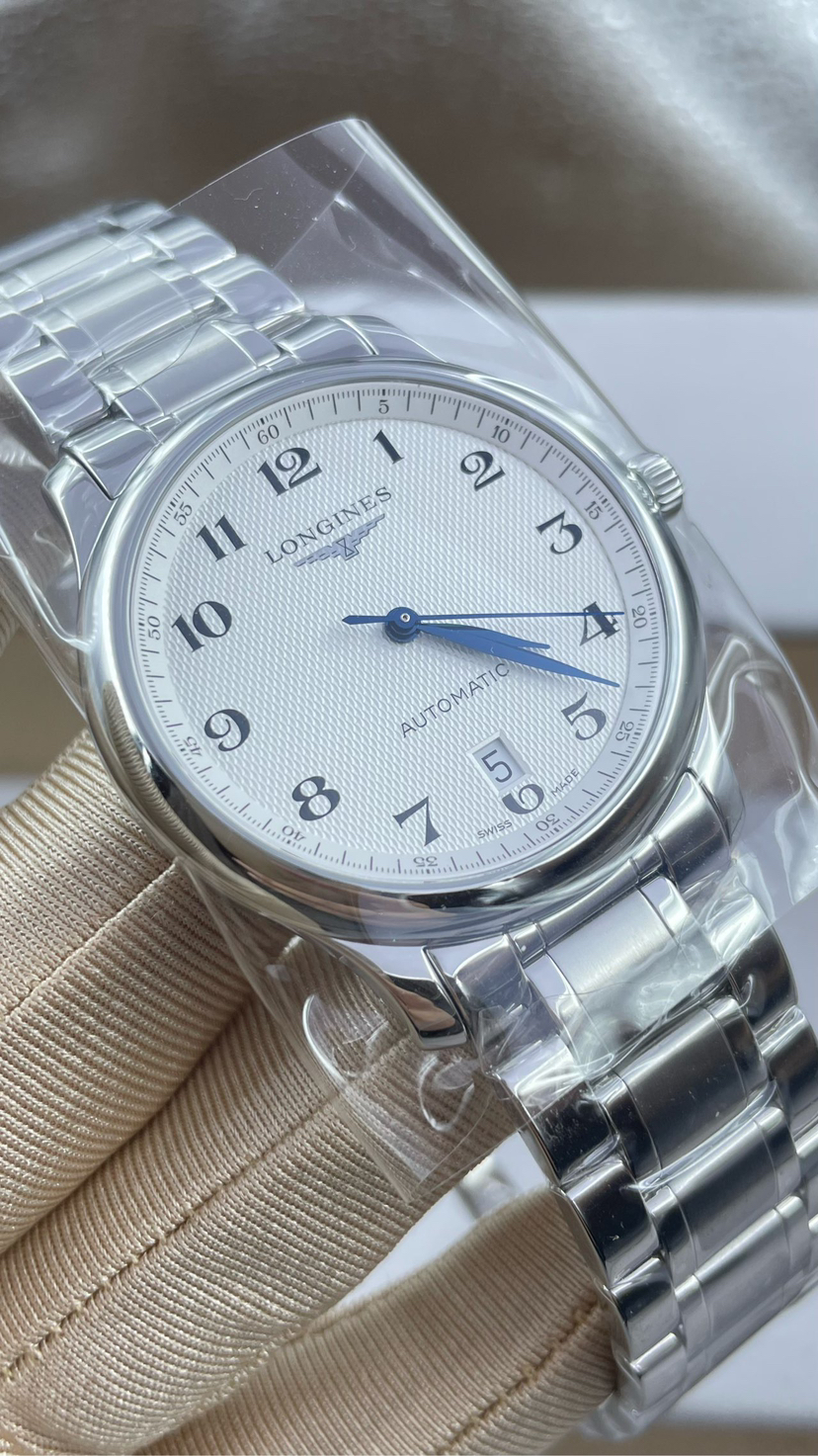 浪琴名匠系列机械全自动精钢男表 38.5毫米超大号表盘 L2.628.4.78.6白色大麦纹盘面 淬火烤蓝柳叶指针 黑色经典阿拉伯数字刻度 带日历显示 蓝宝石镜面 搭载浪琴背透机械全自动L888.2最新款机芯 盒子 保卡 证书齐全 99新状态大全套