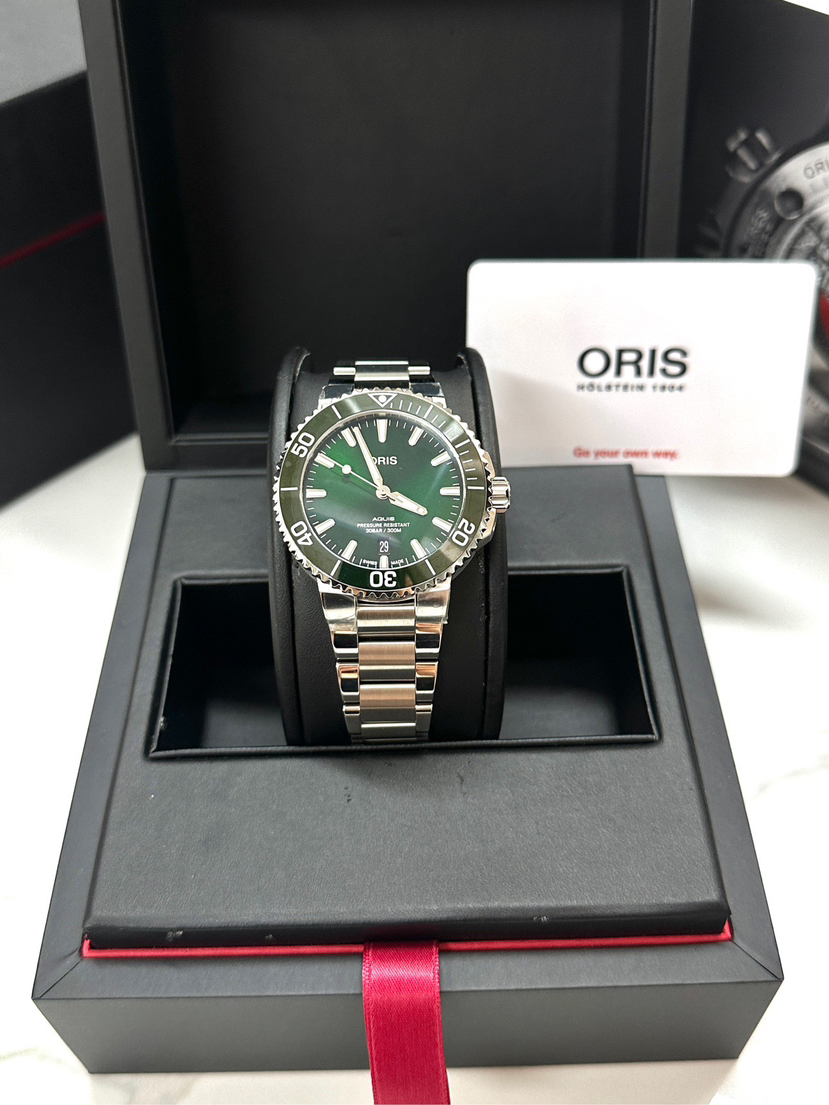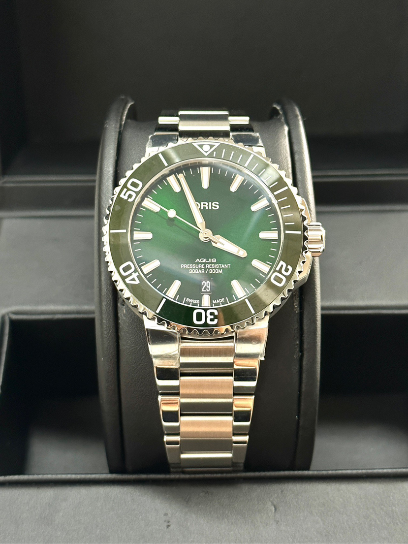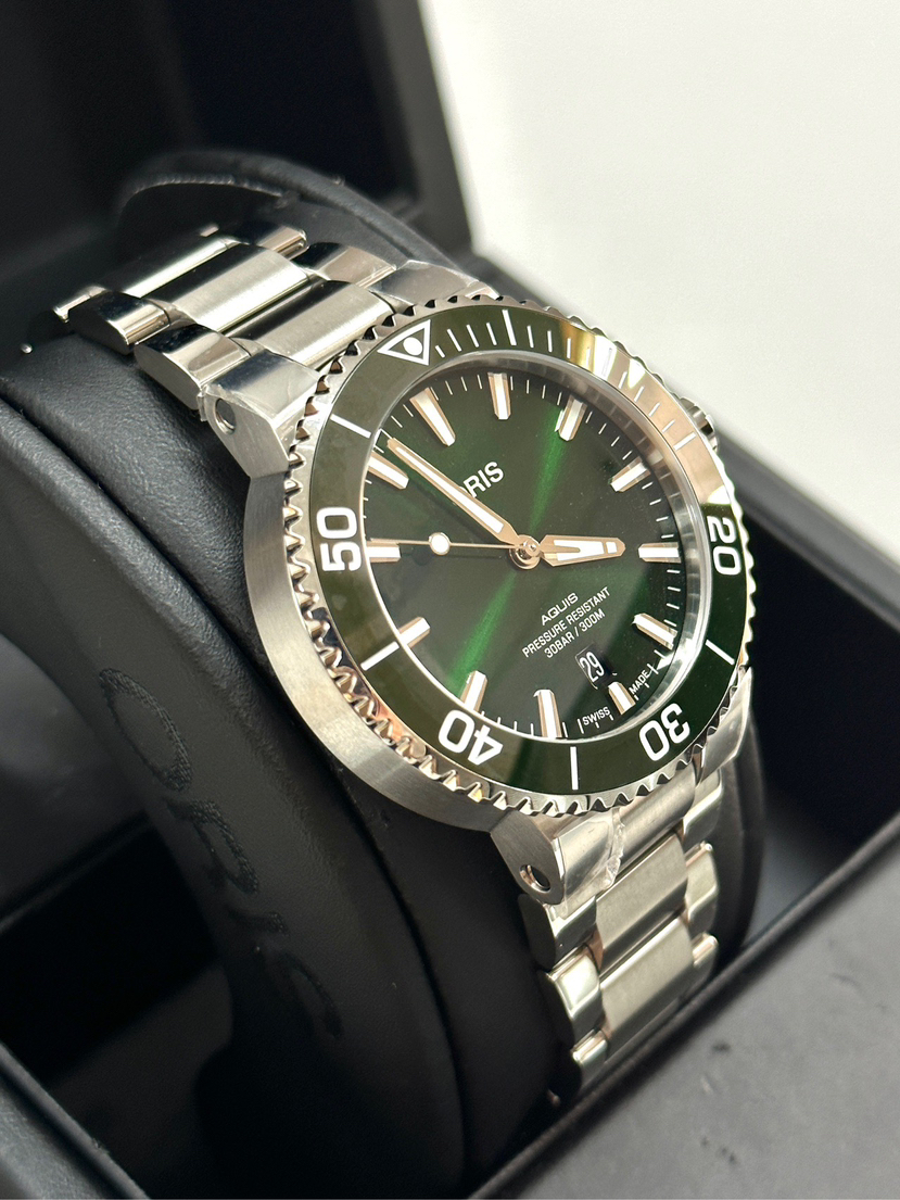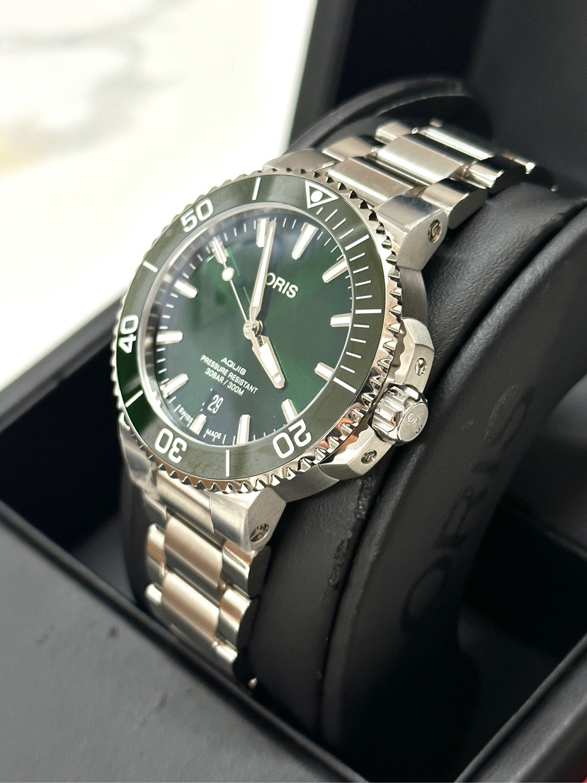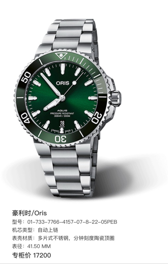 ORIS豪利时瑞士手表男潜水机械腕腕表01-733-7766-4157-07-8-22-05PEB 豪利时绿水鬼 41.5mm表头 背透设计自动机械机芯 亲民的价格 一抹靓丽的绿色 让烦躁的夏天多了一丝凉意 价格喜人 现国行全新全套带票 官方公价17200 超级好折扣 送礼佳品~