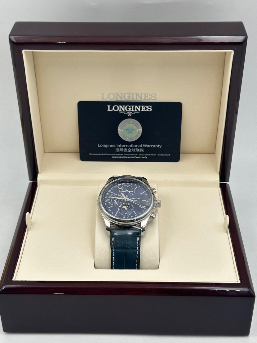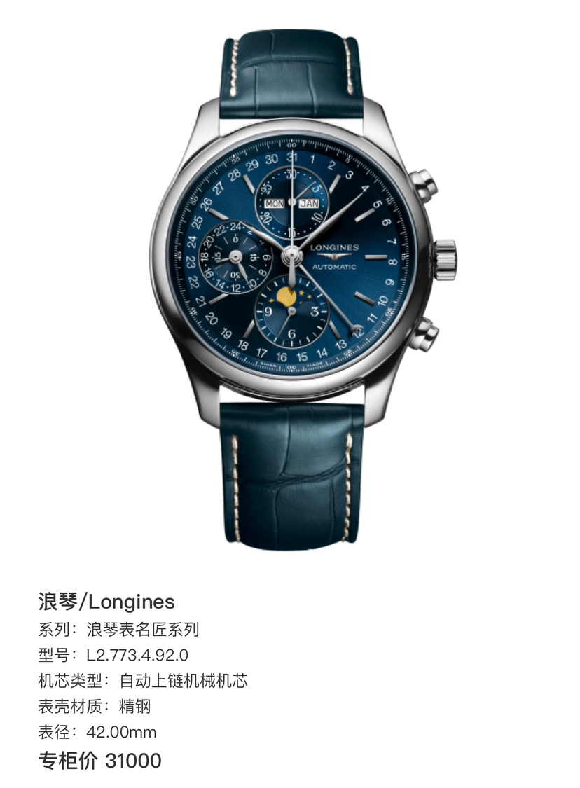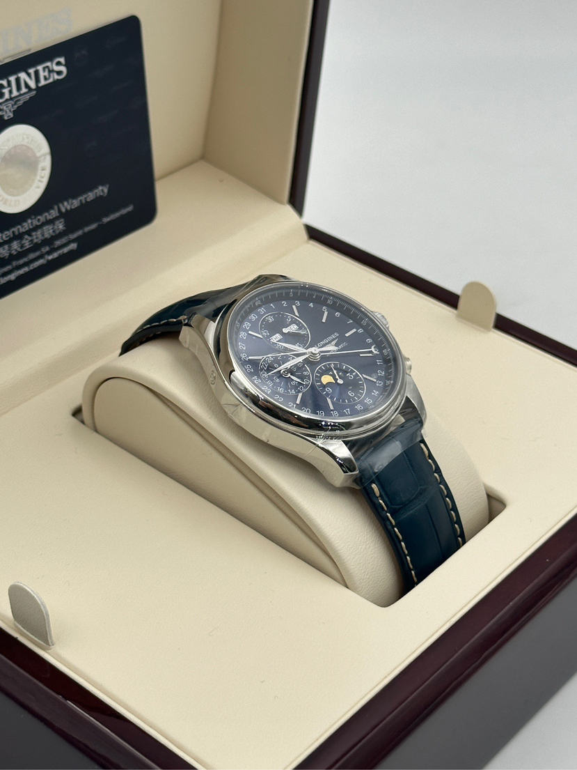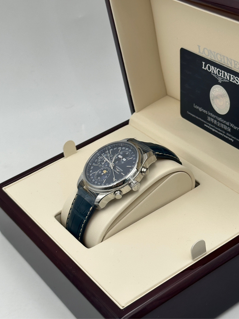国行当天卡 浪琴制表传统系列 型号L2.773.4.92.0 八针月相 42表径 精钢材质 自动机械 日期显示 月份显示 月相显示 计时码表功能 最美蓝盘公价31000
