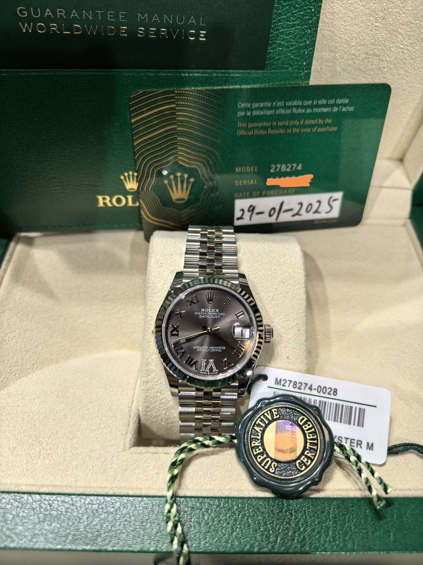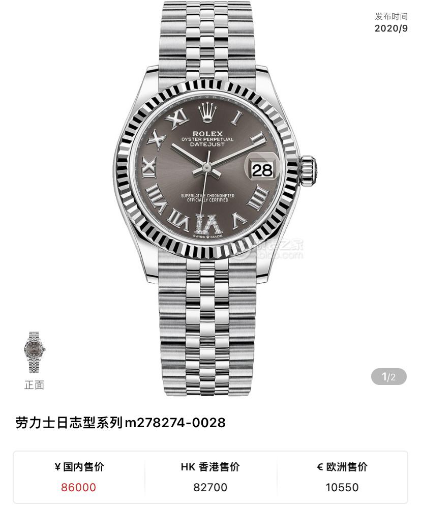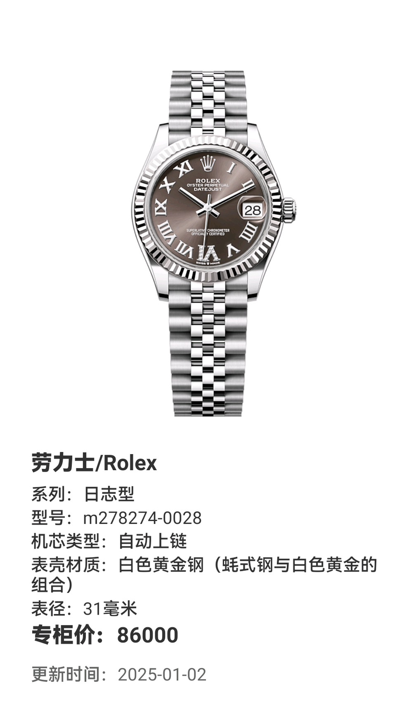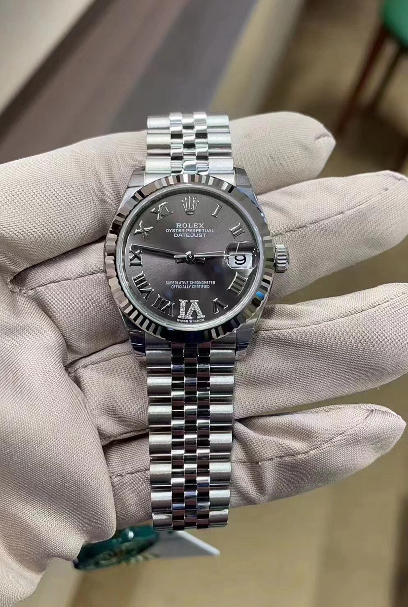 大年初一卡31mm六点V钻 劳力士278274-0028灰罗马 罗马刻度复古感十足,六点放大钻石刻度,深色系表盘更显的肤白 表径31mm 公价86000