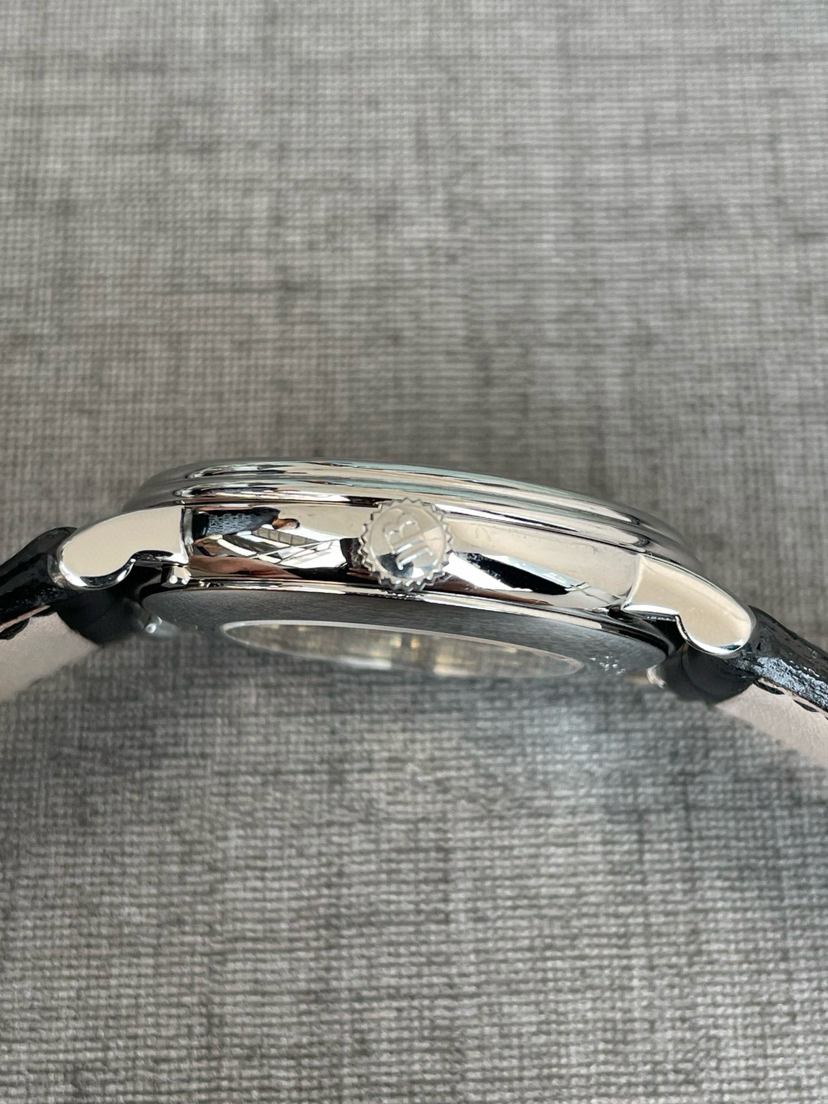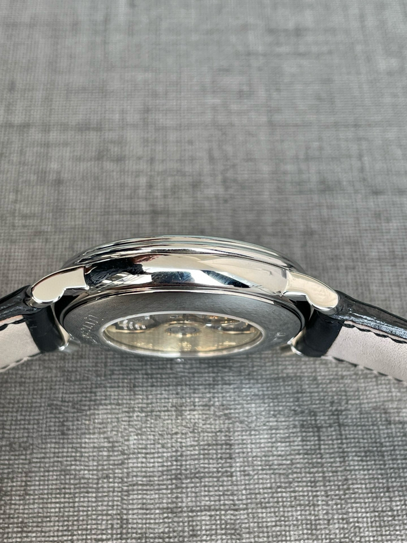 经典系列超薄飞返逆跳机械表,40mm白色表盘,银色刻度指针,蓝色日历针,飞返逆跳小秒针,精钢打造,超薄设计,搭载背透自产7663Q.4自动上链机芯,折叠表扣!