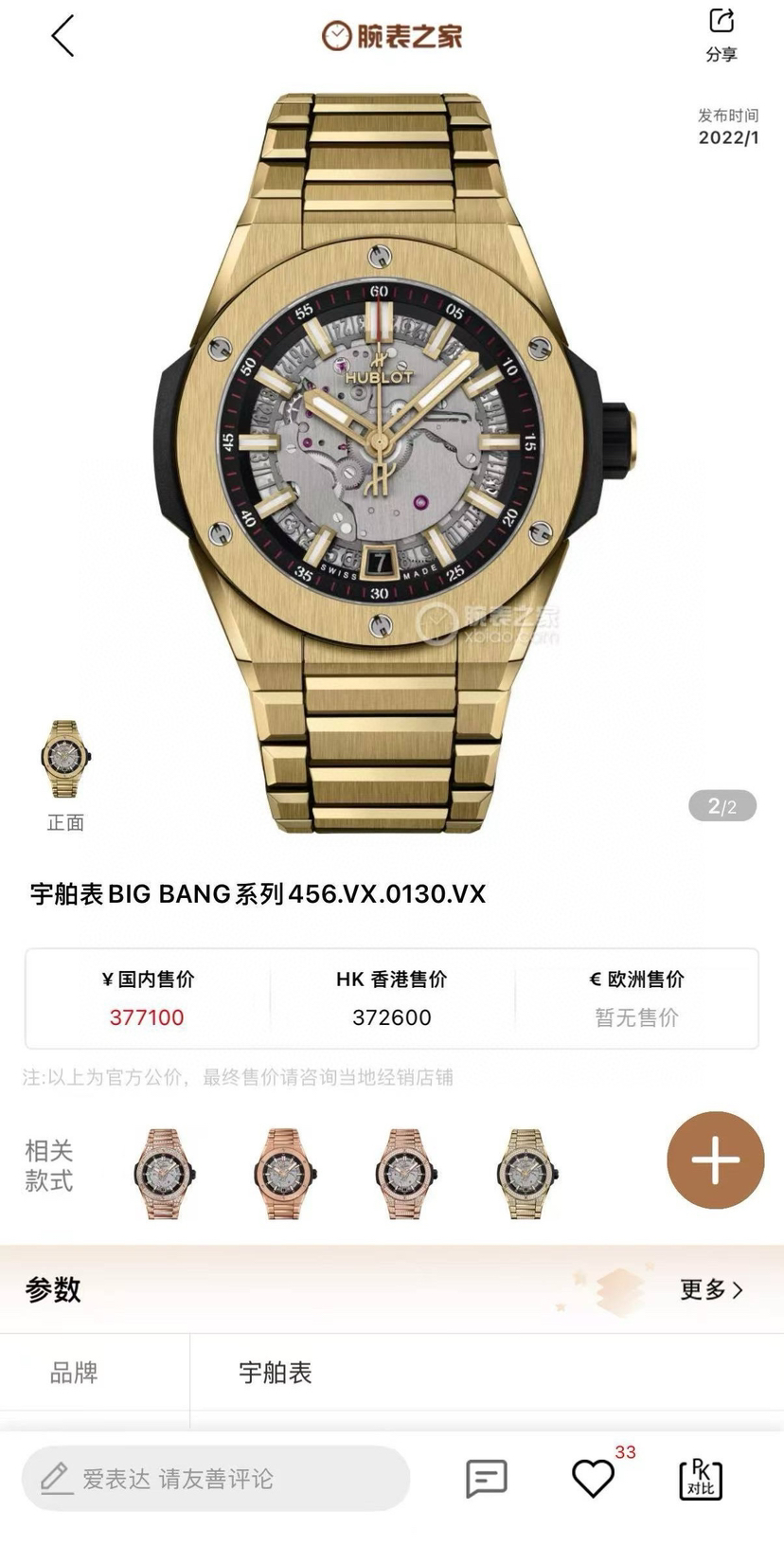 宇舶/Hublot Big Bang系列 456.VX.0130.VX 自动机械男表 18K黄金材质 40MM表径 2025年全新未使用2月卡 公价:377100 好价~