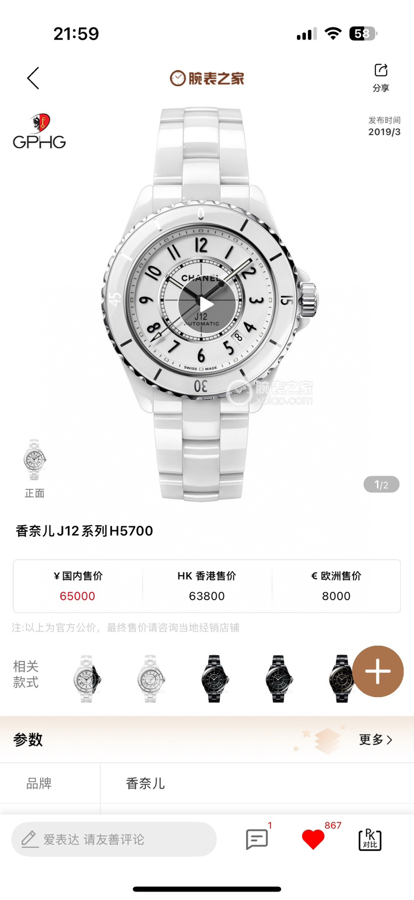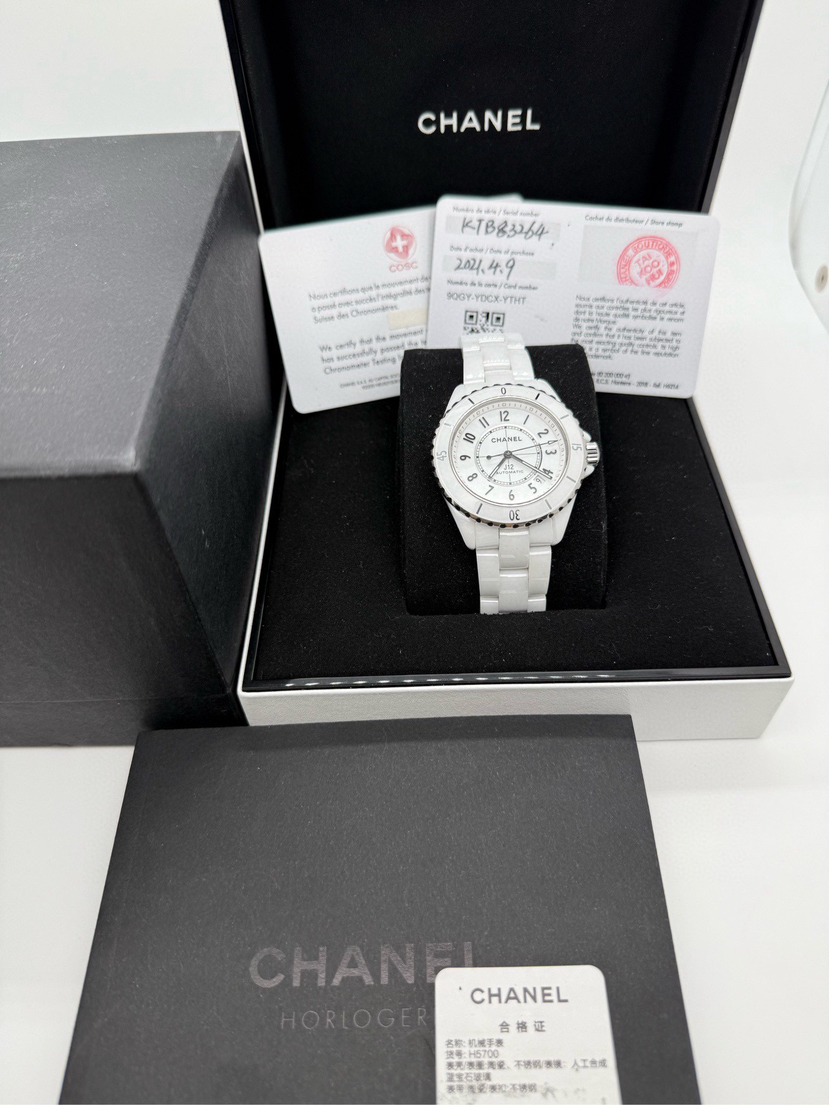 香奈儿J12系列 H5700,21年4月国专极品全套,表径38,新款透底机芯,整体白陶瓷材质不磨损,公价65000