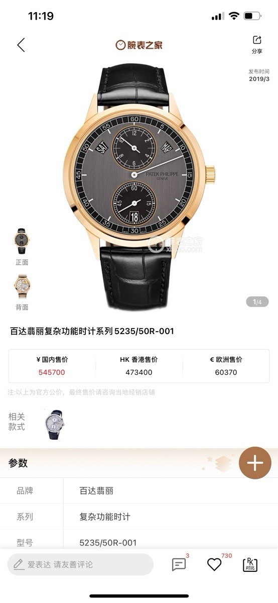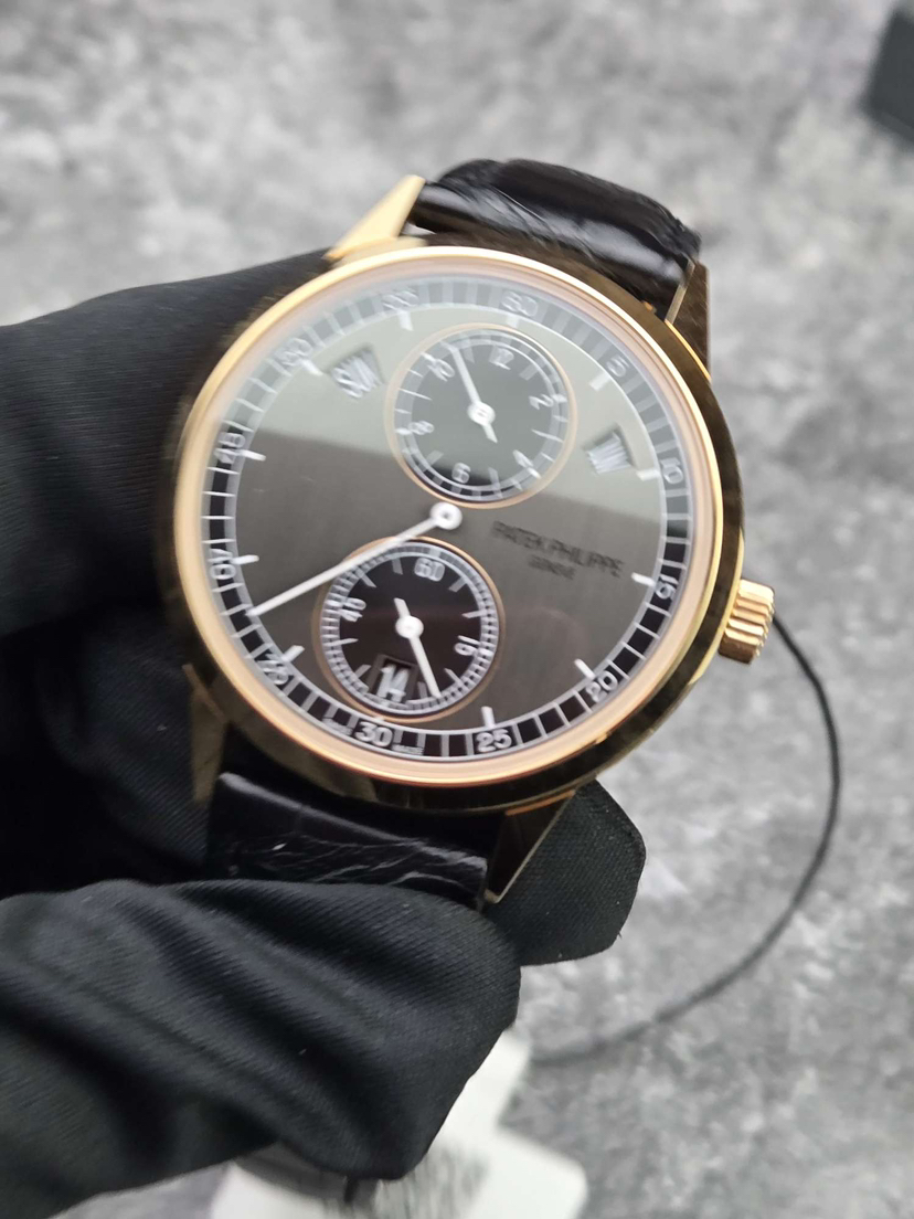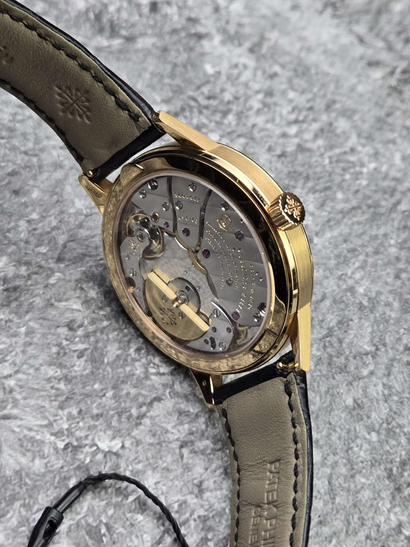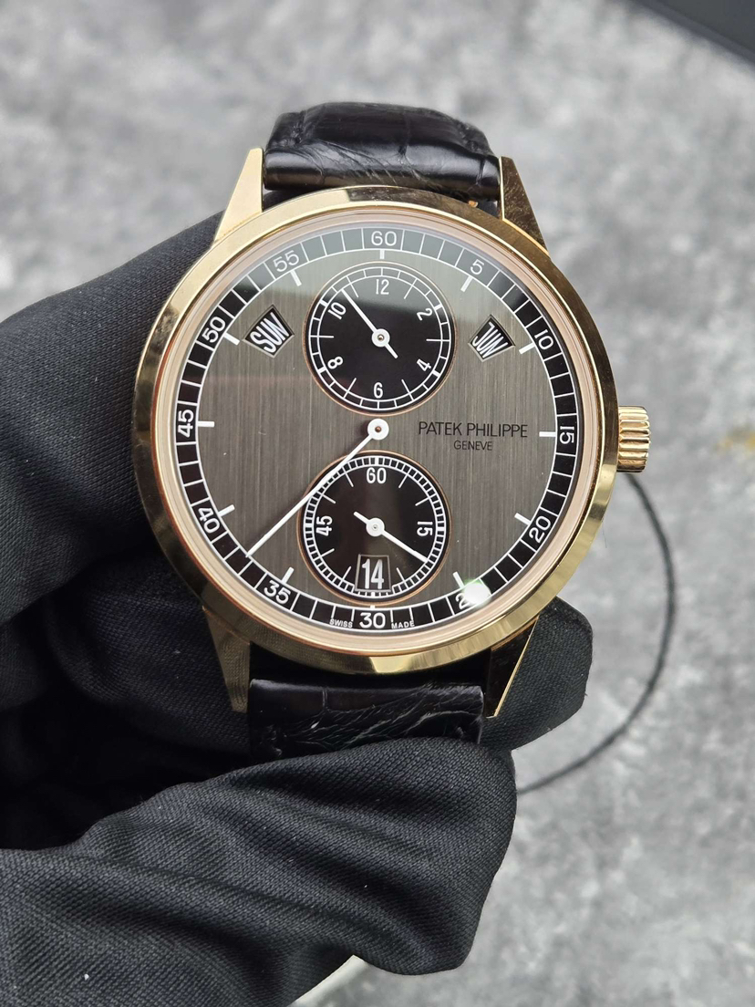 百达翡丽复杂功能时计系列5235/50R-001,18K玫瑰金材质,表径40.5mm,规范针三针一线,日期,星期,月份显示,透底自动机械,公价545700,二手现货好价